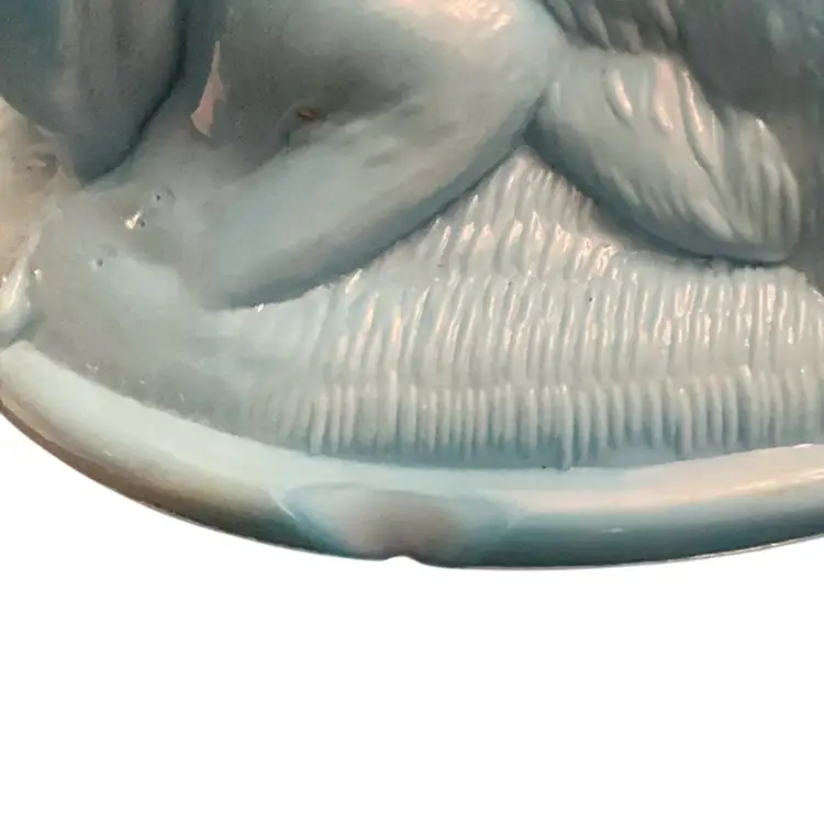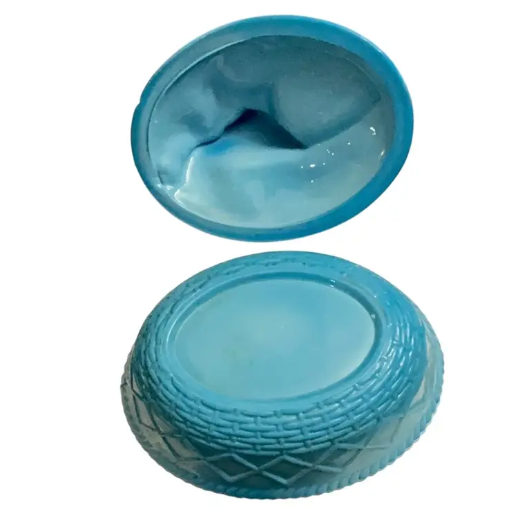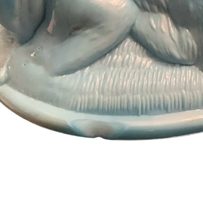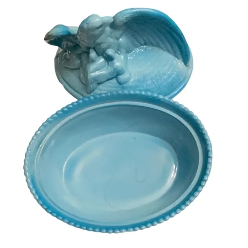 Heavy- Beautiful pale blue milk glass eagle on nest covered candy dish. Nicely detailed pressed glass eagle sits up top a diamond pattern nest. There is a small chip on the edge of the top but it does not detract from the beauty of this item.