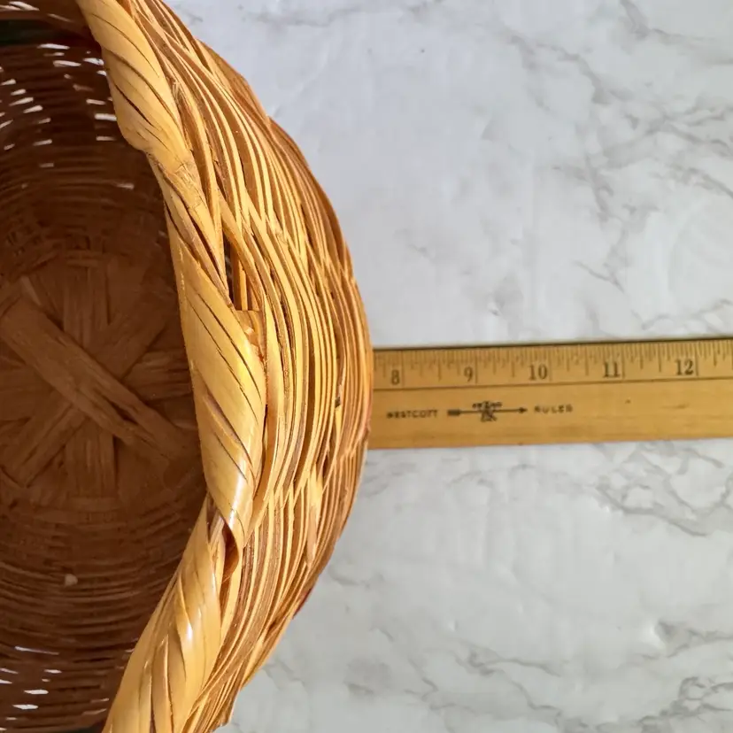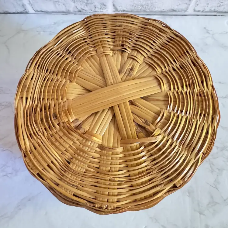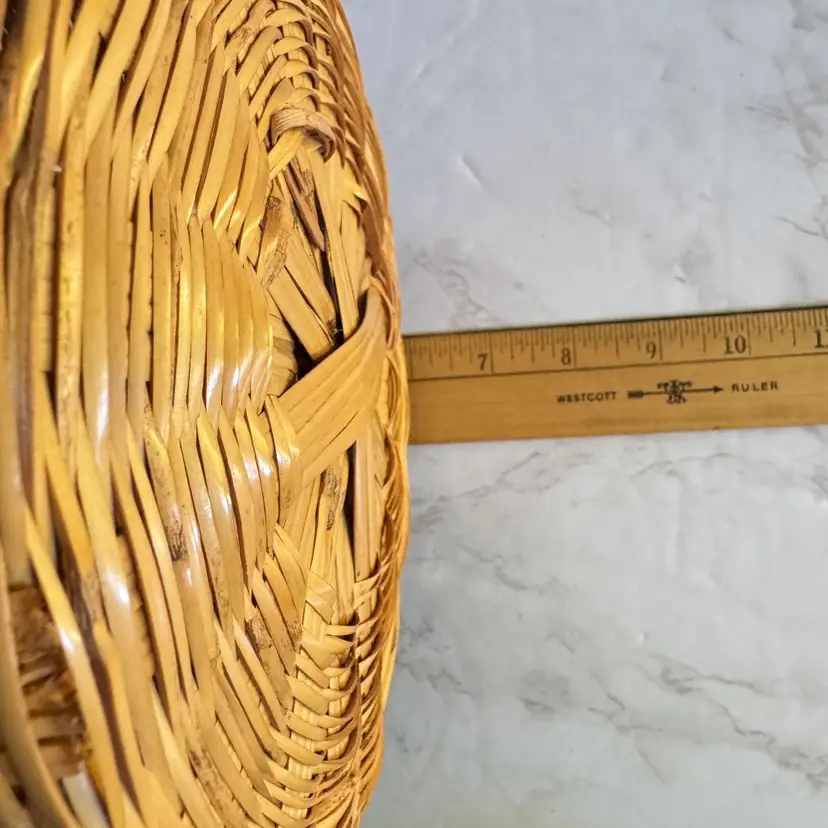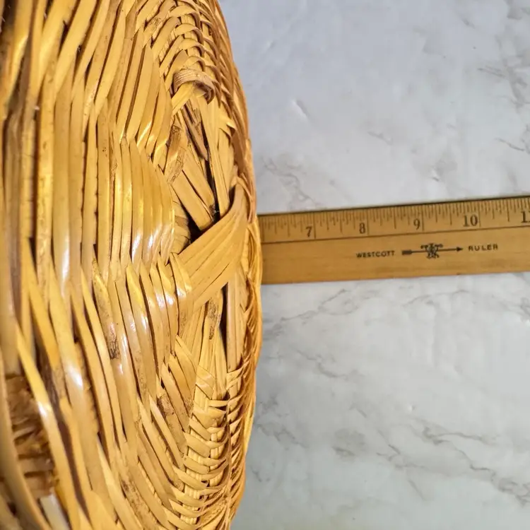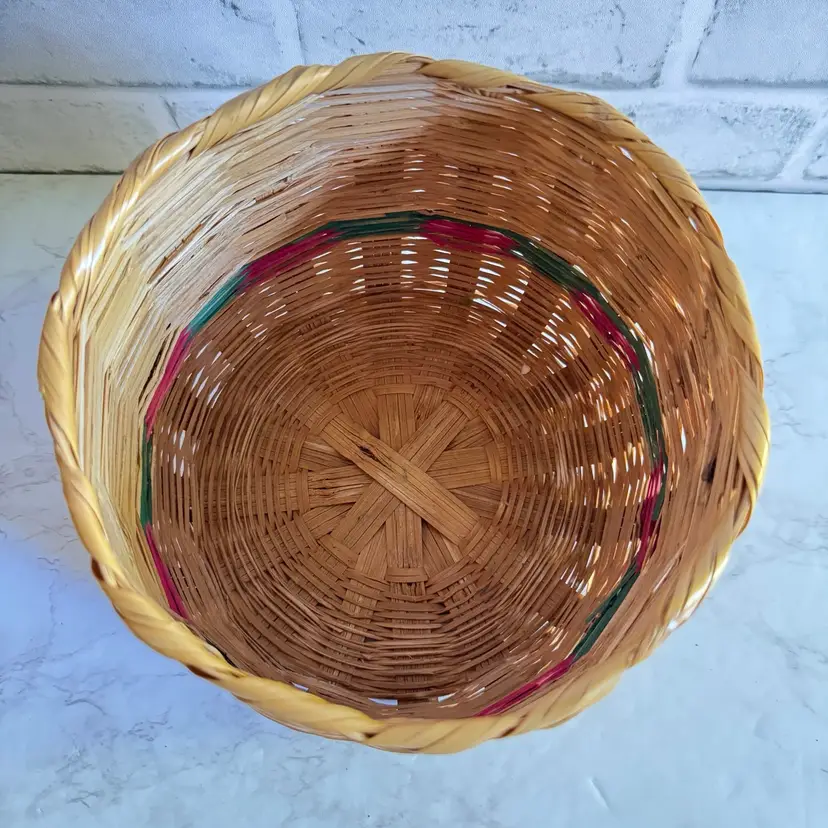 This charming vintage woven basket features a classic round shape with a colorful stripe accent (some sun fading present on the exterior, adding authentic character). Sturdy construction suitable for holding a small potted plant, fruit, towels, or as a decorative catch-all. Measures approximately 7-5/8” diameter x 6” high. Good vintage condition—no breaks, splits, or major damage; just the expected light fading from age/sun exposure. Unmarked and no known maker, likely mid-20th century. Perfect for farmhouse, boho, or rustic home decor! From a smoke-free home; ships securely packaged.