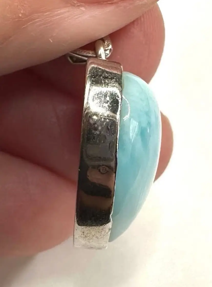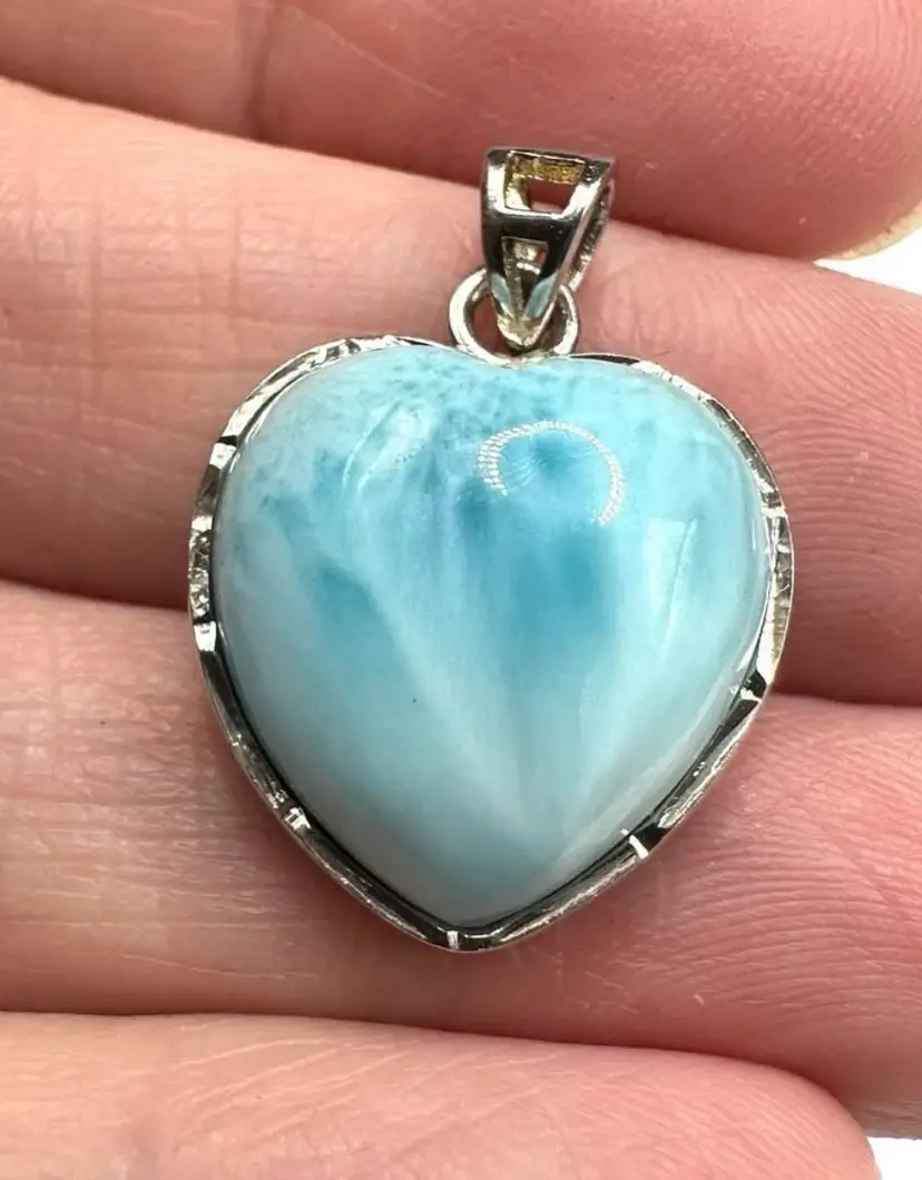 Pretty larimar domed heart shaped pendant set in sterling silver! It measures .8” long. High quality larimar with deep colors!