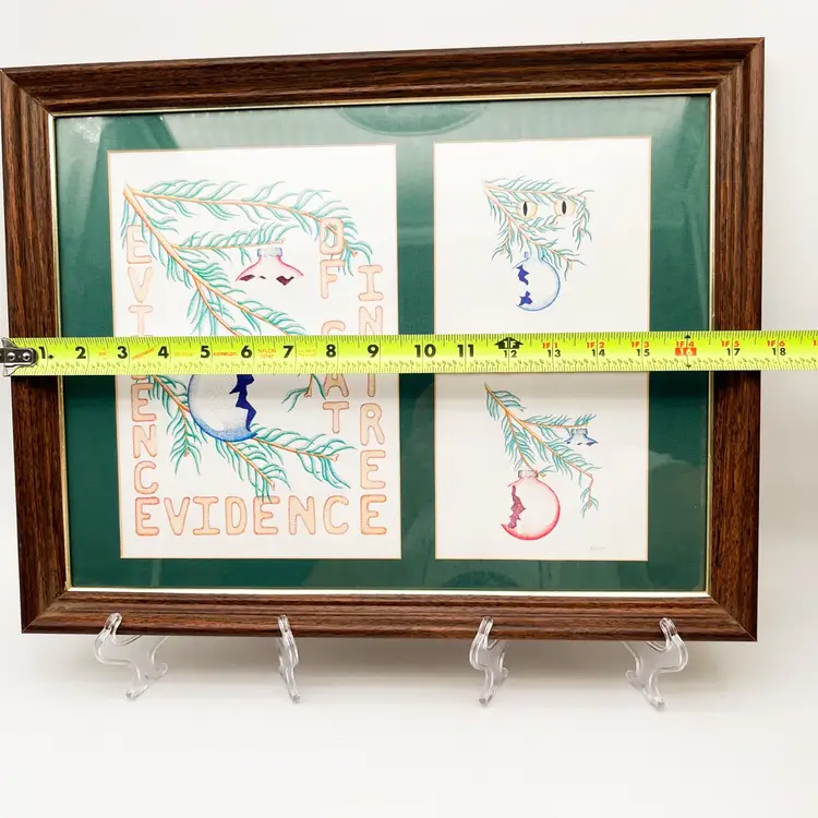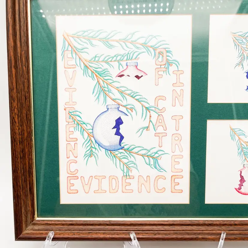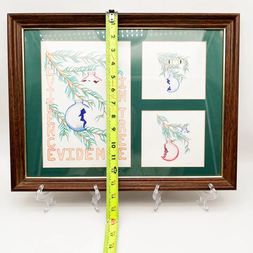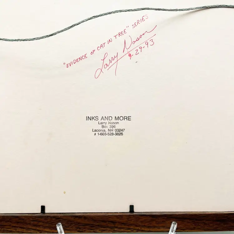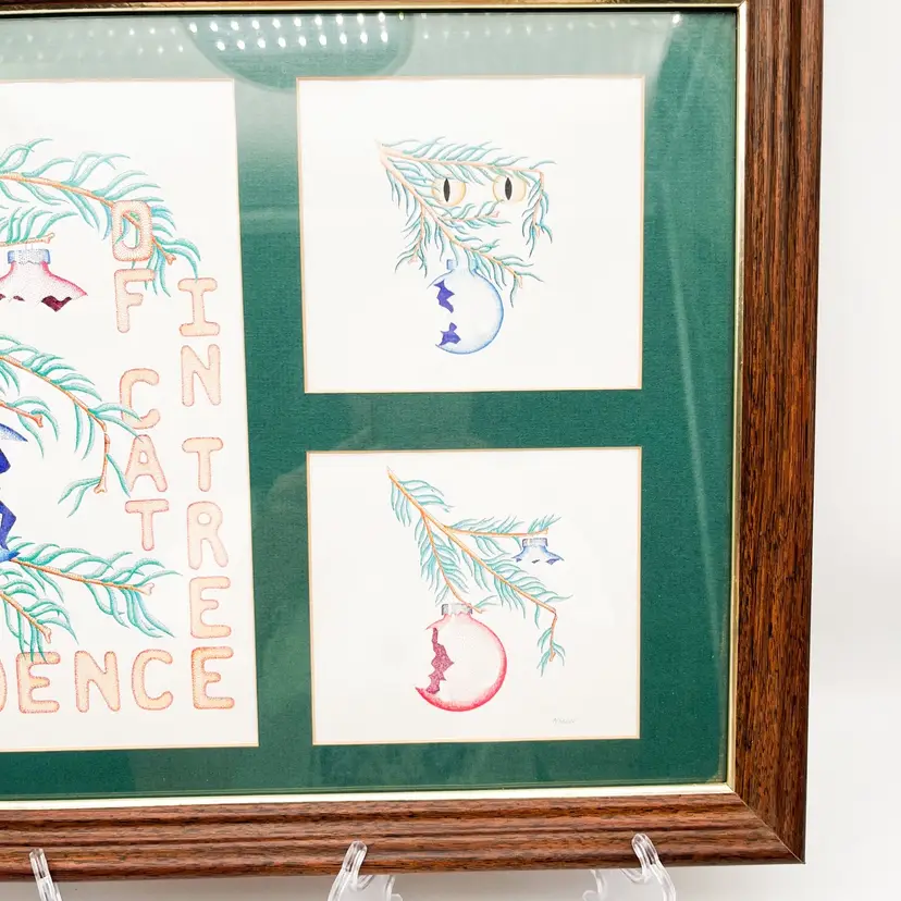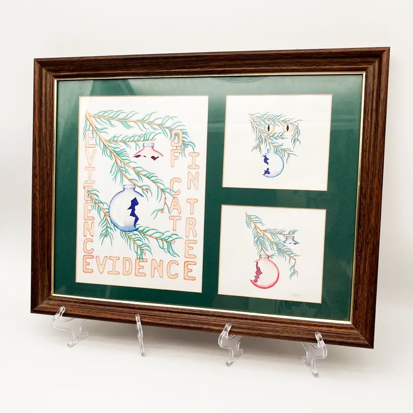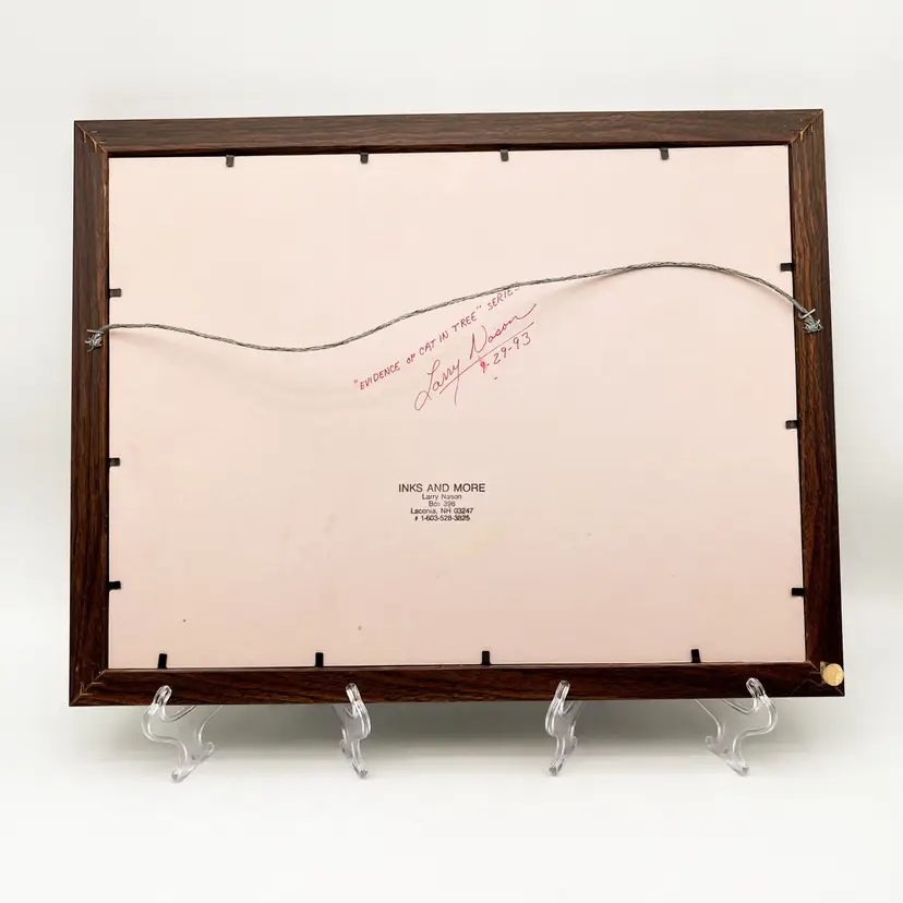Framed ink art work “Evidence of Cat in a Tree” Features 3 original ink artwork, matted and framed Artist signed on back 1993 design