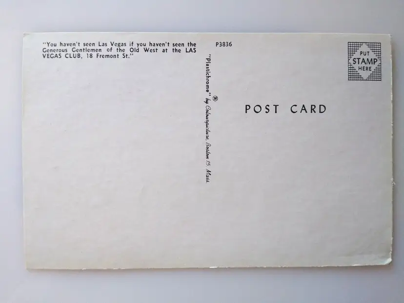 Unit of Sale: Single Unit Number of Items in Set: 1 Occasion: Any Signed: No Size: Standard (5.5 x 3.5 in) Year Manufactured: 1955 Material: Paper City: Las Vegas Original/Licensed Reprint: Original Brand/Publisher: Colourpicture Subject: Casino Type: Printed (Lithograph) Continent: North America Era: Photochrome (1939-Now) Country: United States Region: Nevada Theme: Cities & Towns, Cowboys & Western, Hotel & Restaurant, Tourism, Casino, History, Slot Machines, Table Games, Gambling Hall, Saloon, One Arm Bandit Features: Chrome Time Period Manufactured: 1950-1959 Country/Region of Manufacture: United States Postage Condition: Unposted