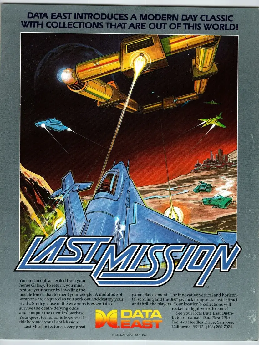 Brand: Data East Year: 1986 Game Title: Last Mission Original/Reproduction: Original Theme: Retro Gaming Country/Region of Manufacture: United States Modified Item: No Arcade: Flyer