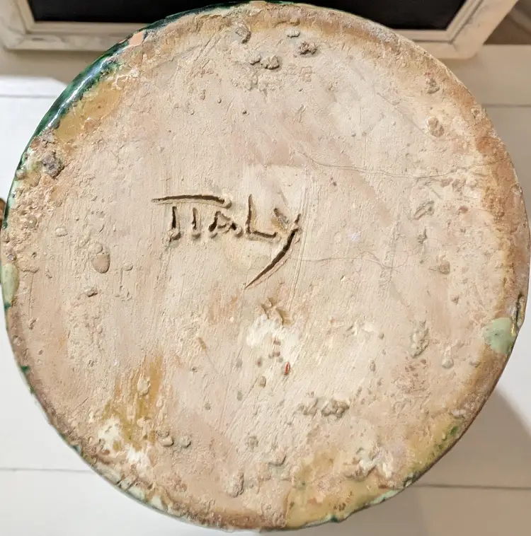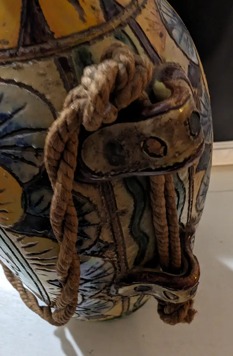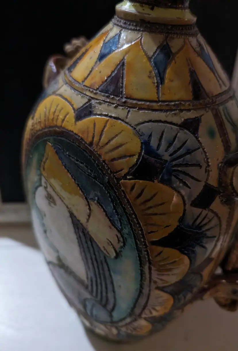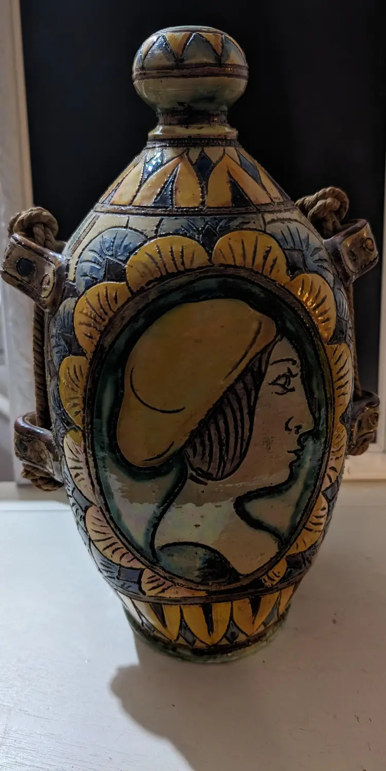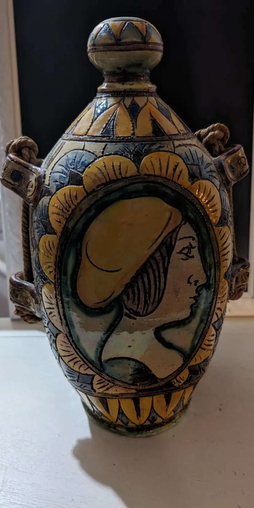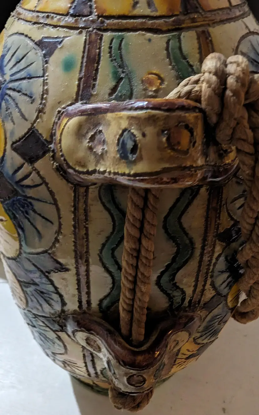 Beautiful Hand etched Renaissance design Italy piece of pottery. Piece is used but is in Amazing shape with no cracks or chips and very minimal signs of wear and tare with some flea bites on bottom rim and 1 top rim. Beautiful multi color piece with yellow, blue green and brown color with a nice glaze finishing. This piece is approximately 13 inches height with a 9 inch length and 5 inch width and weights 3.4 lbs. Beautiful hand painted piece with rope handle that is attached to both sides of piece by hand made pottery straps. Very nice looking and eye catching piece that is marked Italy on bottom.