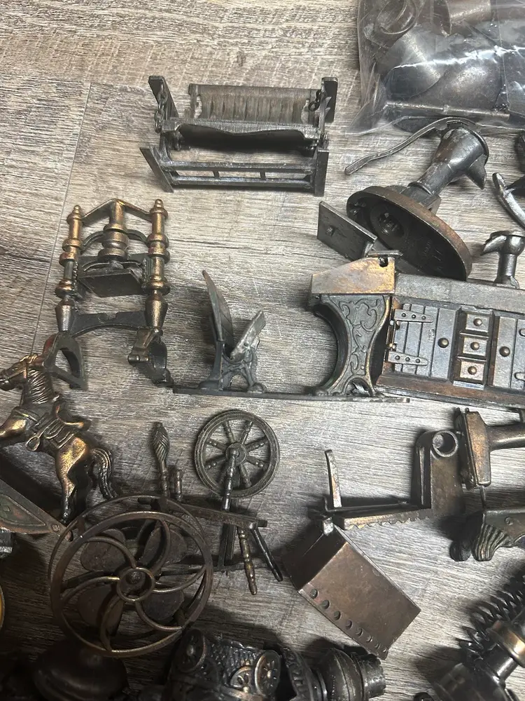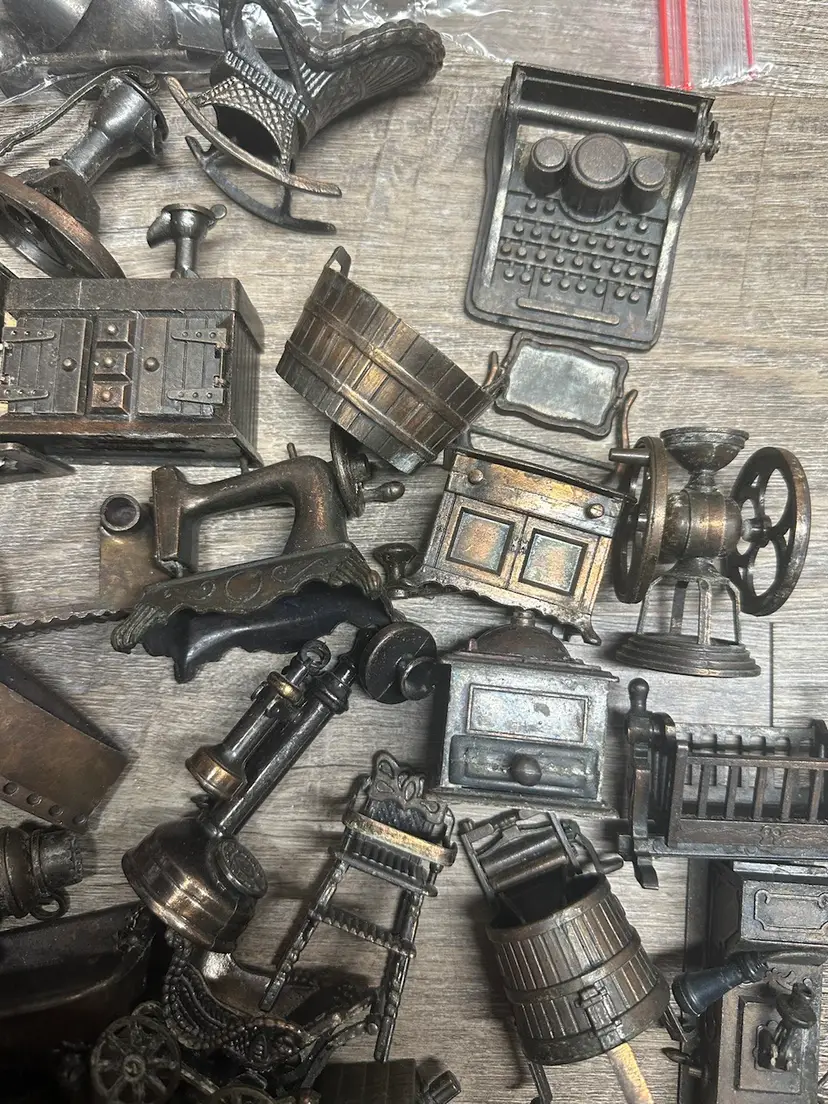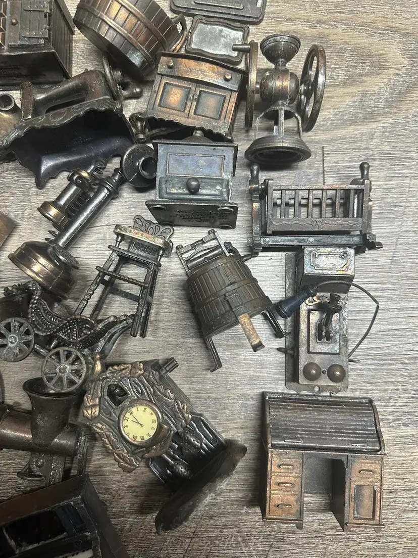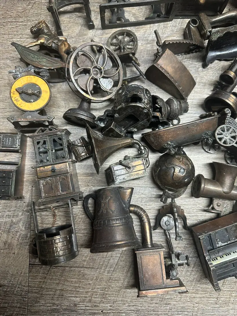 As stated in video, some could use a cleaning to really shine. There are full pieces and other parts. Some are even pencil sharpeners, no duplicate items. 7lbs. Had to cut video to fit, if more photos are needed just ask.