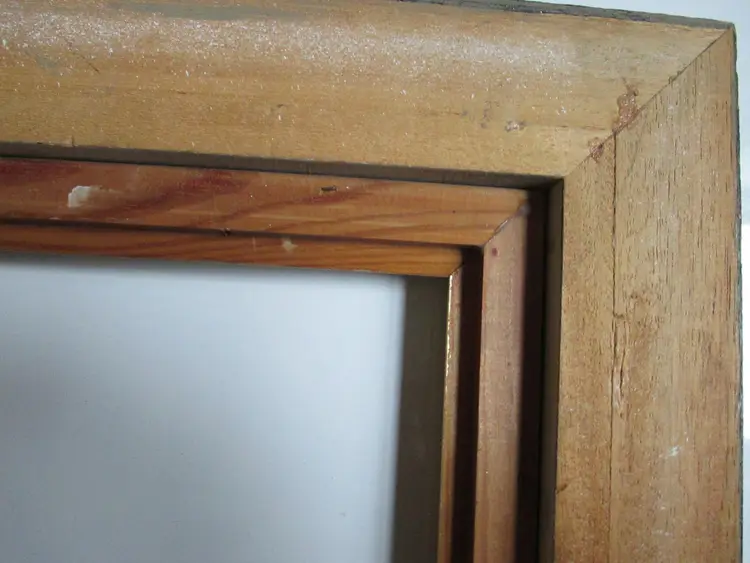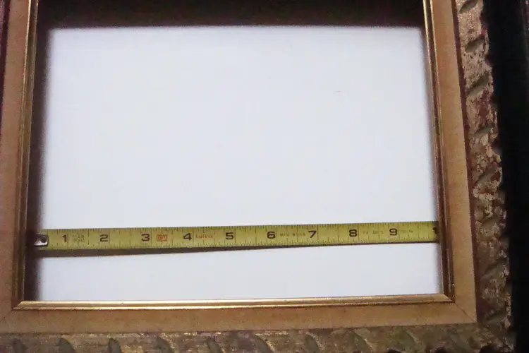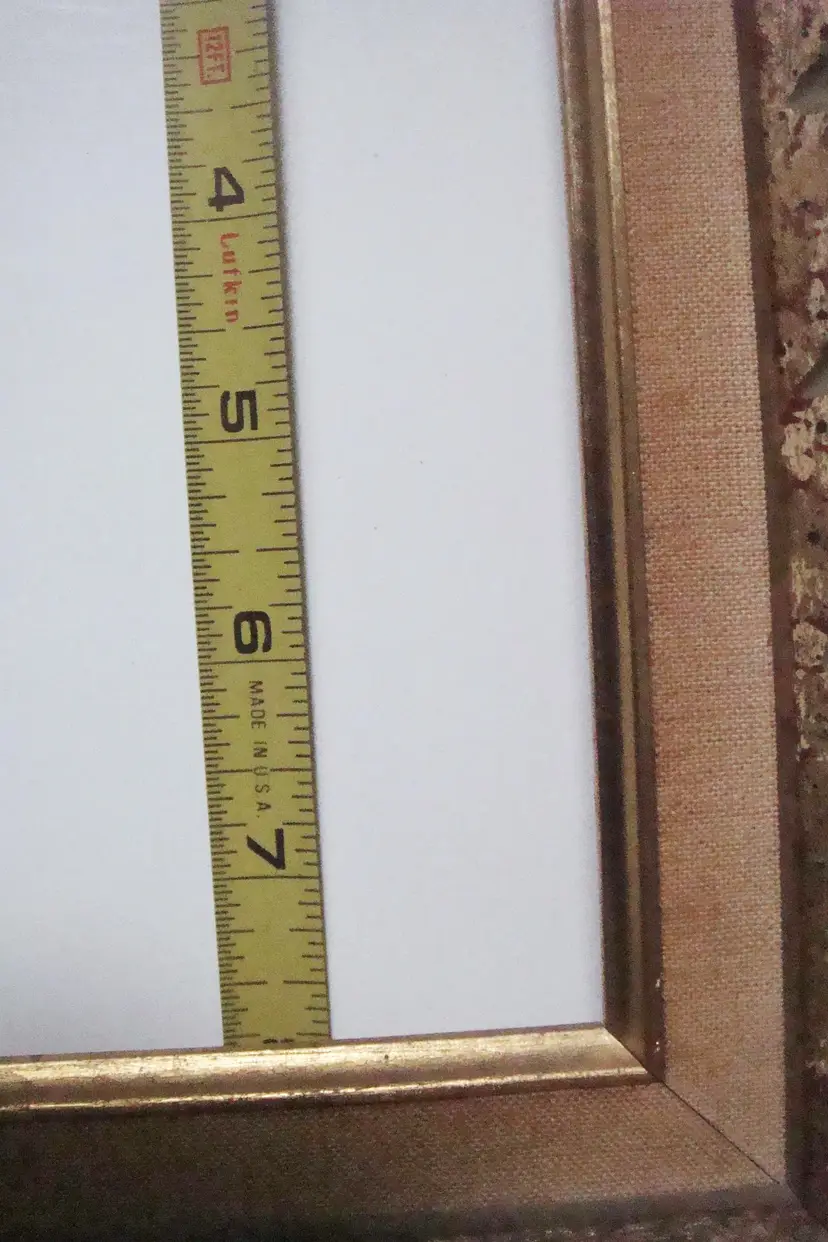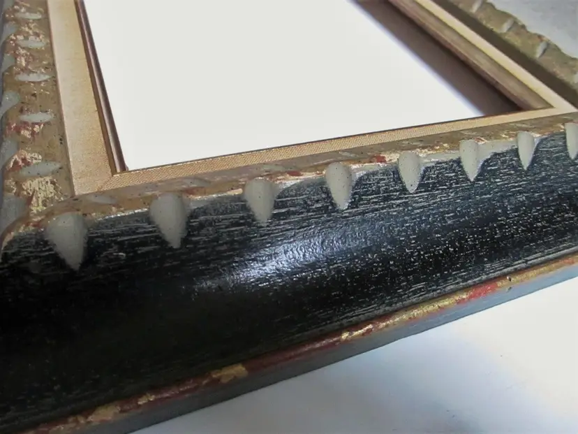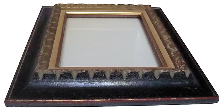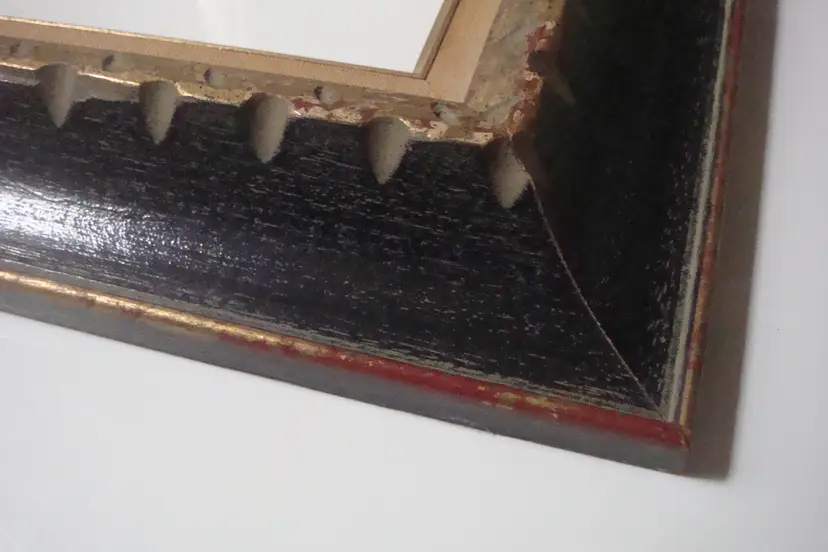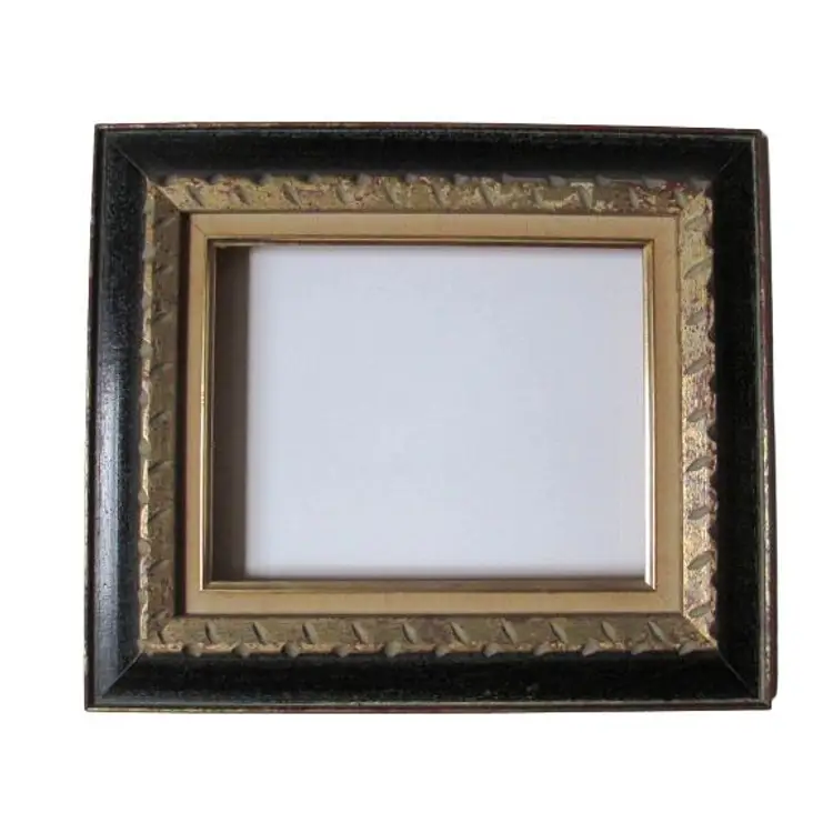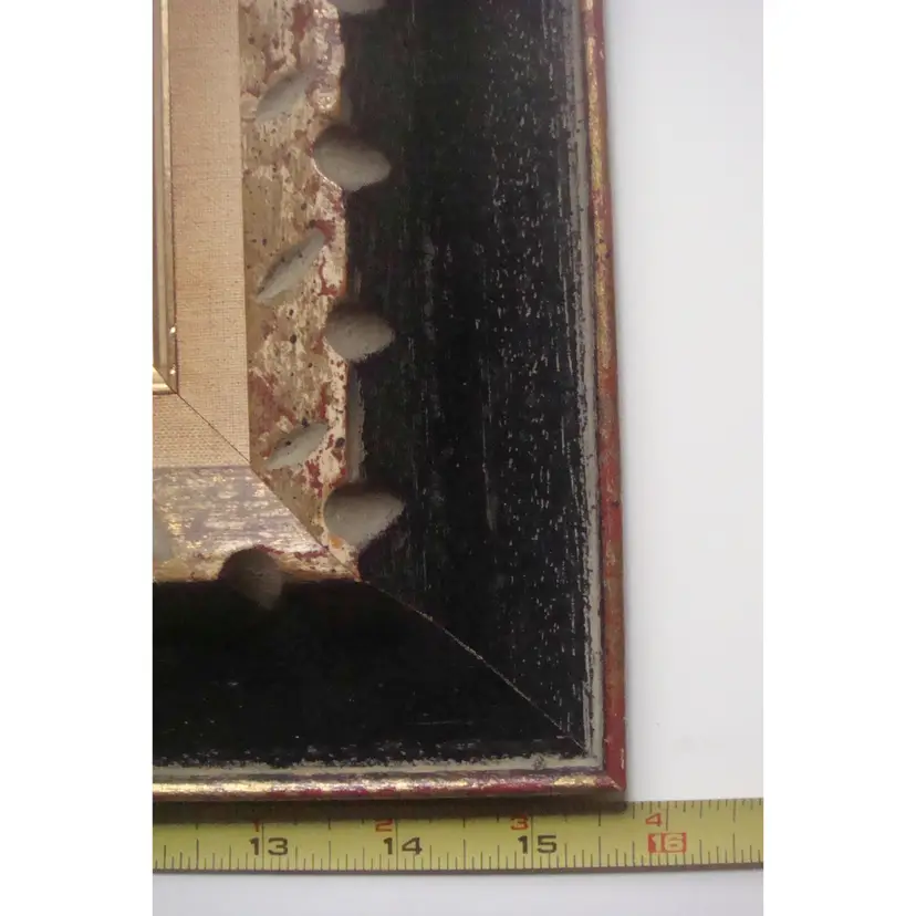 A lovely frame for small paintings or artwork, can hang horizontally or vertically. Primary colors: Distressed black, distressed gold w/red accent. Solid construction. Some discoloration to interior frame material. (please see photos) Size: 15.5" x 13.5" x 1.5" Inside opening: 7.5" x 9.5" Double frame: 1" innner (removable) & 2" outer frame.