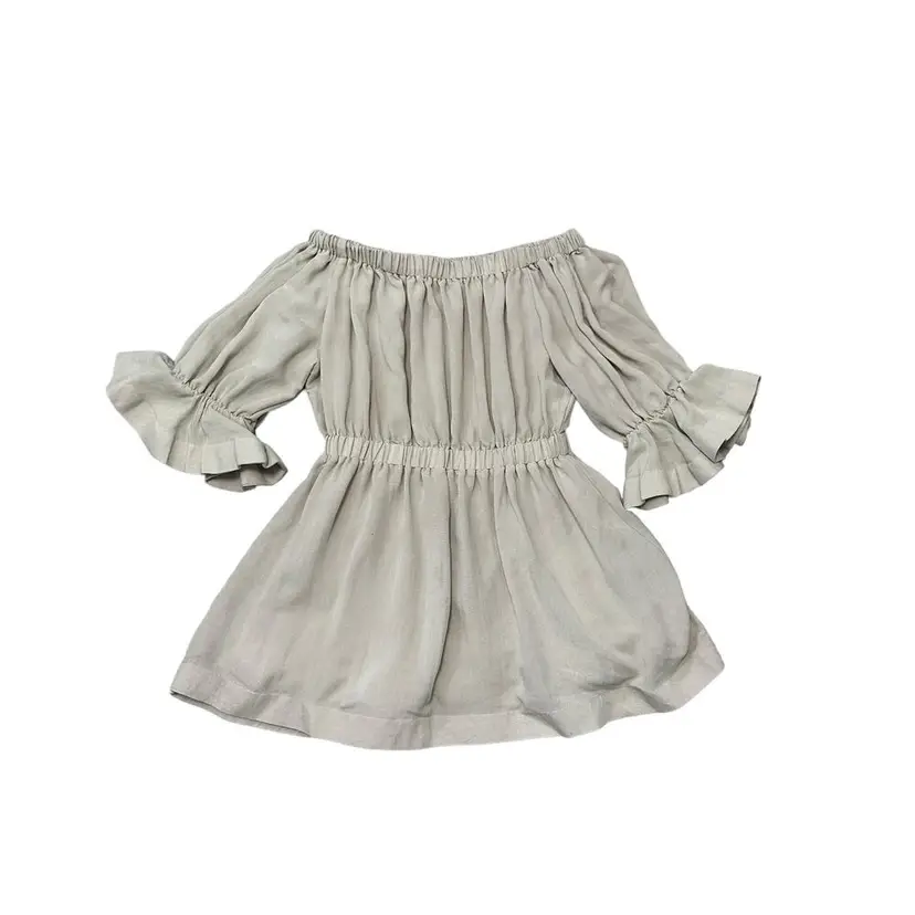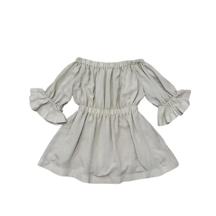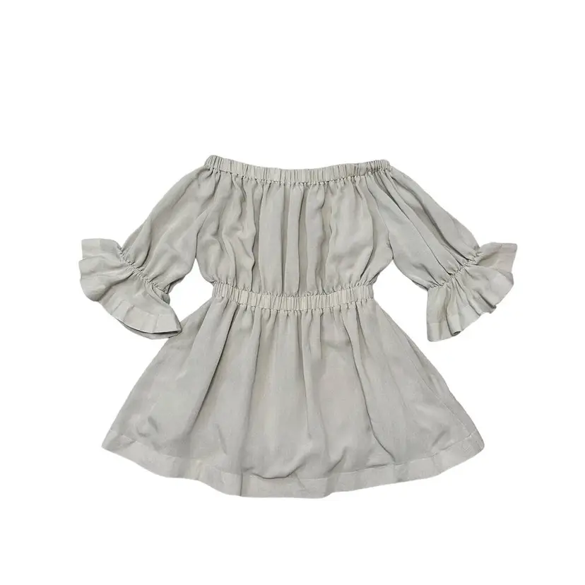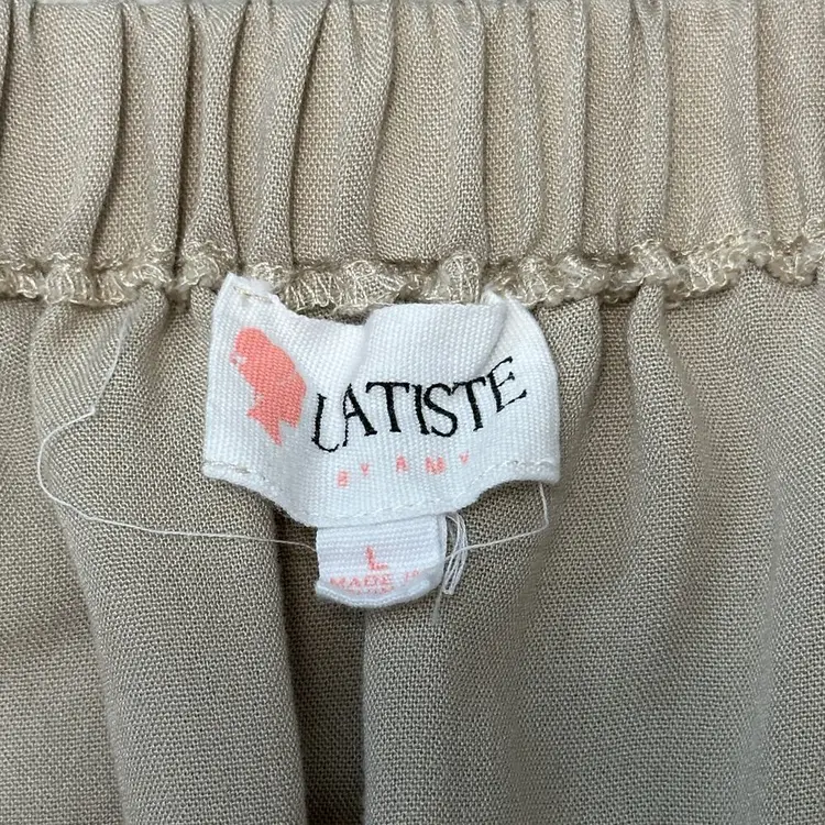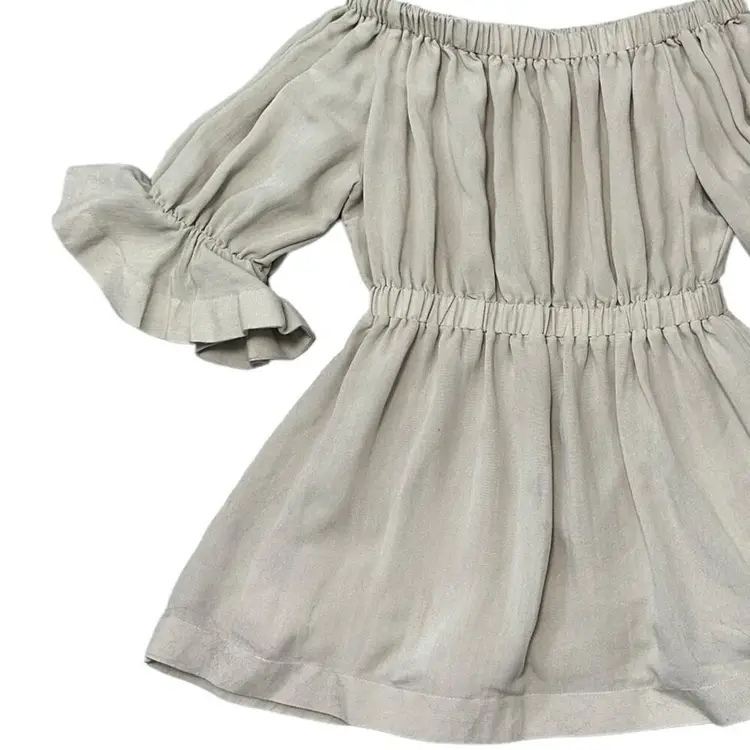 L’atiste by Amy Tan Scoop Neck Short Dress Ruffle Sleeve Size Large Natural tone light tan Elastic scoop neck, elastic and ruffled sleeves 3/4, elastic waist, short length Boho, Boho Chic, Festival, Summer, Vacation Elegant cute dress casual or daytime party
