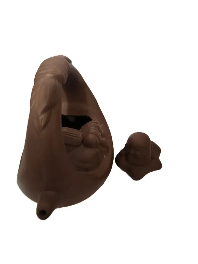 This 27.5-oz Laughing Buddha Yixing Teapot was hand made in Yixing China using the famous purple clay, zisha clay, that is said to only occur in the Yellow Dragon Cave of Dingshan town in Yixing, China. This is a great piece and shows wonderful artistry. It is in great condition.