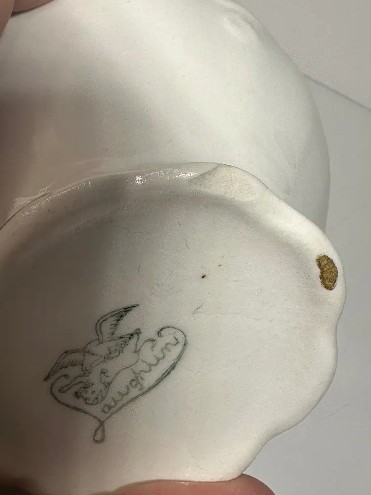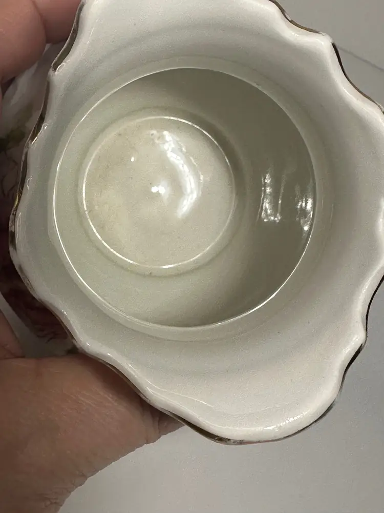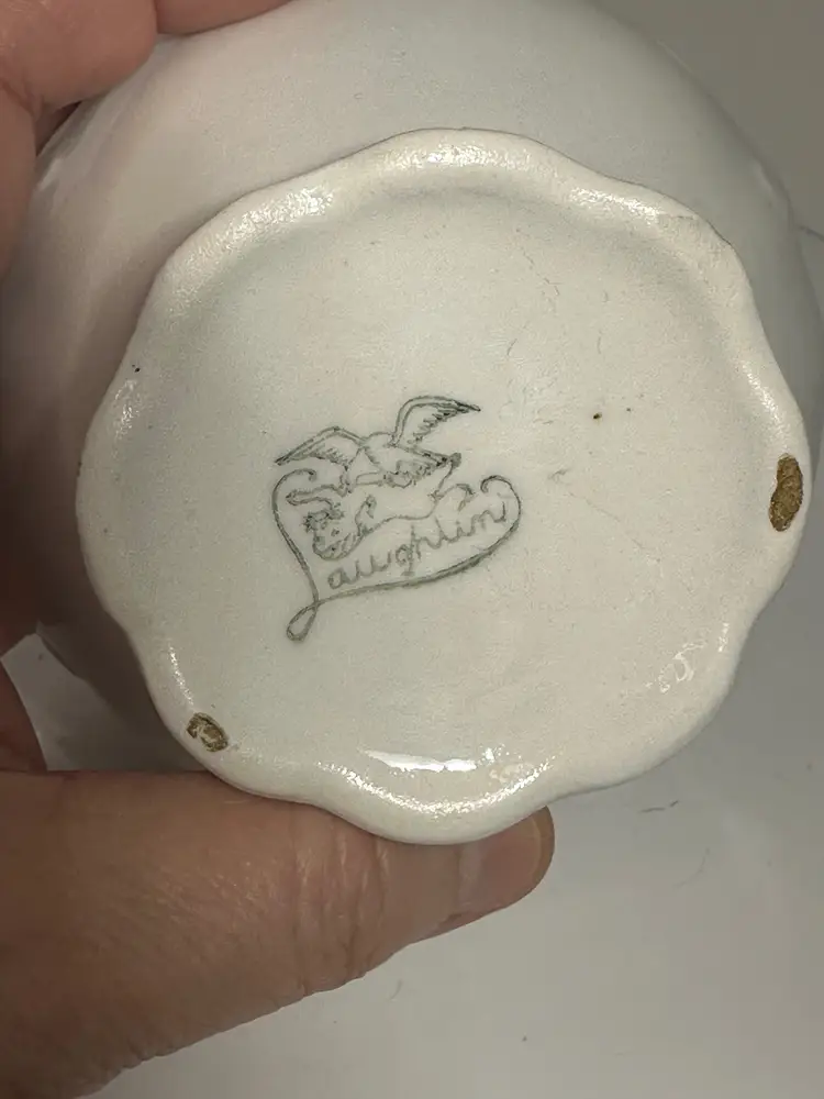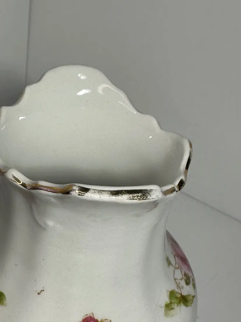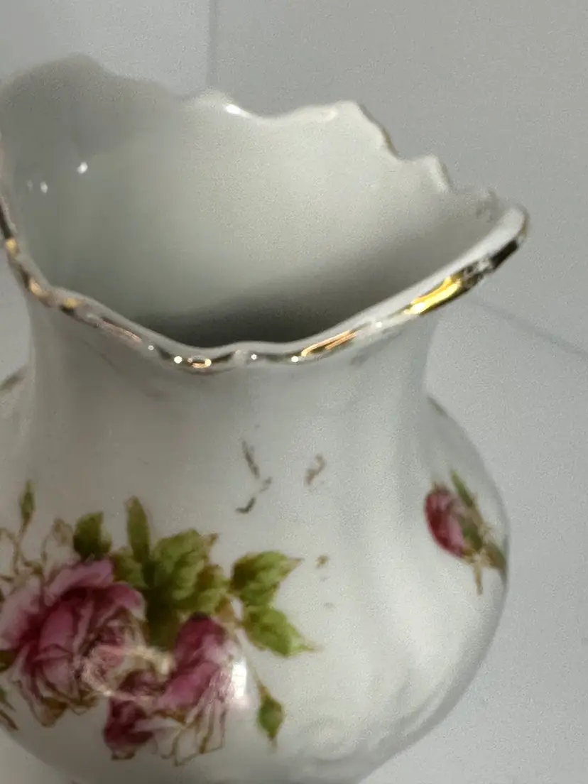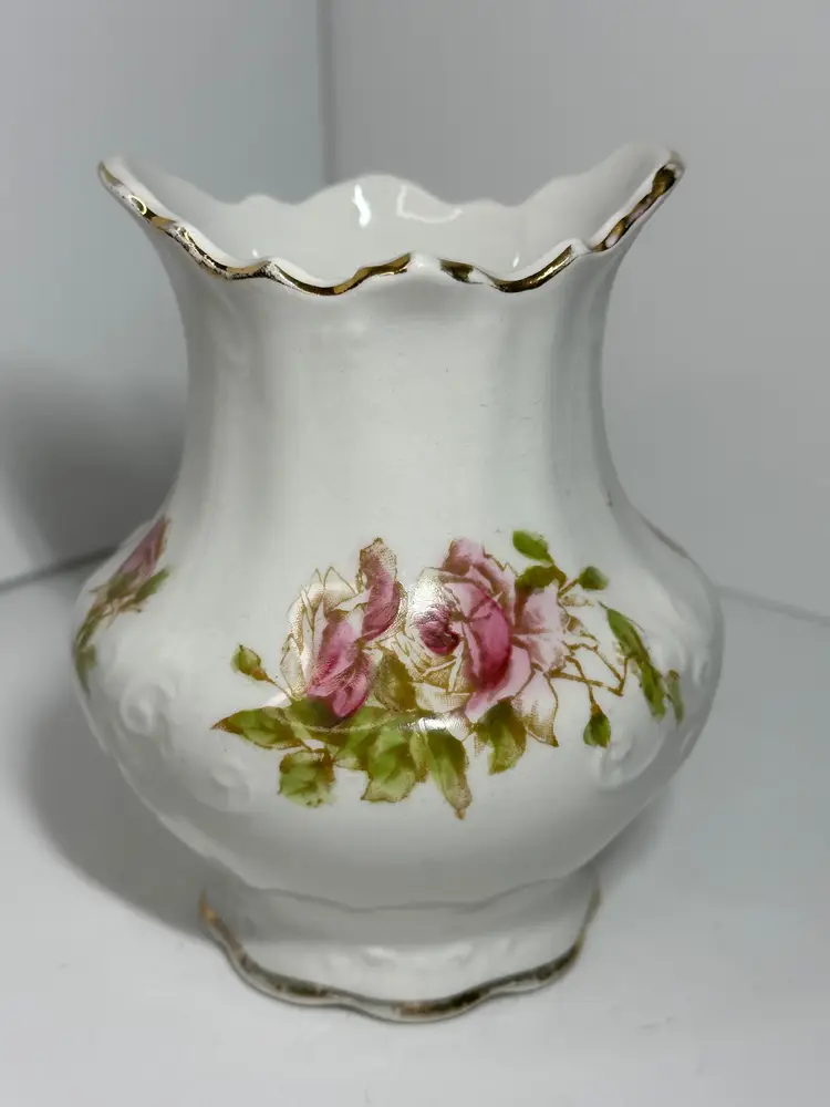 This vase was made between 1894 and 1905. There is a small flake on the bottom that can only be seen when holding it upside down. The vase measures 4.75 inches high. There is some wear to the gold around the top