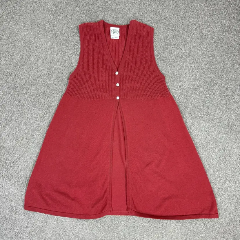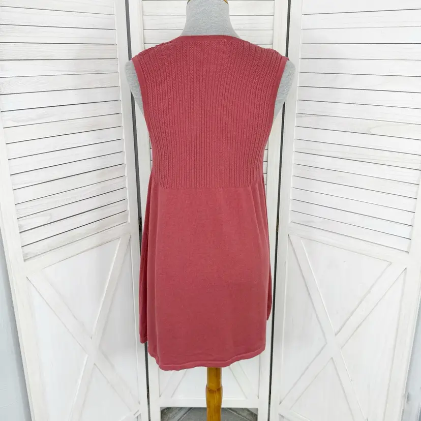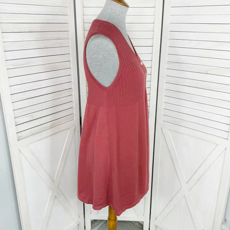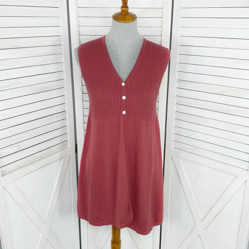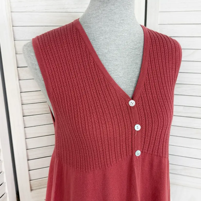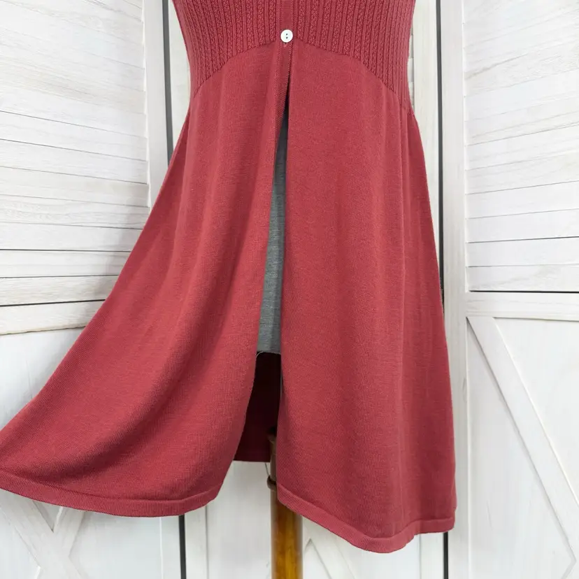 Dark dusty rose rust Cable knit top tight smooth knit bottom Sleeveless V neck 3 button upper Open front lower 100% cotton Tunic length
