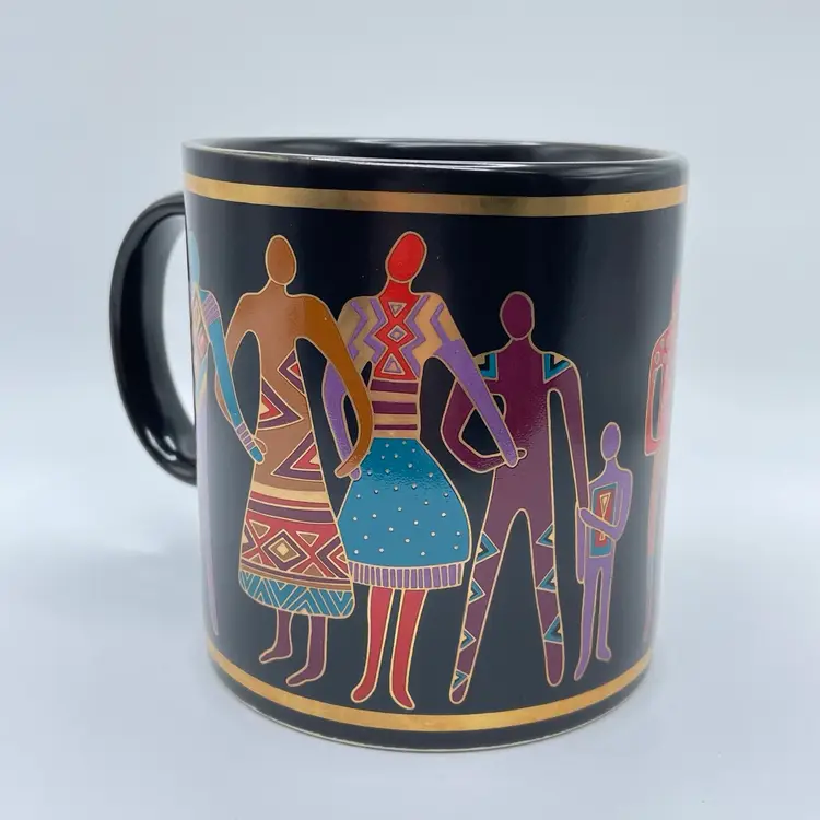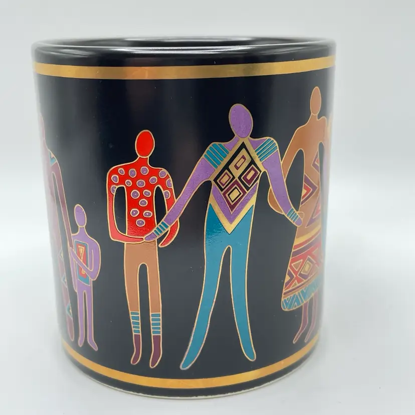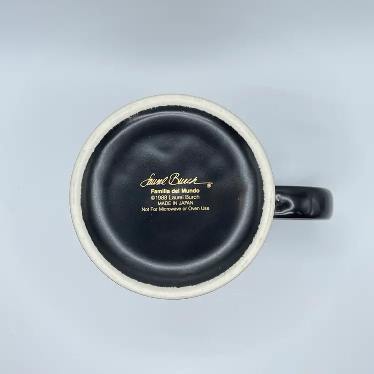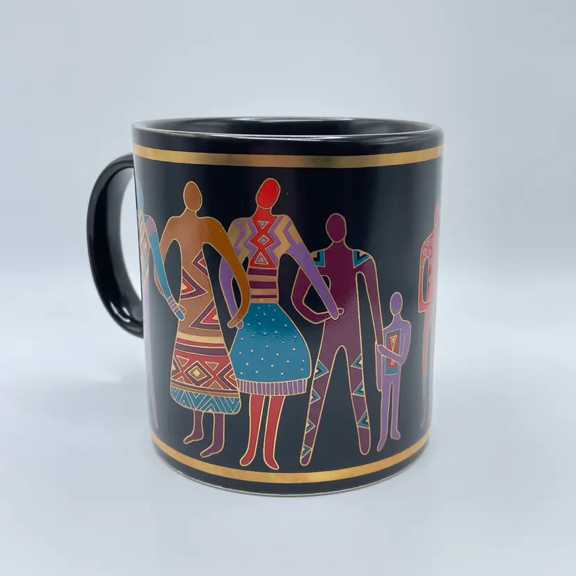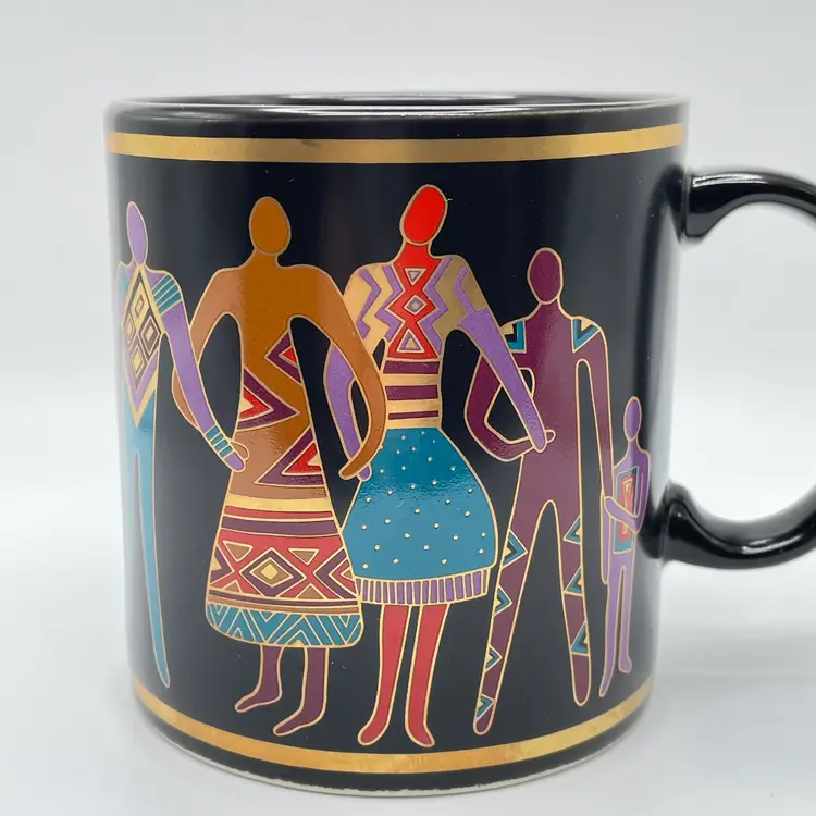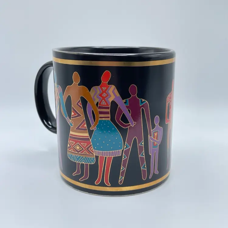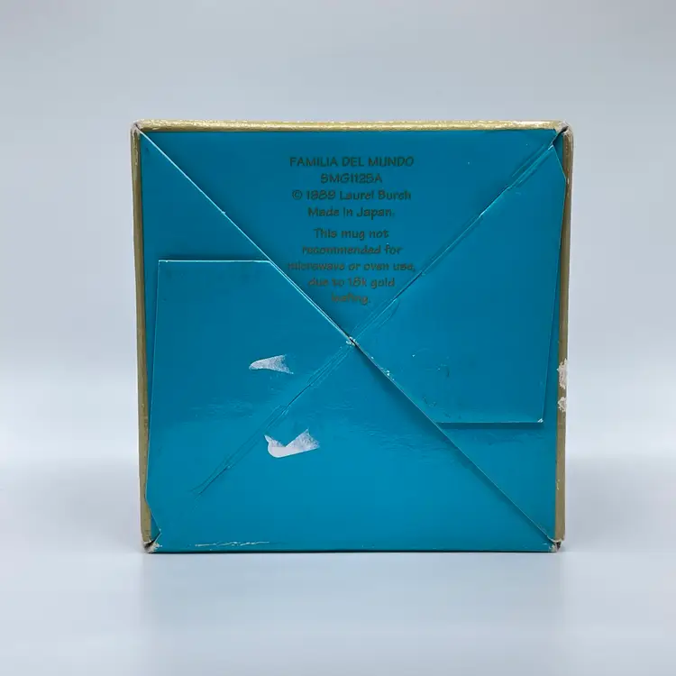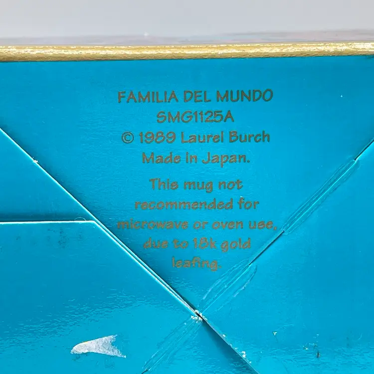 This is a vintage 1989 Laurel Burch mug with box titled "Familia Del Mundo." The design depicts colorful silhouettes trimmed with 18K gold leaf. Signed Laurel Burch. Not microwave or dishwasher safe due to gold leaf. Measures approximately 4" tall x 3” across, and holds approximately 12fl oz. No chips or crack, but the box has a flaw as shown in pictures. #237