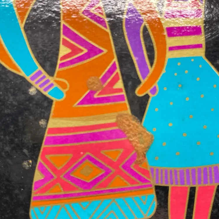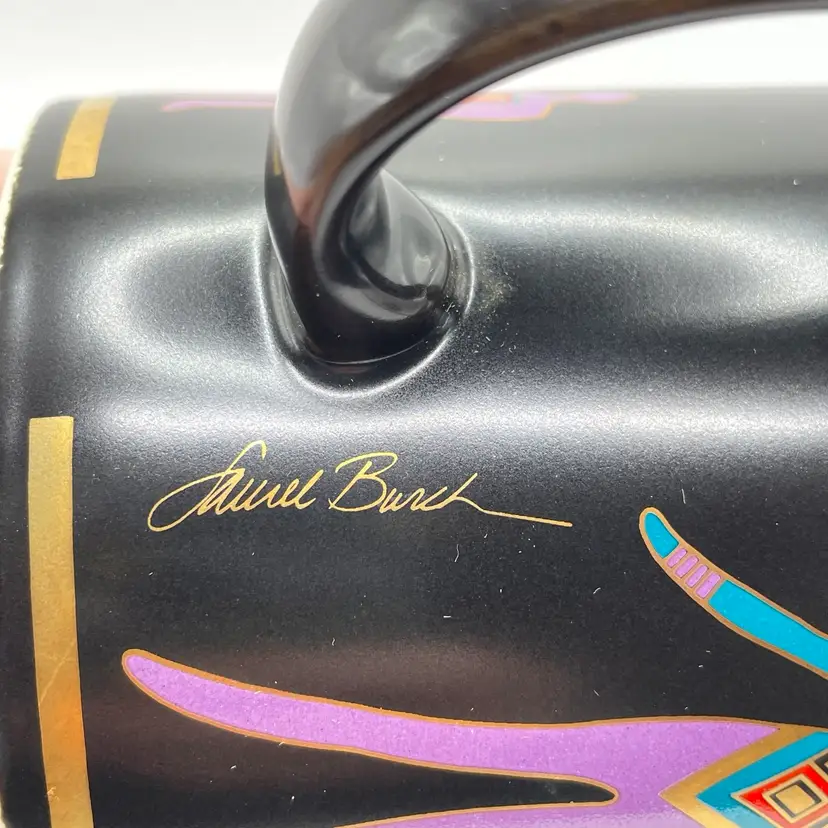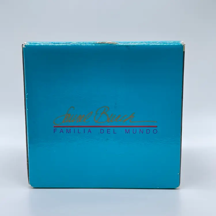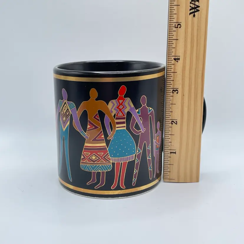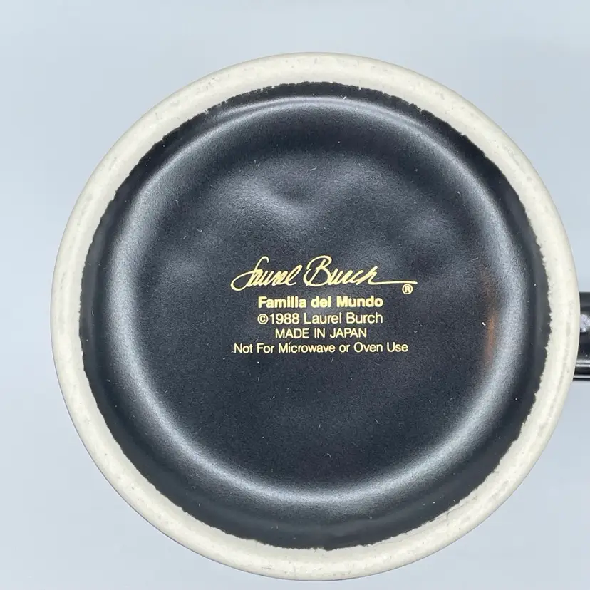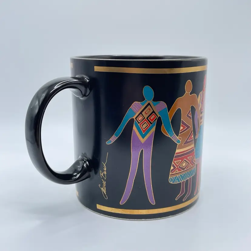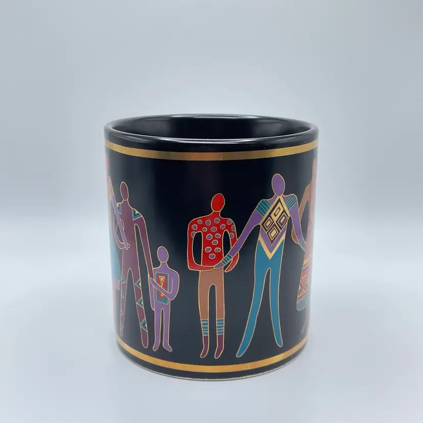 This is a vintage 1989 Laurel Burch mug with box titled "Familia Del Mundo." The design depicts colorful silhouettes trimmed with 18K gold leaf. Signed Laurel Burch. Not microwave or dishwasher safe due to gold leaf. Measures approximately 4" tall x 3” across, and holds approximately 12fl oz. No chips or crack, but the box has a flaw as shown in pictures. #237