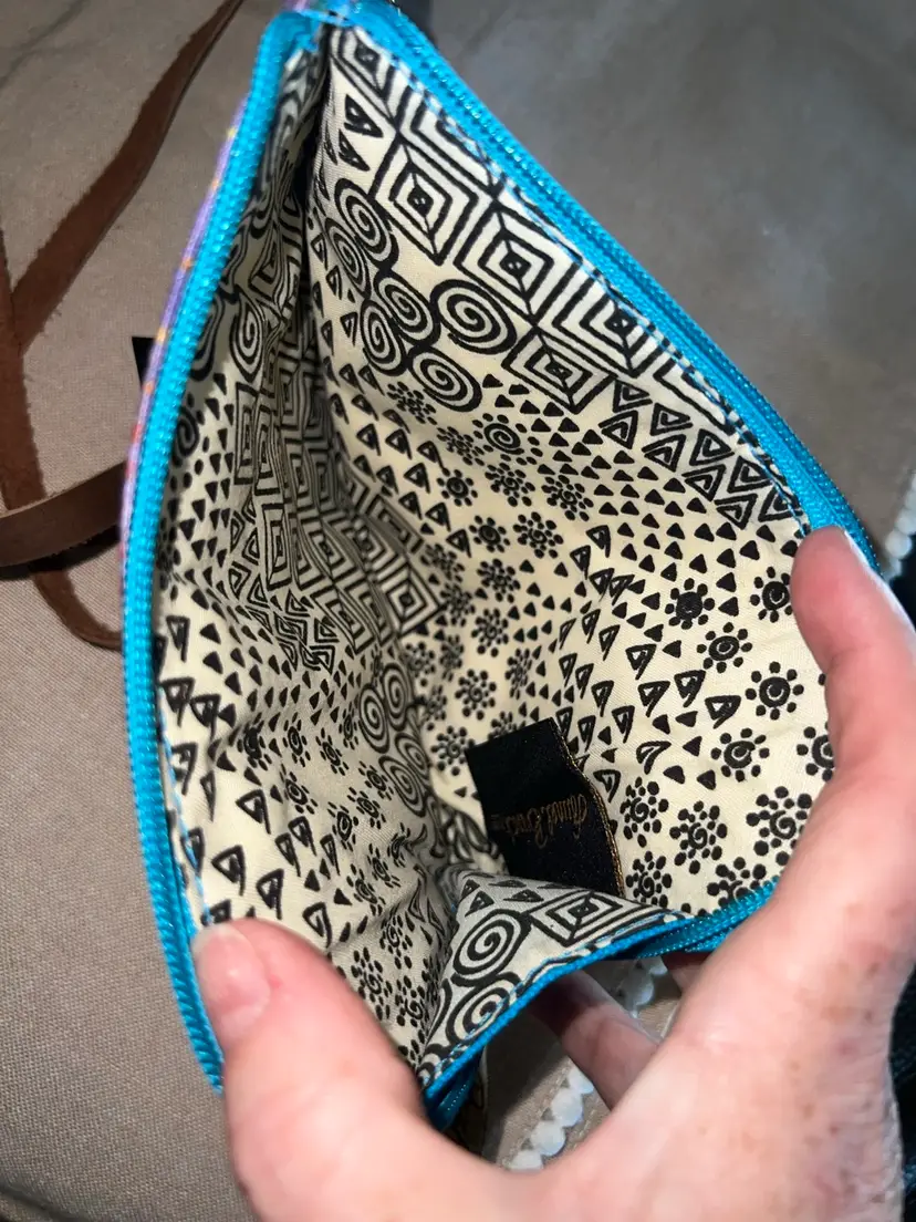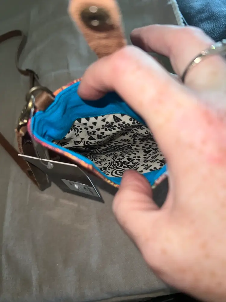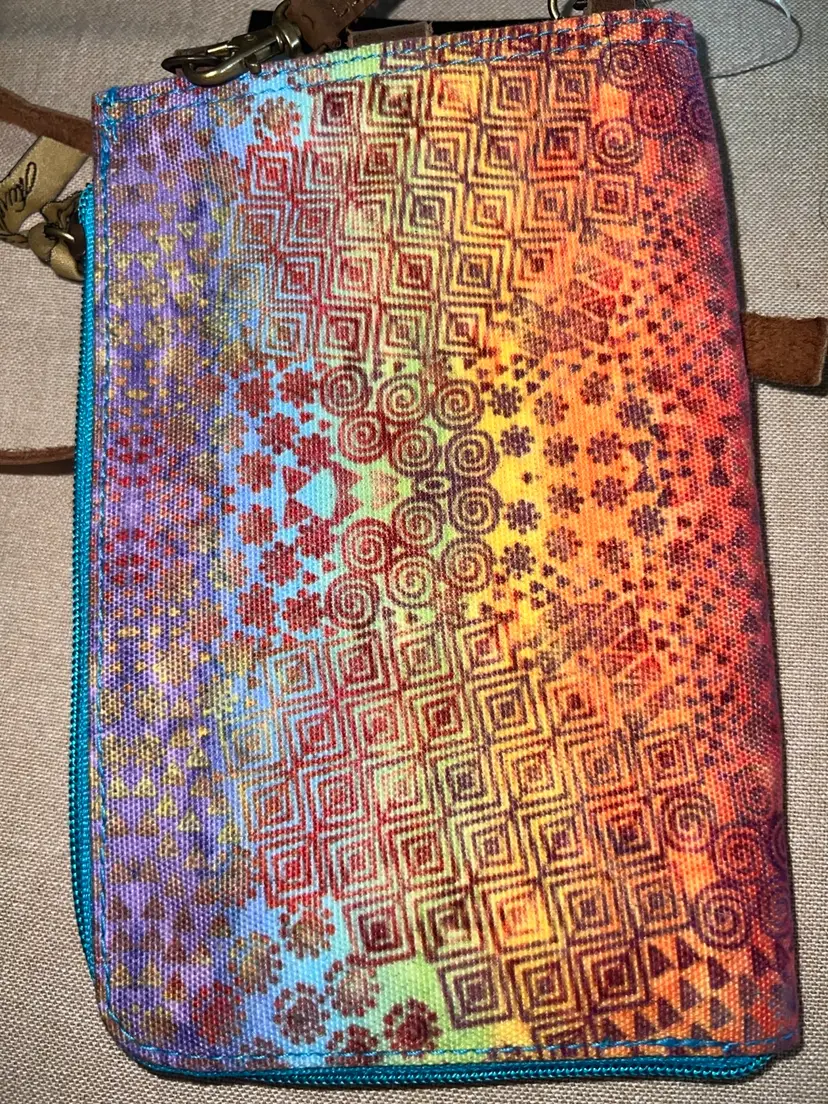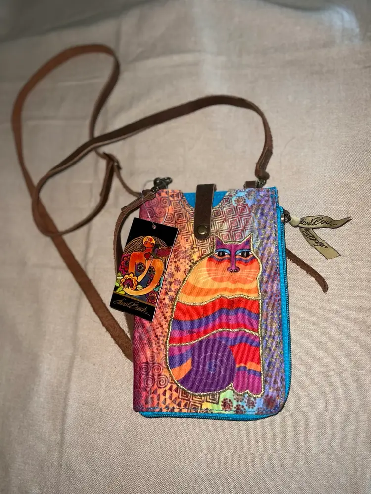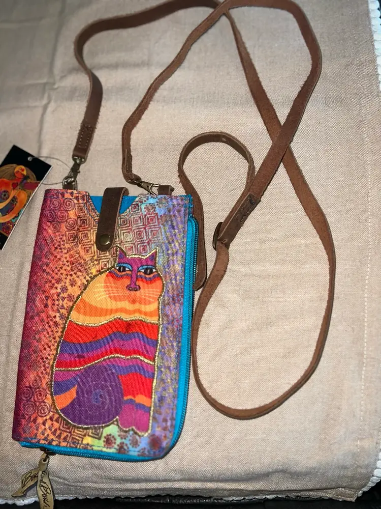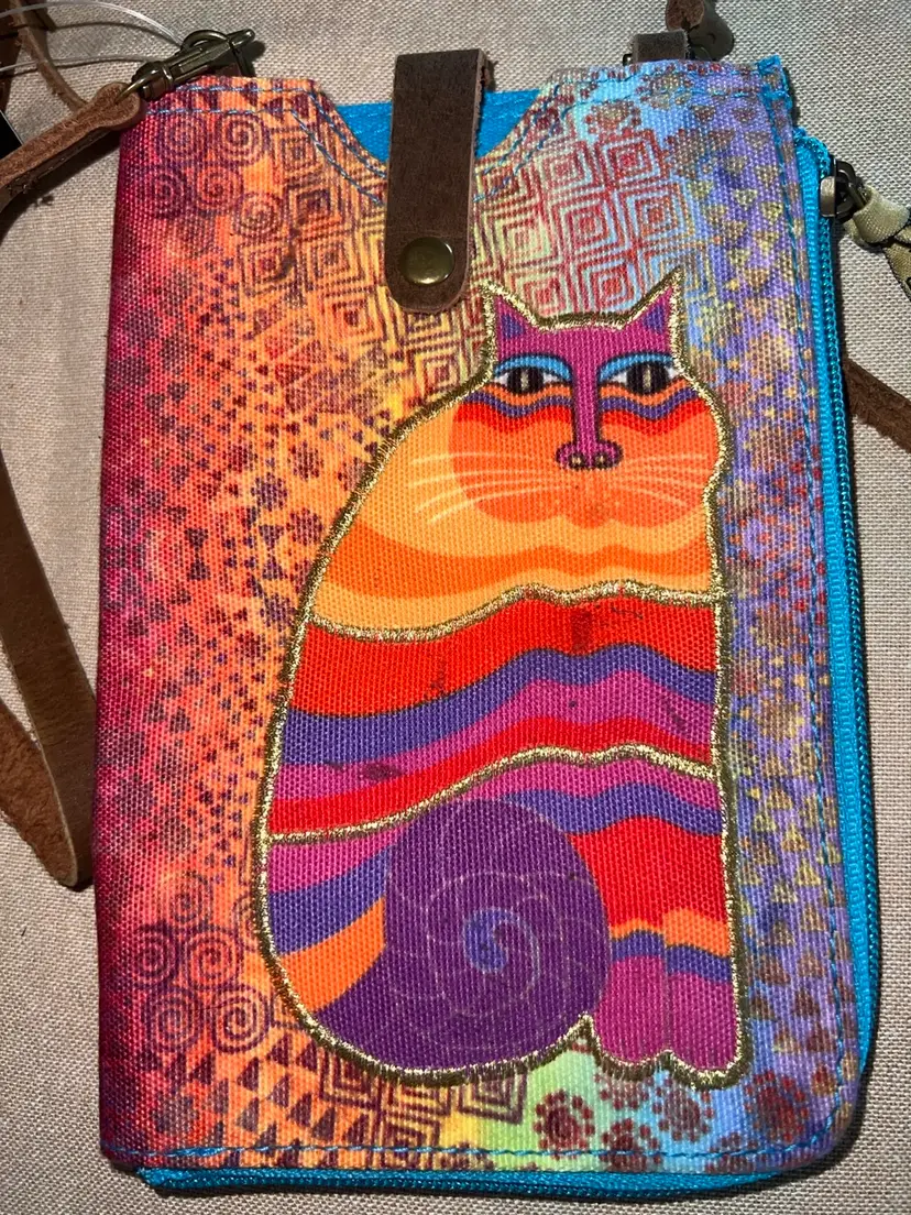 Such a fun crossbody with bright colors and a cat to add to any fit! This crossbody purse measures approximately 7.5" in height and 5" in width. It has an open pocket as well as a zip around pocket. The leather strap is adjustable. Cell phone pocket with snap closure Sueded trim and strap 100% cotton canvas