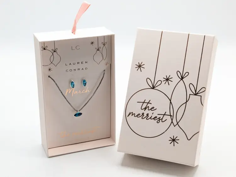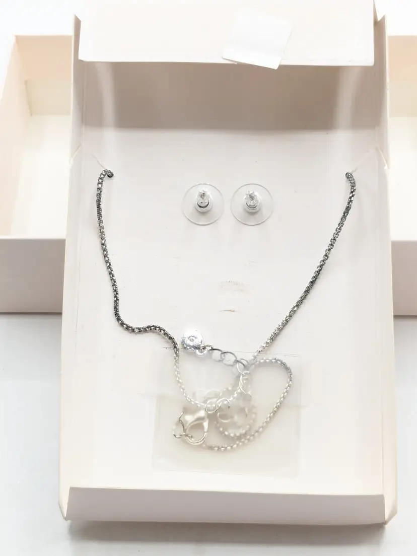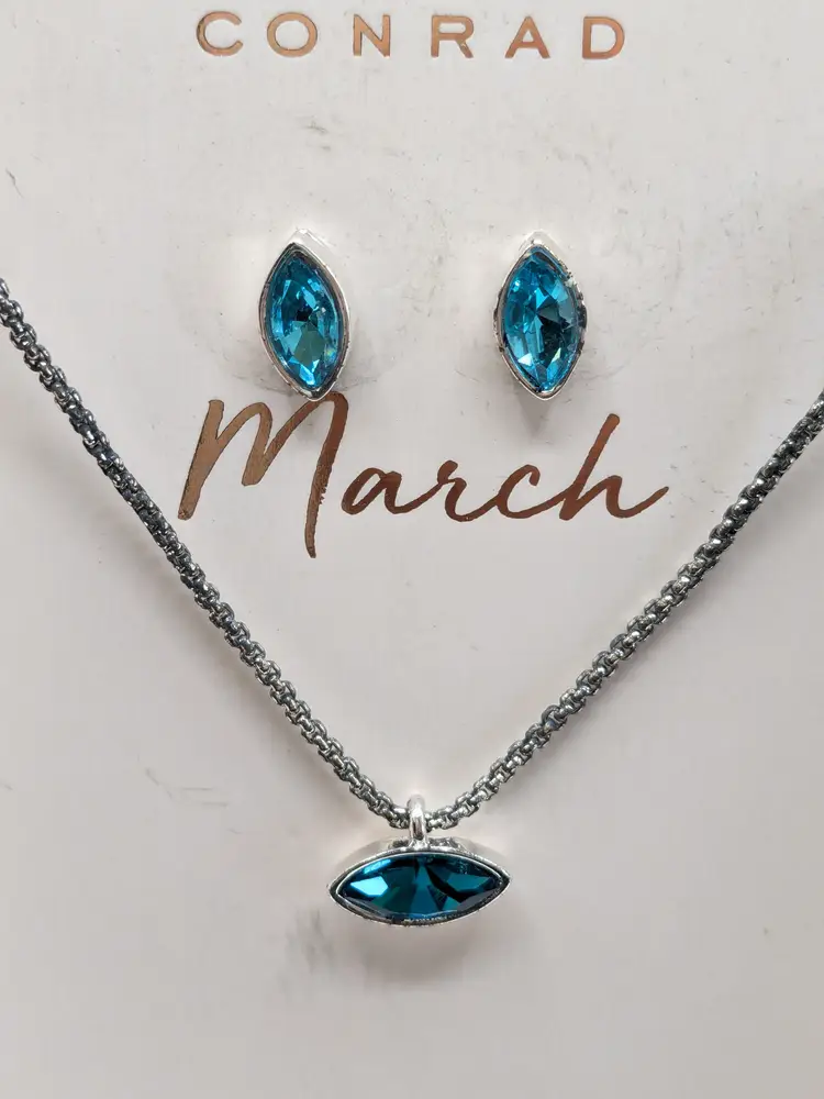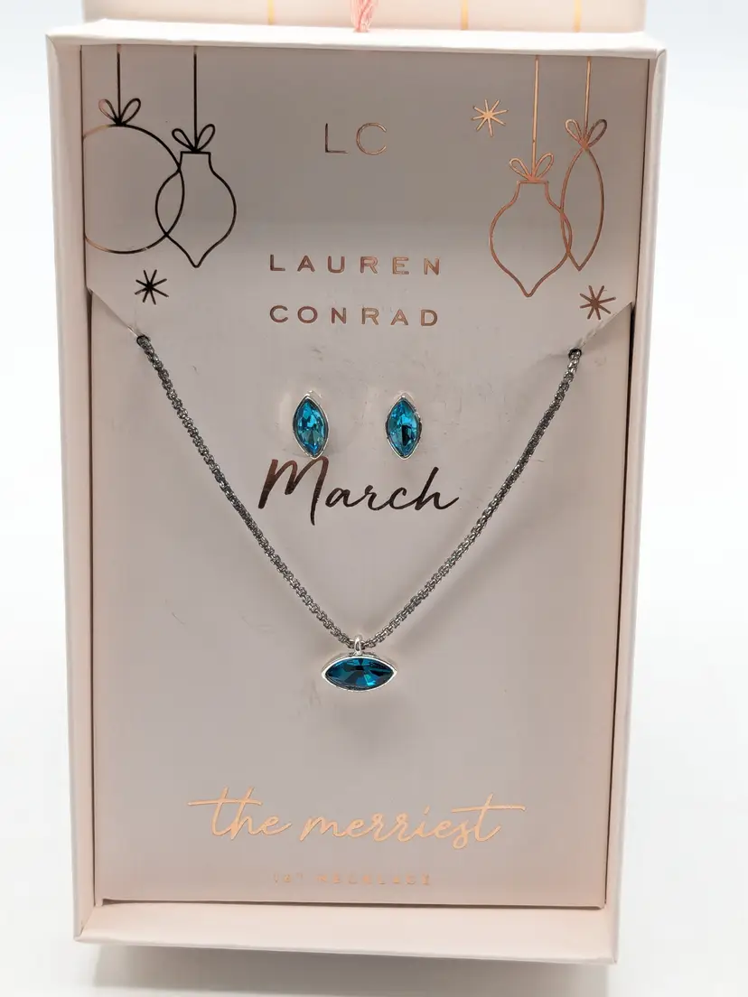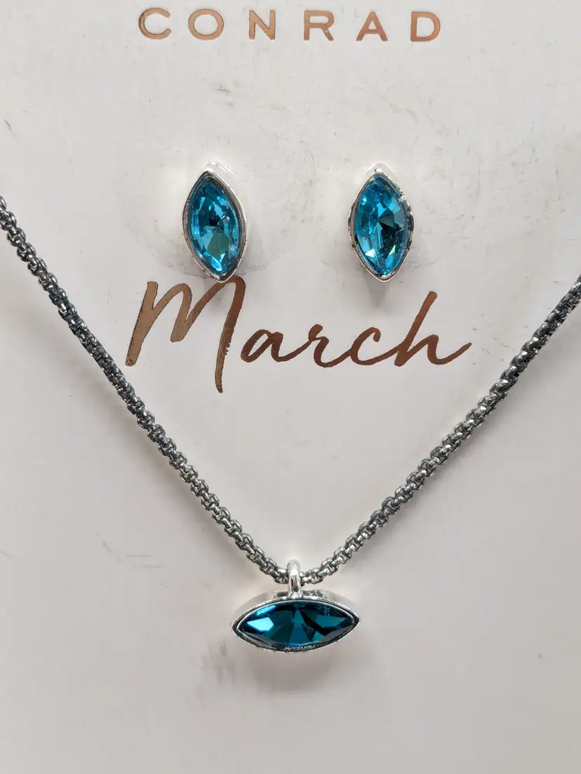 Good condition. Brand new in box. Features a delicate necklace and matching earrings with faux aquamarine March birthstone accents. Silver tone. Pierced stud earrings. Necklace is 16" in length with a 2" extension. wen