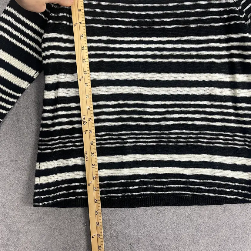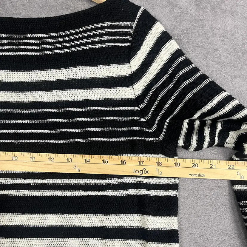 Soft knit construction with a comfortable, breathable feel Fabric content: 73% linen, 27% cotton Boat neckline with a flattering, relaxed silhouette Classic stripe pattern for versatile styling See pictures for measurements