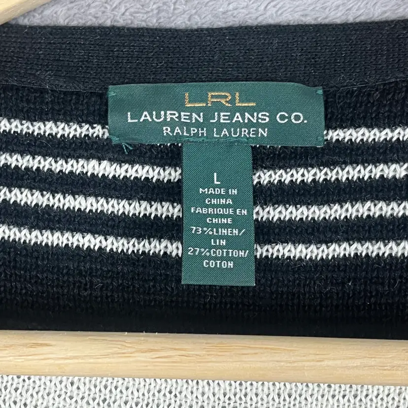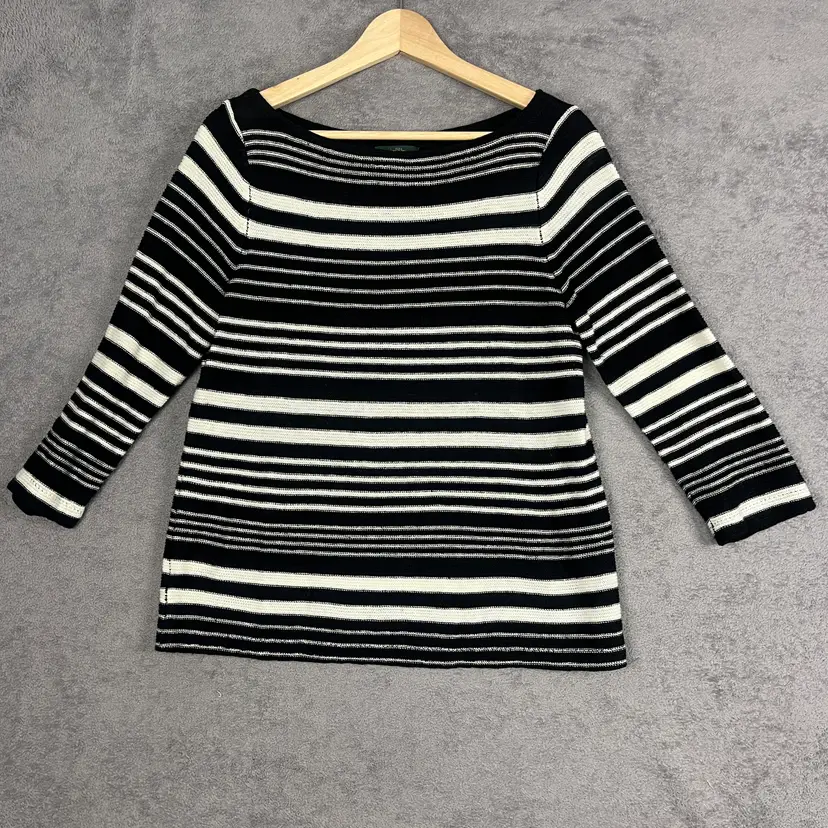 A timeless Lauren Ralph Lauren knit top with an easy, polished feel that works beautifully for everyday wear. This black and white striped piece features a flattering boat neckline and three-quarter sleeves, offering a classic silhouette with relaxed elegance. The breathable linen-blend knit gives it a comfortable drape that’s ideal for all-season layering.