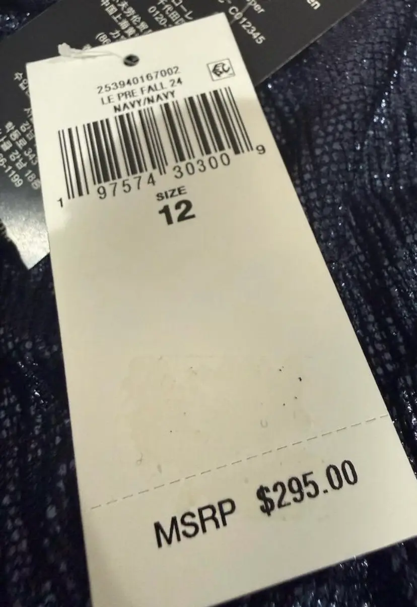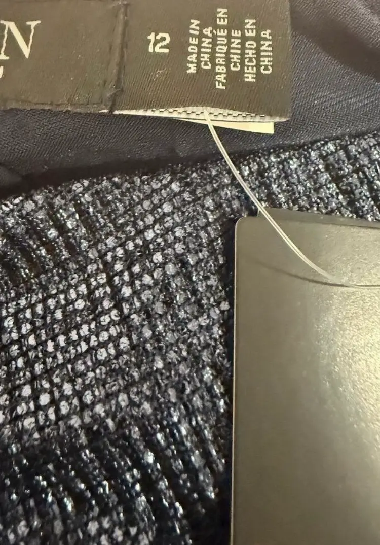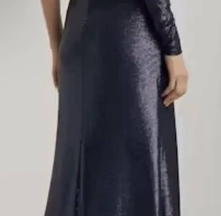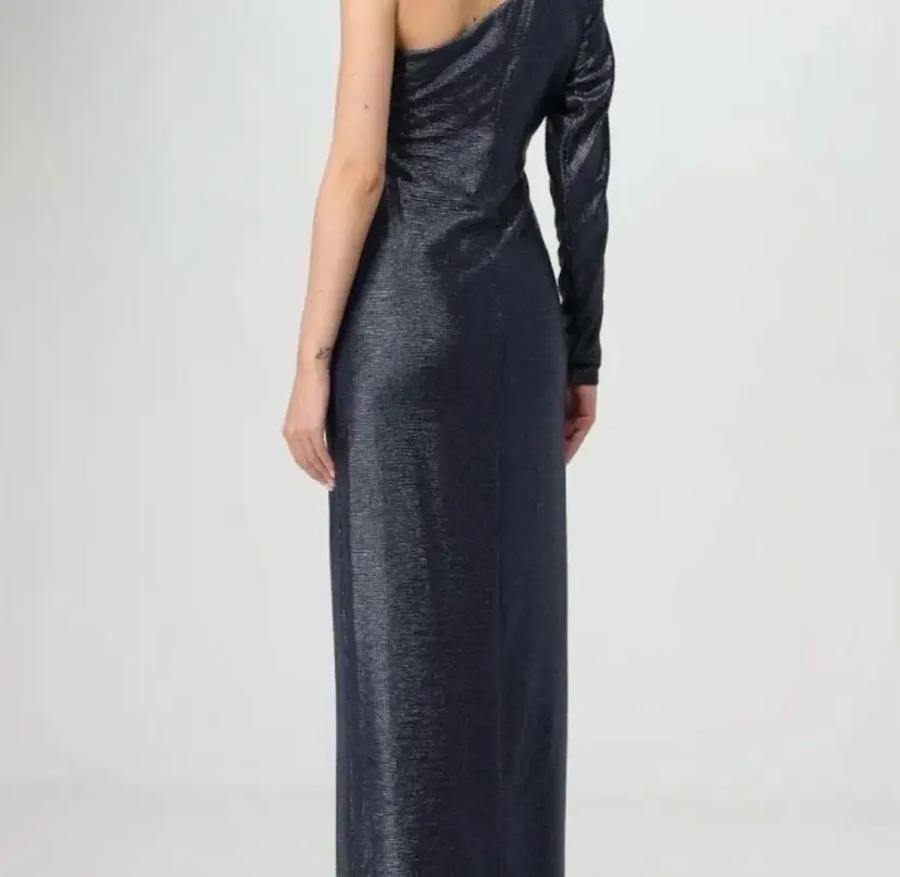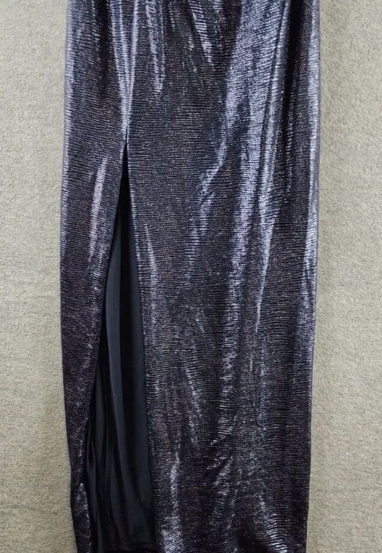 $275 MSRP This long, navy blue gown features a sophisticated one-shoulder neckline and is crafted from a luxurious metallic knit that shimmers with every step. The draped detailing adds a touch of drama, making it perfect for galas, weddings, or any event where you want to make a lasting impression. This gown is new with tags, ensuring you receive it in pristine condition.