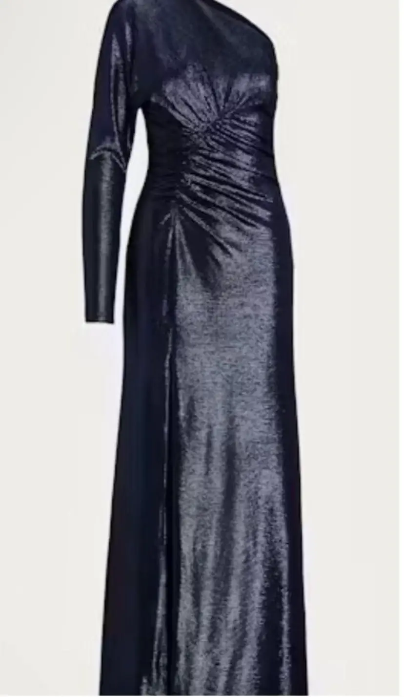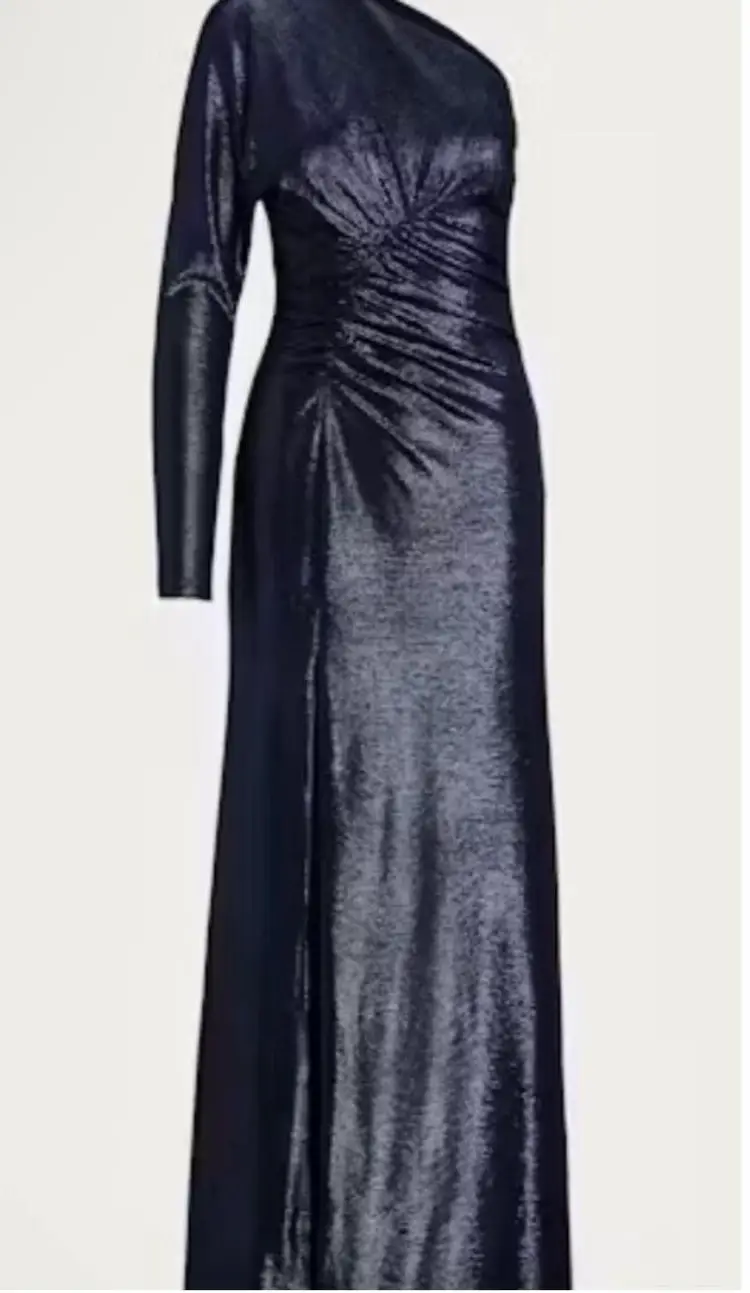 Keywords: Lauren Ralph Lauren, one-shoulder gown, formal dress, navy blue, metallic knit, draped detailing, evening wear, women's fashion, elegant, long dress, new with tags, formal occasion, wedding guest, gala attire, eye-catching shimmer.