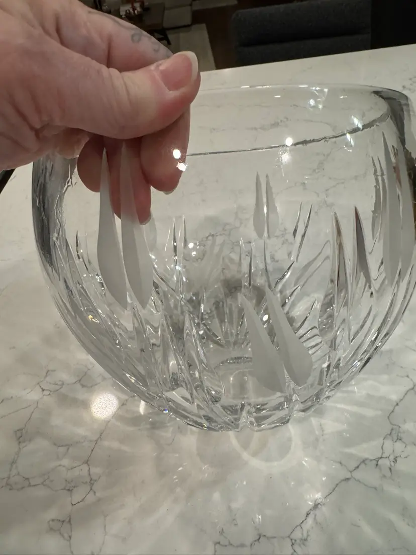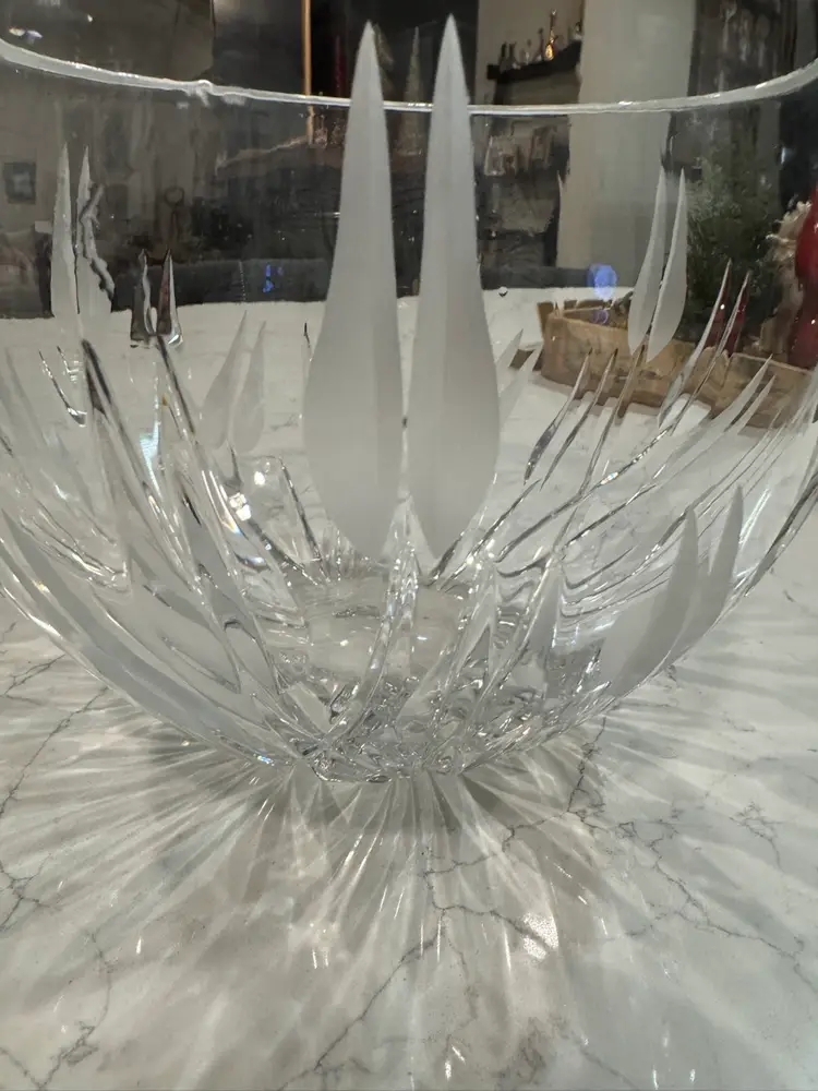 Elegant centerpiece bowl, perfect for adding a touch of sophistication to any table setting. This beautiful bowl features exquisite etched tulip floral designs, catching and reflecting light to create a 'diamond' effect. Ideal for use as a fruit bowl, or for serving special dishes. Its clear crystal construction highlights any contents beautifully and complements various decor styles. In excellent pre-owned condition, showing minimal to no signs of wear.