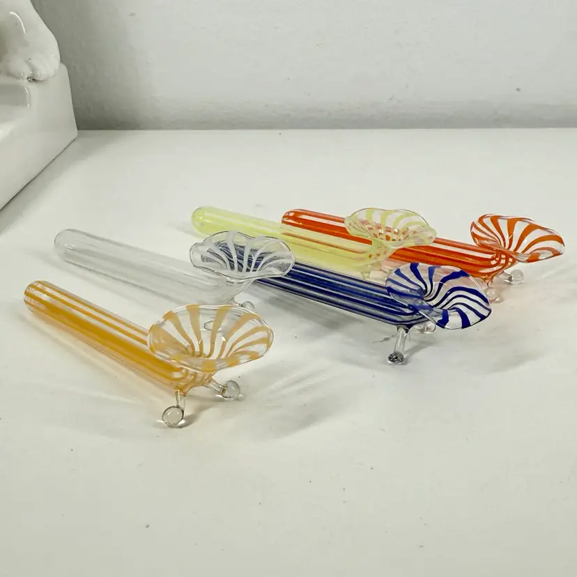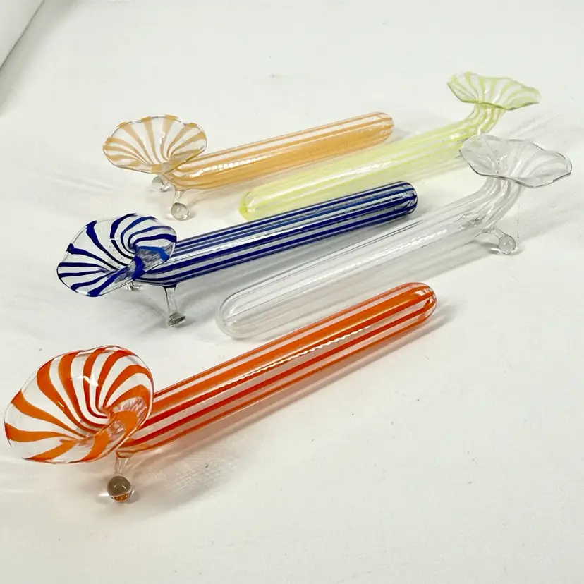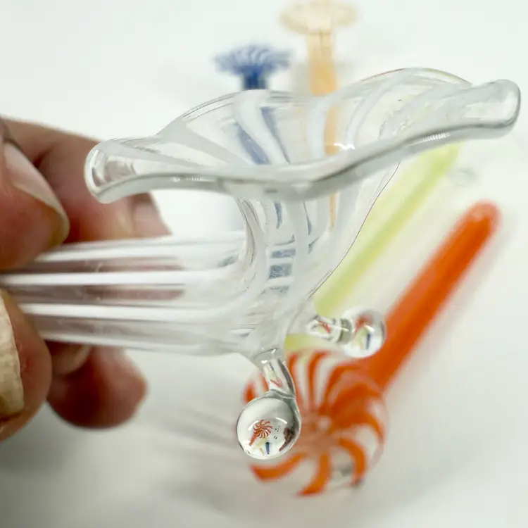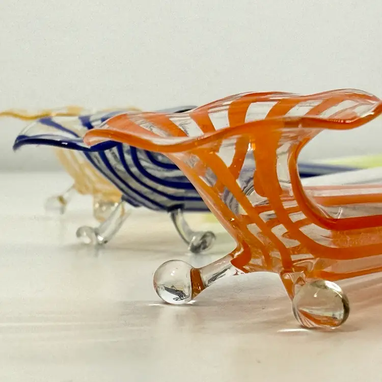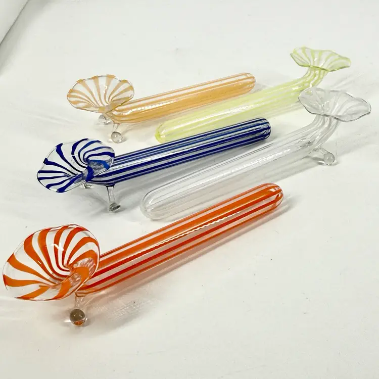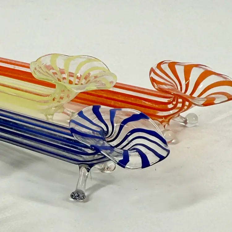 Hi... These amazing LAUSCHA Bimini Orchid Vases/ Knife Rests are a set of stylish and original mid-century modern glassware items from Germany. Handmade with glossy, candy-striped glass in the five vibrant colors, these 3.5-inch vases add a touch of fun retro charm to any table setting. This art glass vintage set is perfect for showcasing springtime and summer flowers, making them a unique and eye-catching addition at your next get together. Made by Lauscha Glass and possible designed by Fritz Lampl, these little vases are a classic example of lglass ampwork craftsmanship from the 1950s.