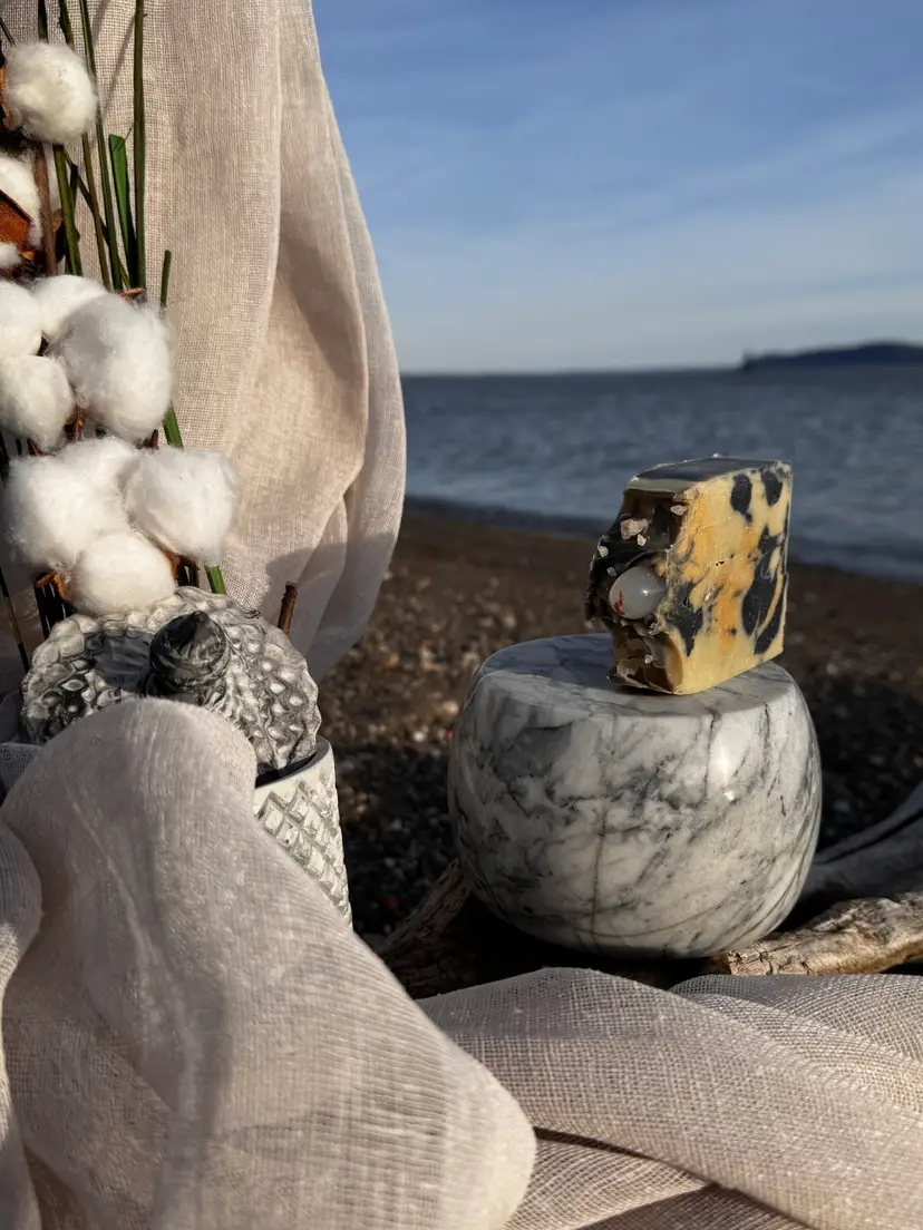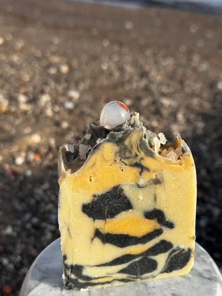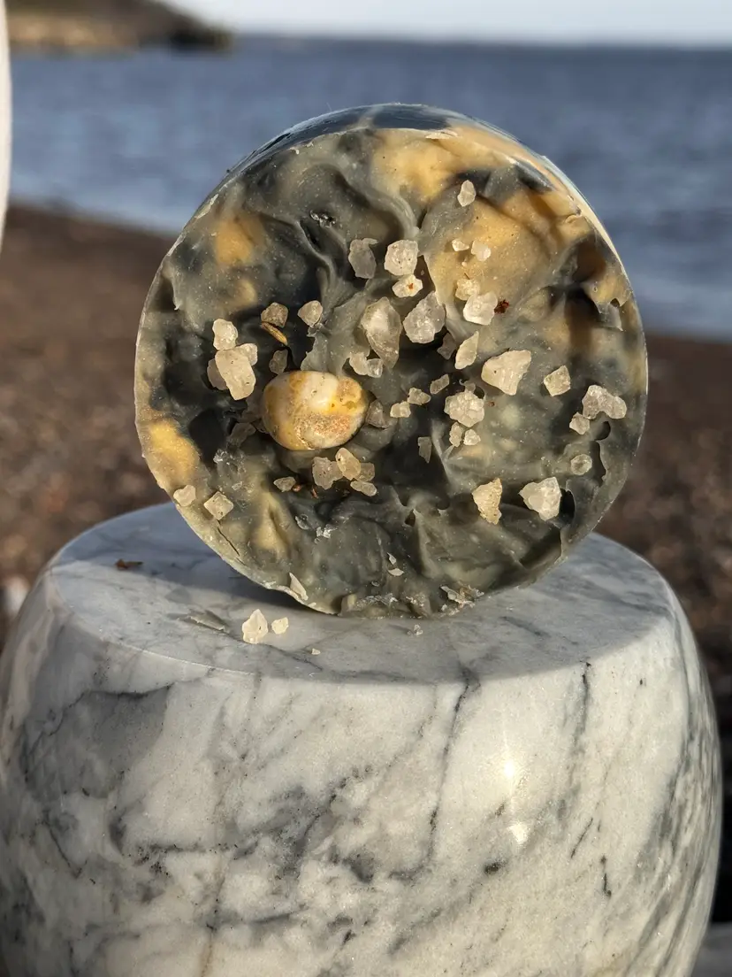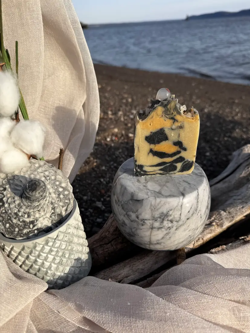 This soap is part of a special BliN soap created with deep intention, blending beauty, healing, and ritual. What sets these soaps apart is the inclusion of a genuine, handpicked crystal stone known for its metaphysical properties, chosen from a wide selection including Amethyst, Clear Quartz, Rose Quartz, Tiger’s Eye, Obsidian, Lapis Lazuli, Ocean Jasper, and more. Every stone is cleansed and energetically charged under a full moon, making each one a truly sacred addition. The crystal is gently embedded in the soap and topped with Himalayan salt for added purification and a spa-like aesthetic. You won’t choose your stone—the universe will guide the one meant for you, promoting a sense of divine alignment and discovery. This isn’t just soap—it’s a ritual in a bar, designed to elevate your daily self-care into a moment of spiritual connection and intention.