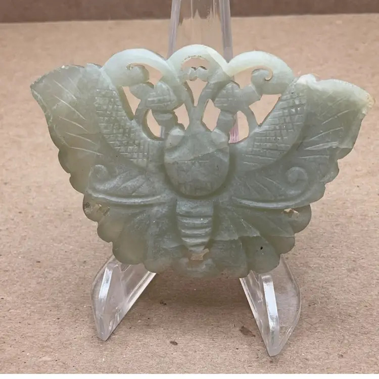 Hand carved, no signature; fissure’s throughout. Holes for cord or jump rings to use as a pendant.