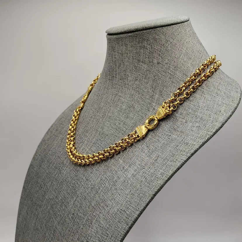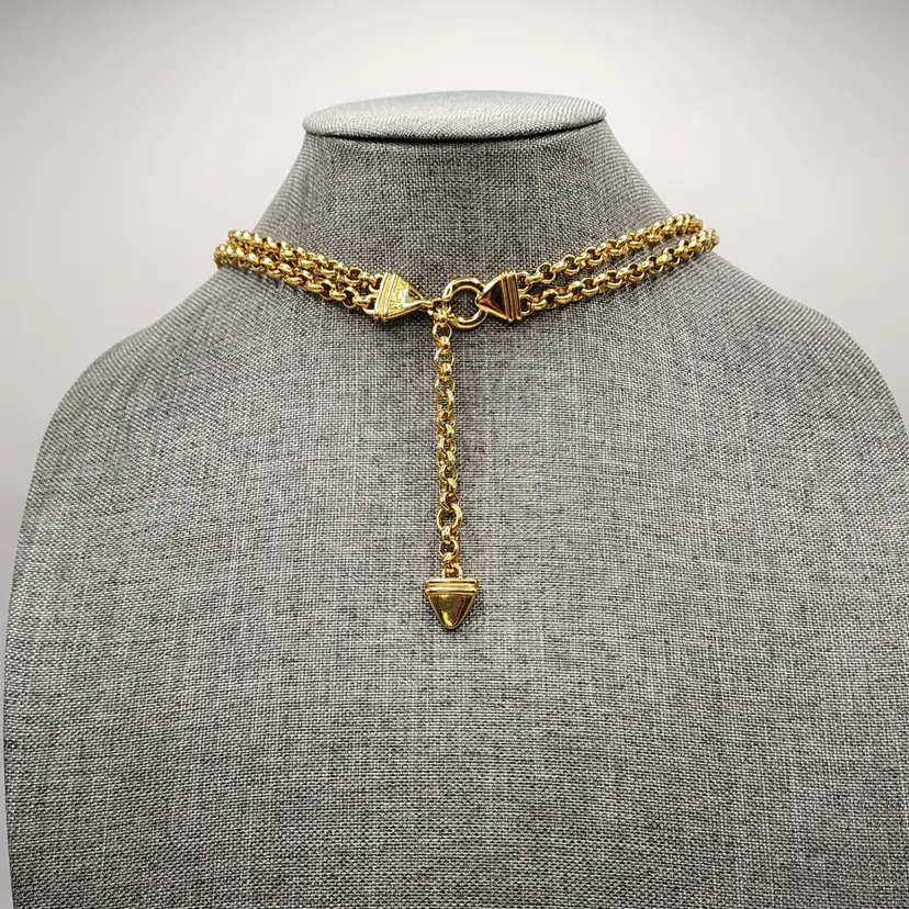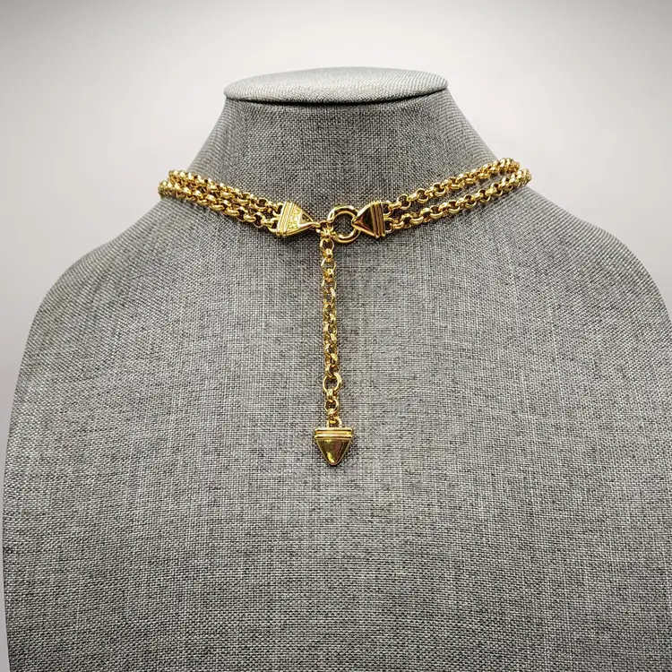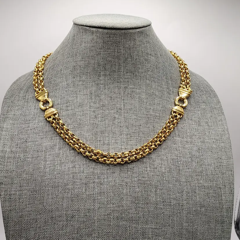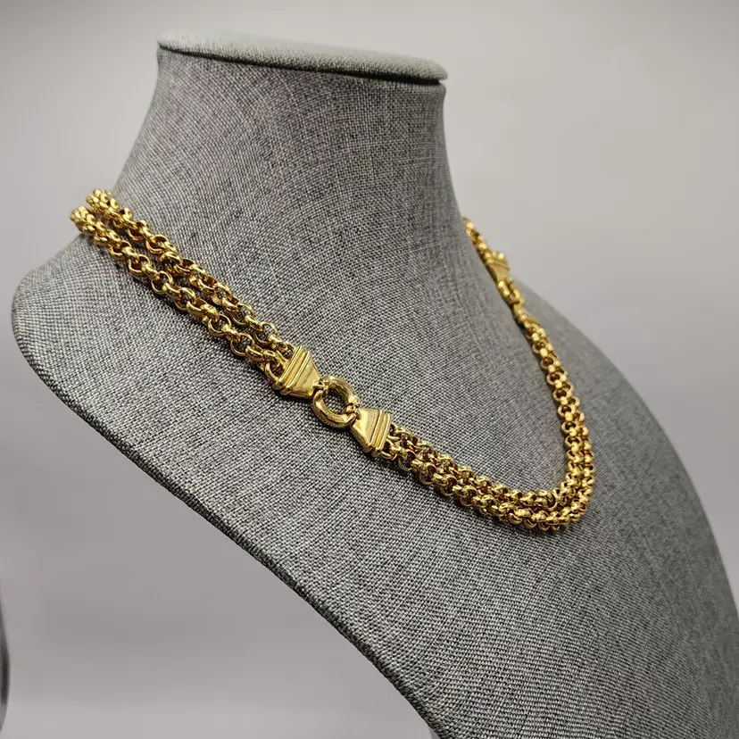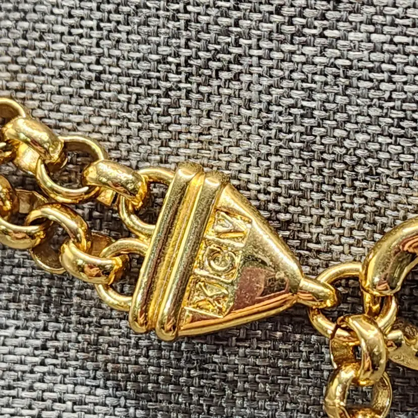 Add a touch of elegance to your outfit with this stunning LCI Liz Claiborne XCV necklace. The double chunky rolo chain design is perfect for creating a bold statement, while the gold tone adds a subtle touch of glamour. The necklace is ideal for any occasion and is sure to catch the eye of admirers. Crafted by Liz Claiborne, this necklace features a unique blend of style and quality. The brand is renowned for its fashionable jewelry, and this piece is no exception. The necklace is perfect for those who love to make a statement with their accessories and is a must-have for any jewelry collection. Good pre-owned condition, please see photos for details.