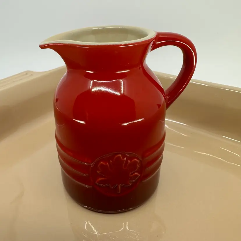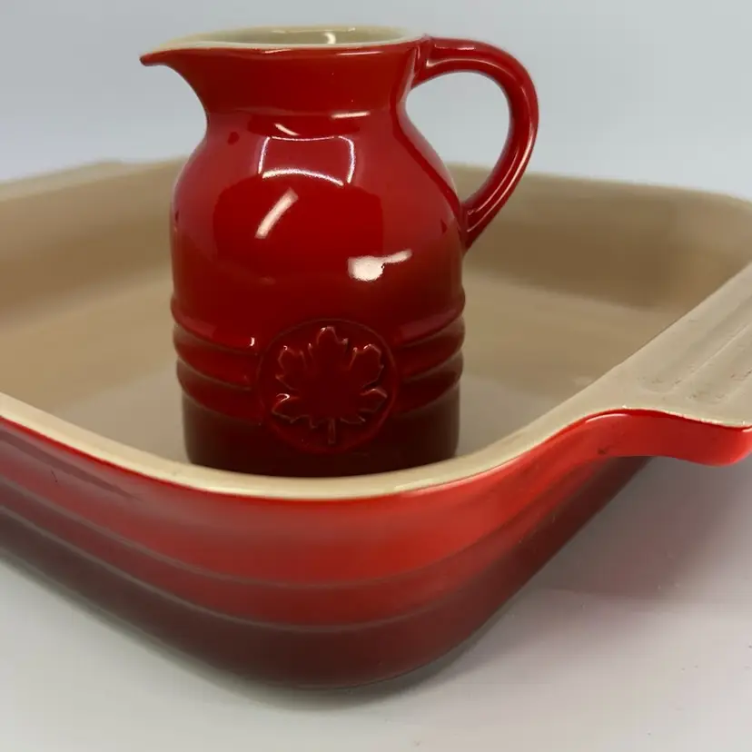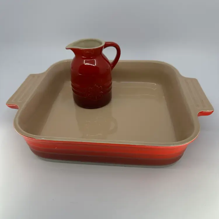 Dish is 9” x 11” across the handles and the pitcher is 4” tall, no chips or cracks, good condition