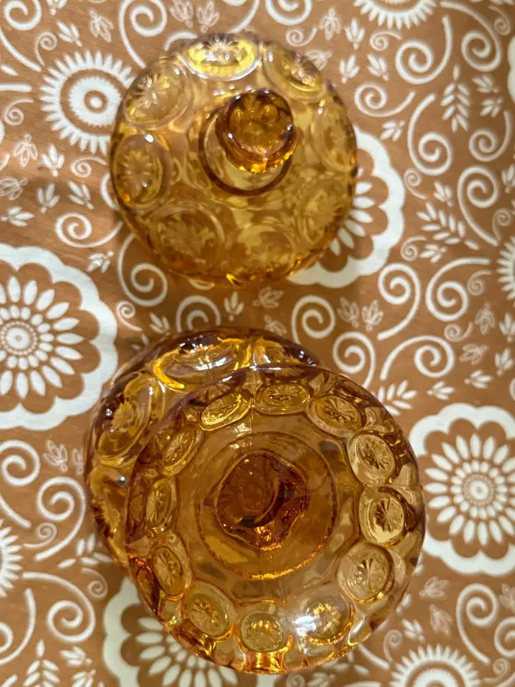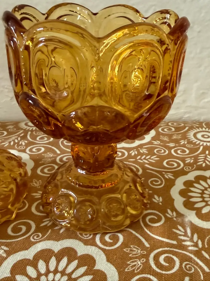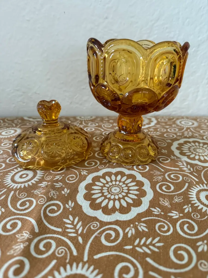 This is a vintage L.E. Smith Glass Company "Moon and Stars" pattern amber glass lidded pedestal candy dish. Manufacturer: L.E. Smith Glass Company, popular during the mid-century period. Pattern: "Moon and Star," characterized by deeply recessed "moons" and embossed "stars". Color: Rich amber/honey gold glass. Type: Compote or candy jar with a lid.