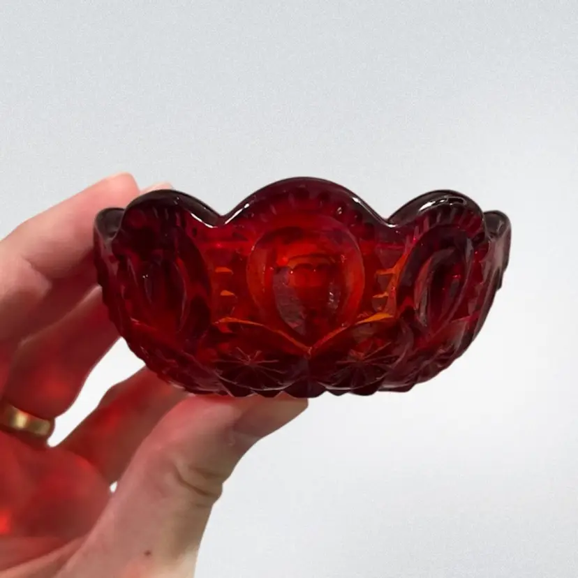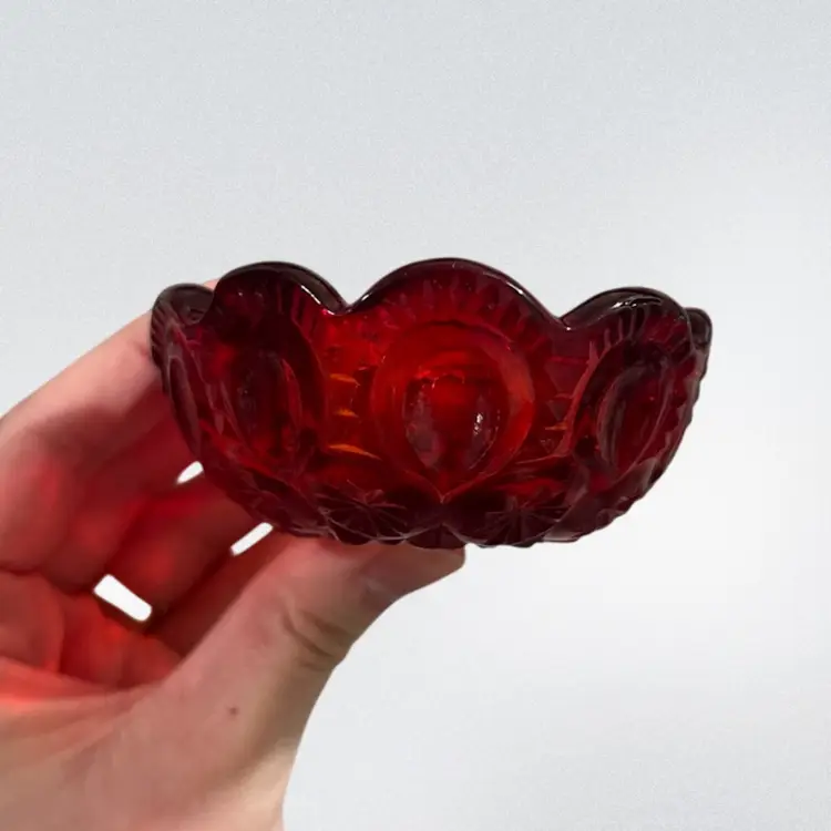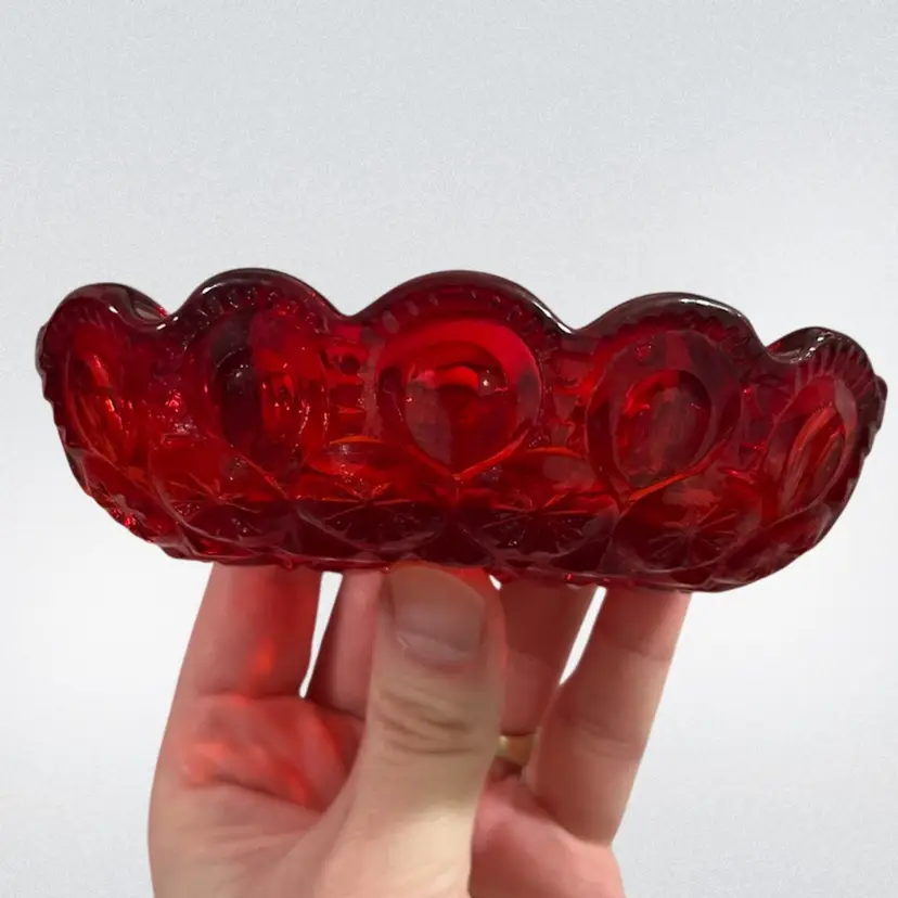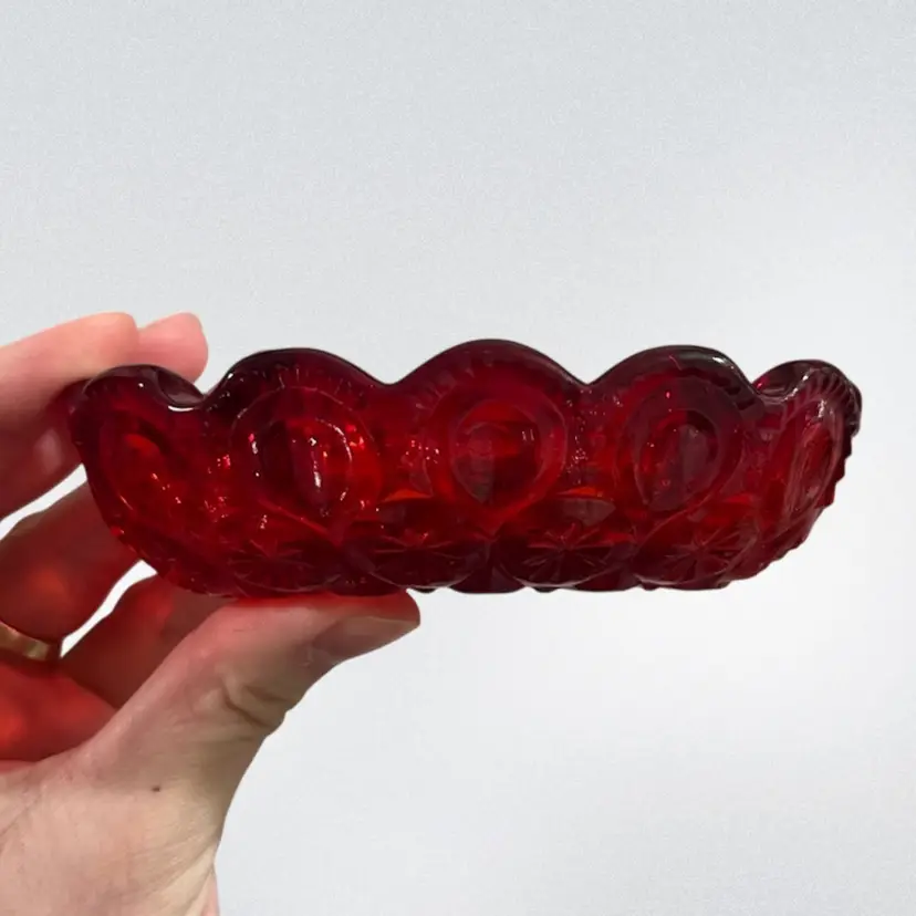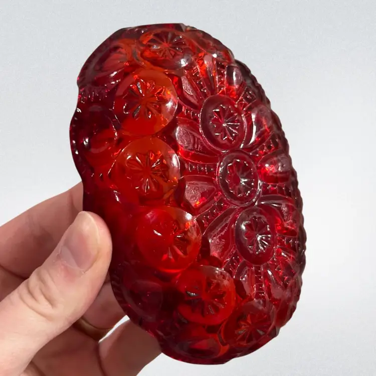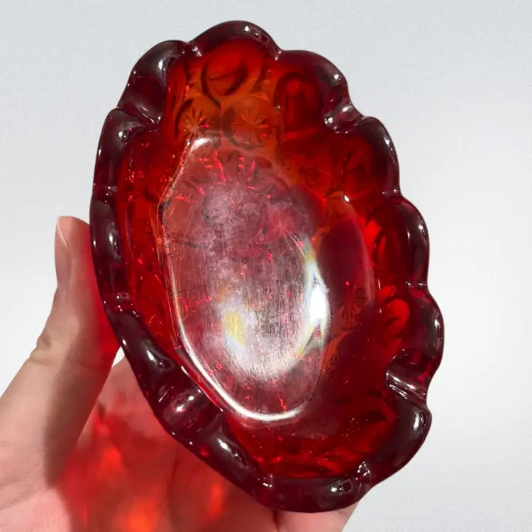 Approximately 4.5” x 3” x 1.25”. No chips or cracks. The bottom of the interior has some foggy lines and cloudiness that can only be seen when the light catches it at an angle (please see photos).