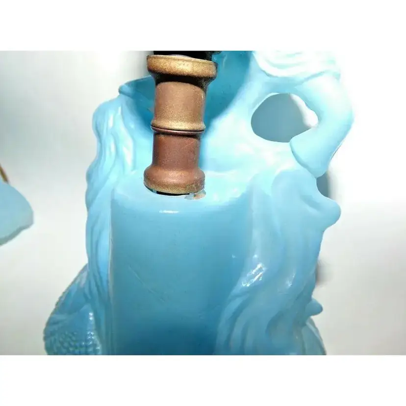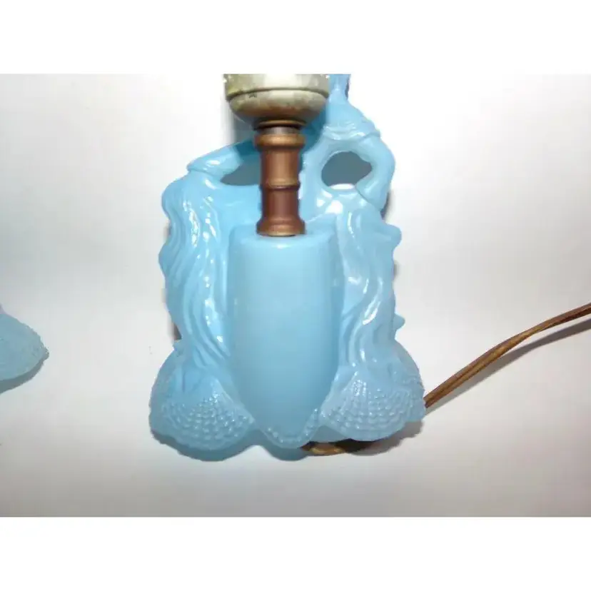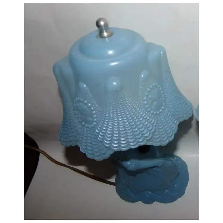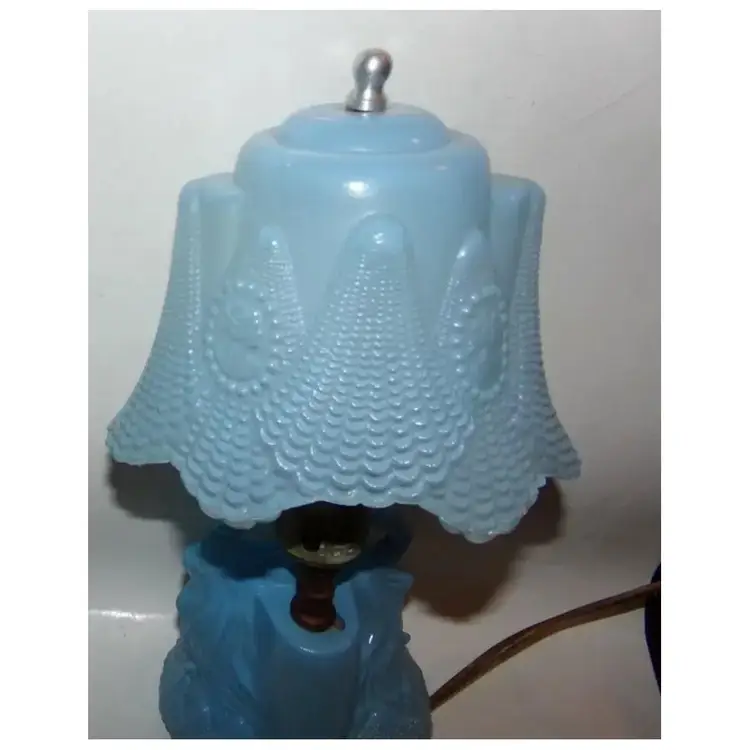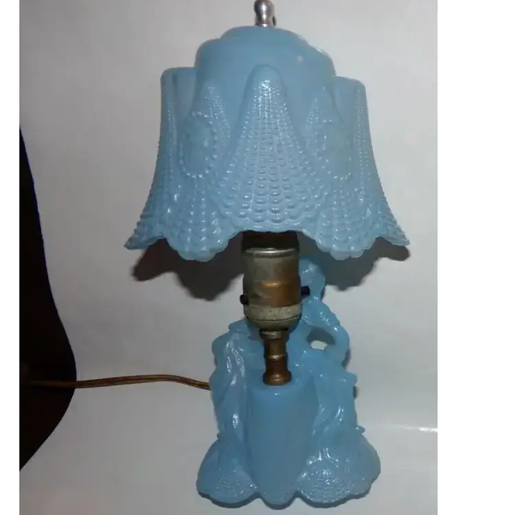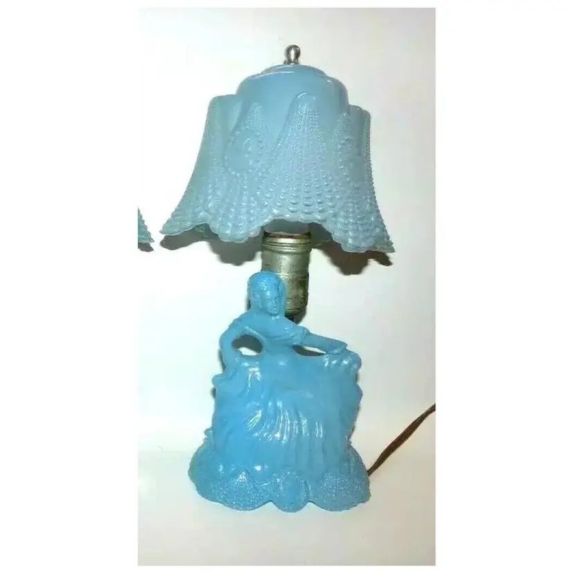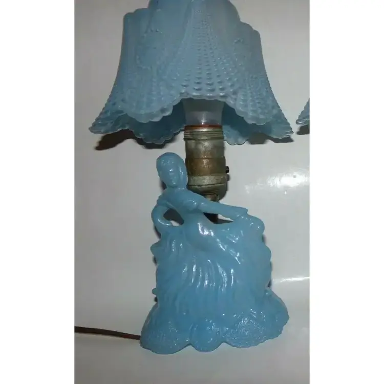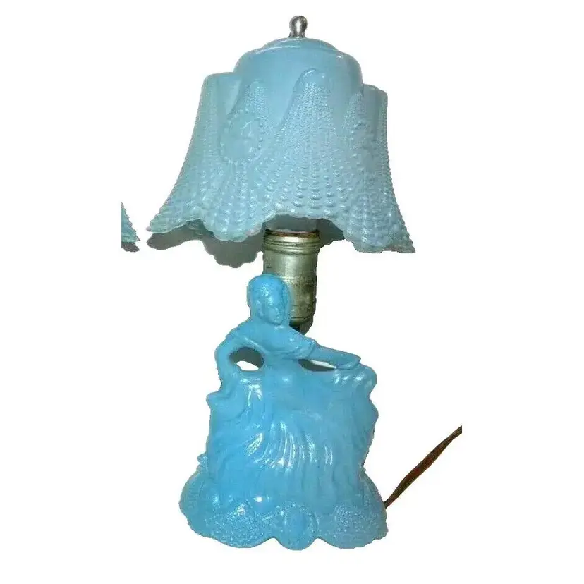 This is a rare and wonderful, Vintage Art Deco Fired-On Blue Dancing Lady Boudoir Lamp with Original Shade, that is done in a shell-fan-like pattern! It is believed to have been made by LE SMITH GLASS. It's a VERY RARE version of the single dancing lady. * It stands at 11 1/2" high. * It in Very Good Cond- It has 1 small area where the fired-on color is gone, but on back of one lamp-unseen.(see last pic) It it may have even come like that-as it's not a chip, but just a small clear area. It is at the base of the brass lamp pole on the right side. See Last Pic. * It works, but the wire is very old and will need re-wiring. * Please see all pics, as they are part of the description. #antiqueglass #Blues #Feelingblue #EAPG