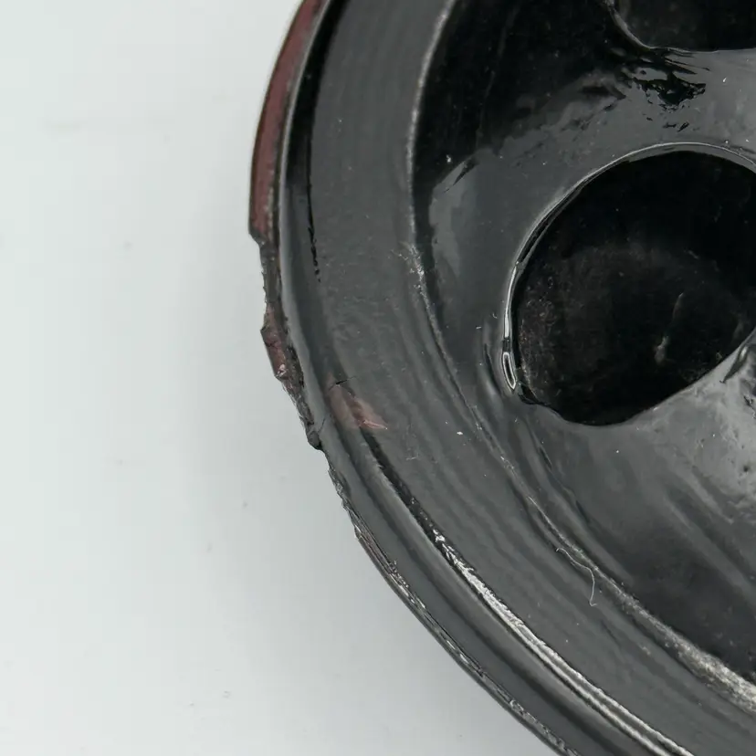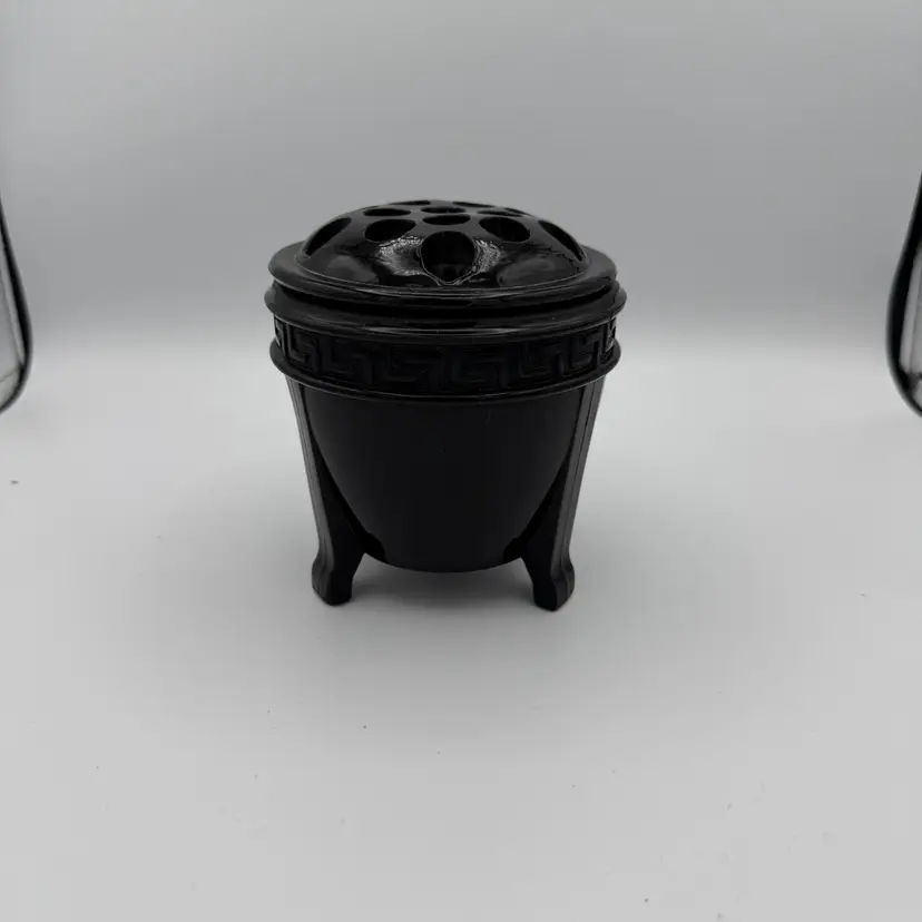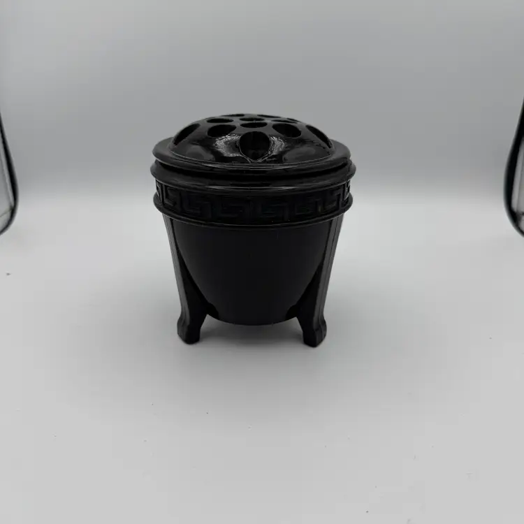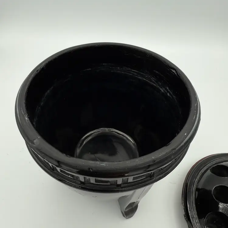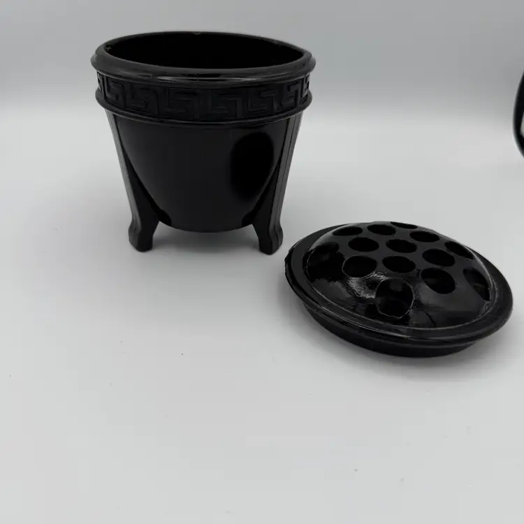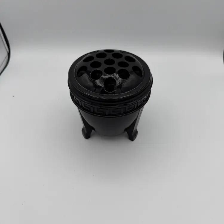 L.E. Smith Black Amethyst Greek Key Base with Flower Frog. Art Deco Style. Frog Has 16 Holes and is 4.25". The Bowl is 4.25" Without Flower Frog. Stands of 3 Legs With Art Deco Trim Around the Edge. Flower Frog Has Some Chipping (Pictured). Base Has Signs of Wear. Overall Good Vintage Condition. Solid Piece.