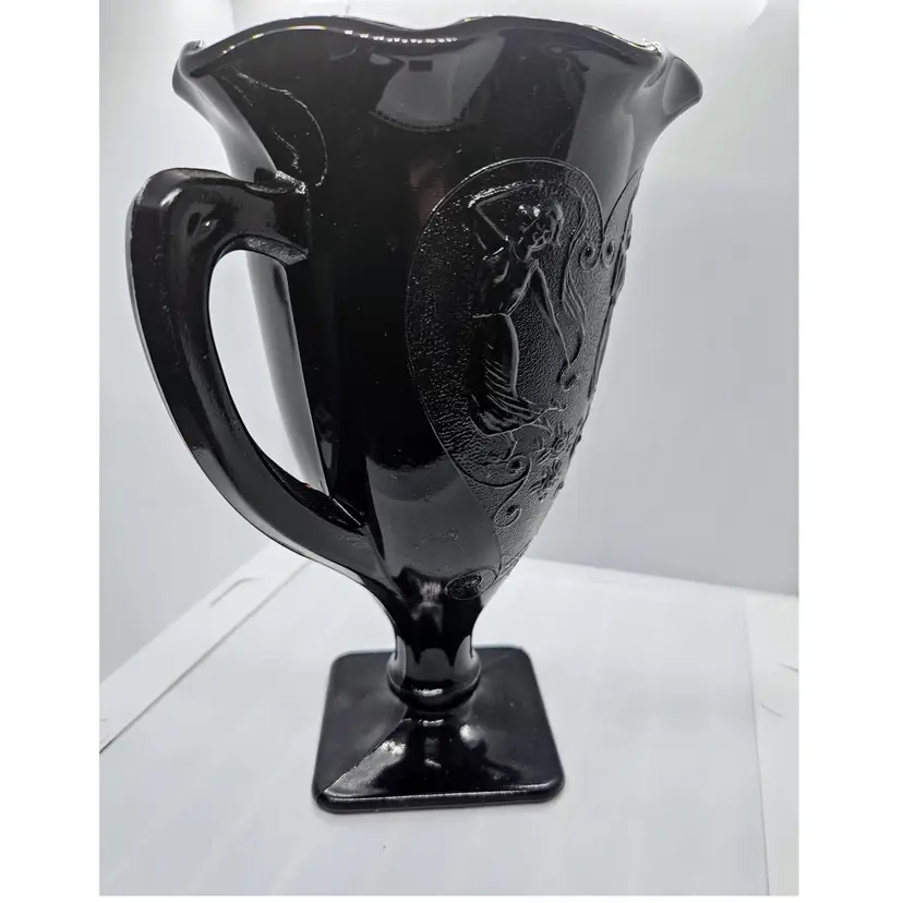 This glass vase is 7" high and 4 1/4 inches wide. There are no chips in the glass. Very pretty.