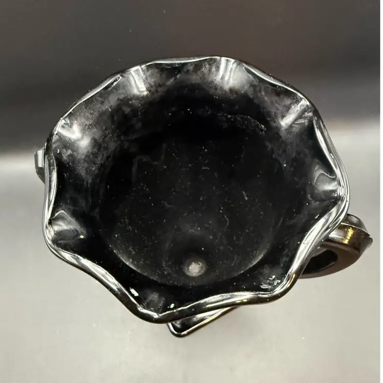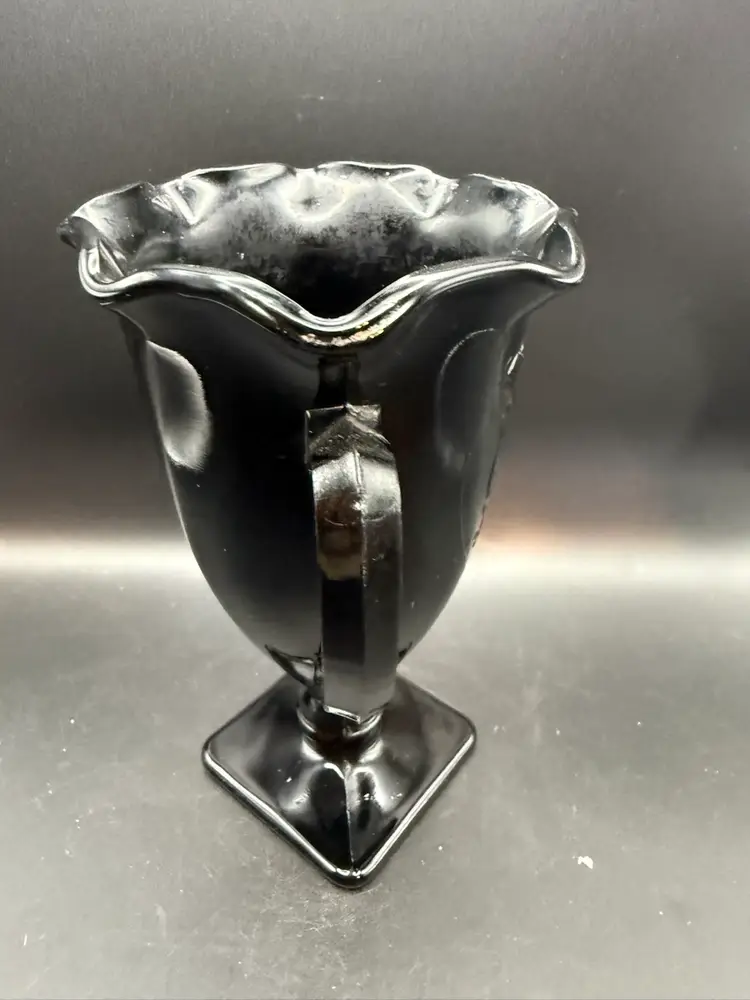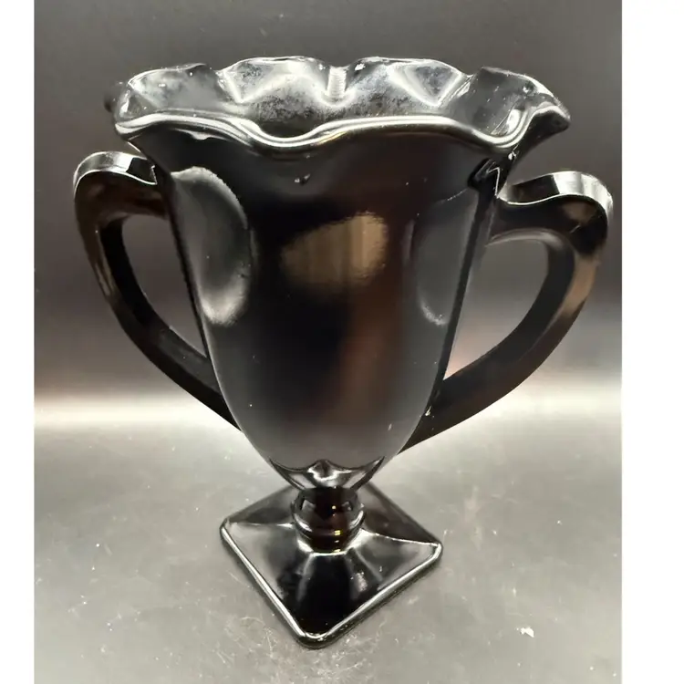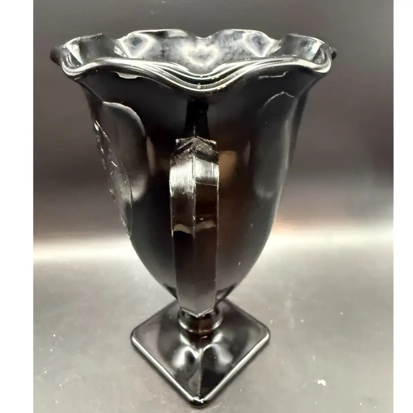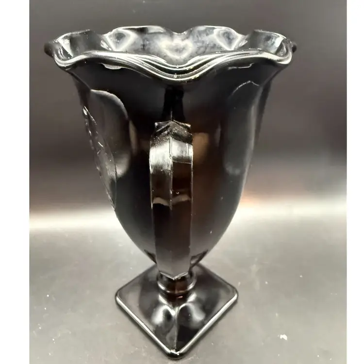 Black Amethyst glass is a type of colored glass produced by various American glass companies, most notably the L.E. Smith Glass Company. It is characterized by its deep purple hue that appears black in normal light but reveals its amethyst color when held up to a strong light source. Their "Snake Dance" pattern, also known as "Nymphs," features stylized figures in a flowing design, often seen on vases, bowls, and other decorative items.