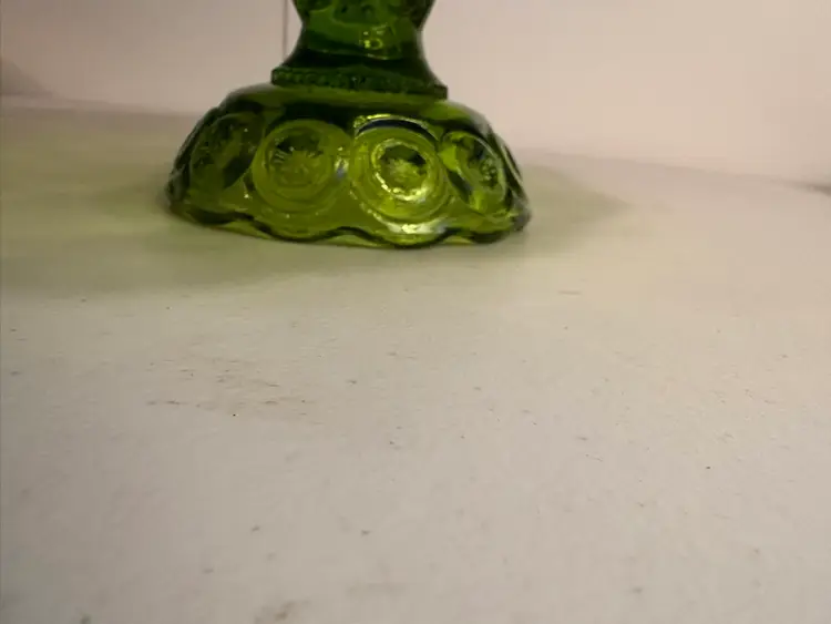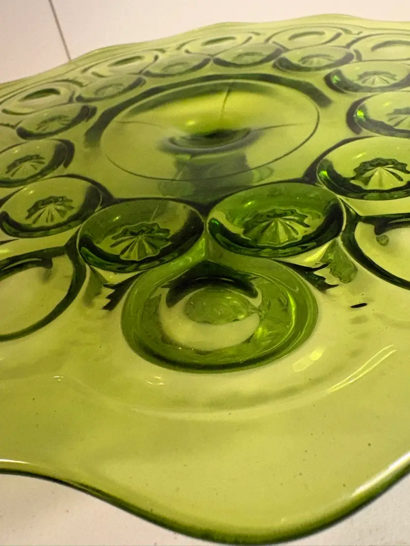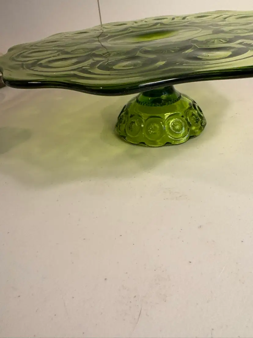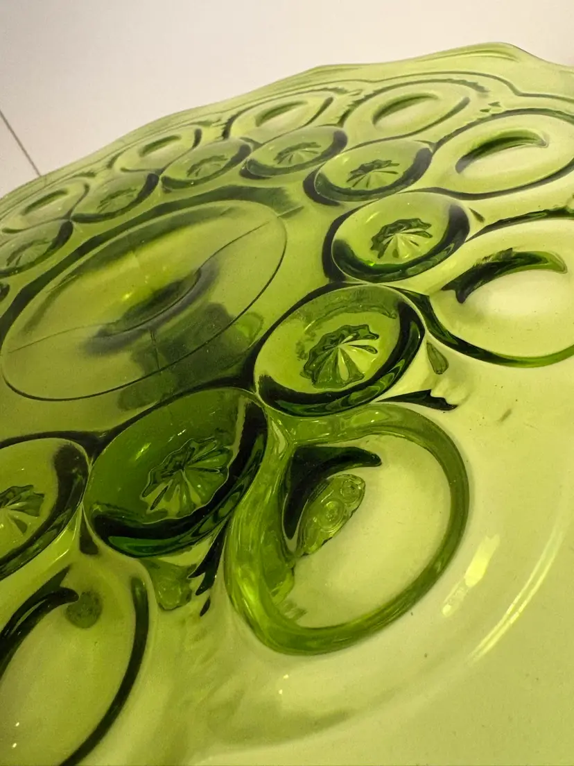 The LE Smith MOON & STARS Lime Green 10.75" LOW CAKE STAND is a vintage piece of pressed glass, featuring a star-shaped design with a moon and stars motif. Made by L.E. Smith in the United States, this decorative cake stand is perfect for all occasions and adds a touch of elegance to any table setting. The glossy lime green color and intricate pattern make it a standout piece for your collection, ideal for displaying cakes and desserts with style and charm.