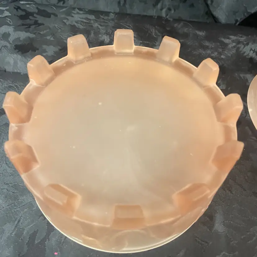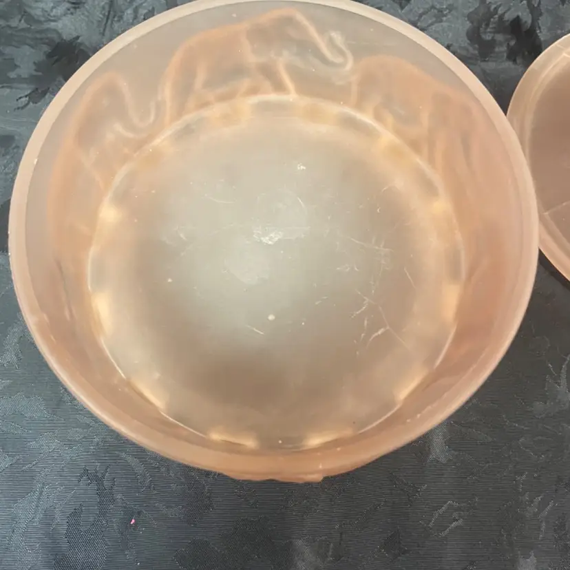 Vintage LE Smith Pachyderm Powder Jar circa 1930s. Frosted Pink in color There is some minor chipping on the underside of the jar. The powder jar measures 5.25” in diameter and 5.25” tall.