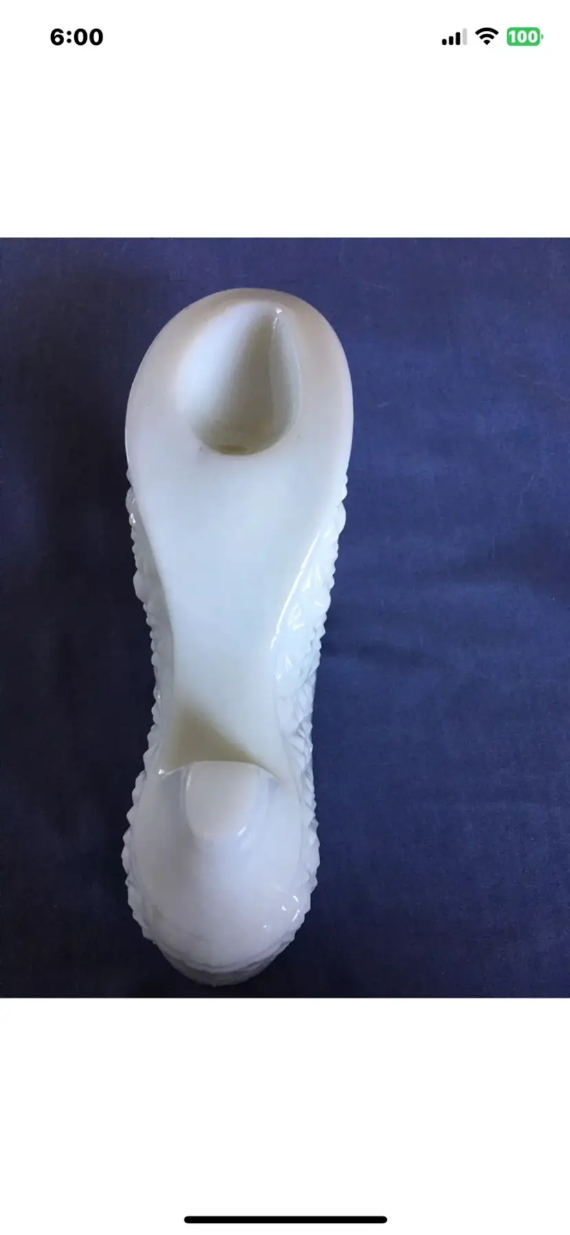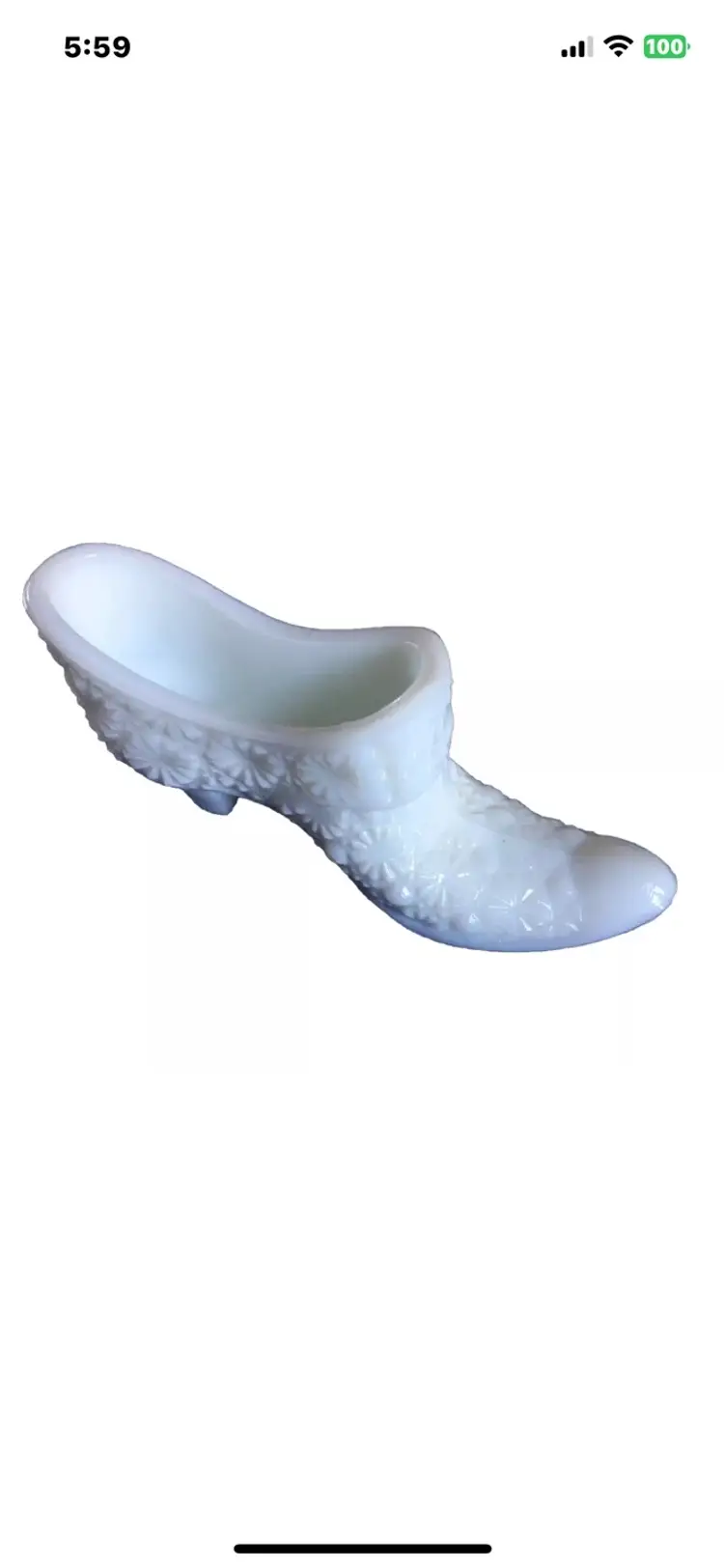 This is a gorgeous piece of LE Smith decorative art glass. The white milk glass color and daisy, button and laces pattern make it a unique addition to any collection. Attributed to Fenton style. This slipper measures 5.5" in length, 2.5” in height, and 1.5" in width. This piece has no under stamp or labels This shoe has 2 slight surface hairline cracks on the top that do not go all the way thru. And a small flea bite chip on the underside of the tip of the toe. Otherwise shoe is good condition. Please view photos and read description carefully