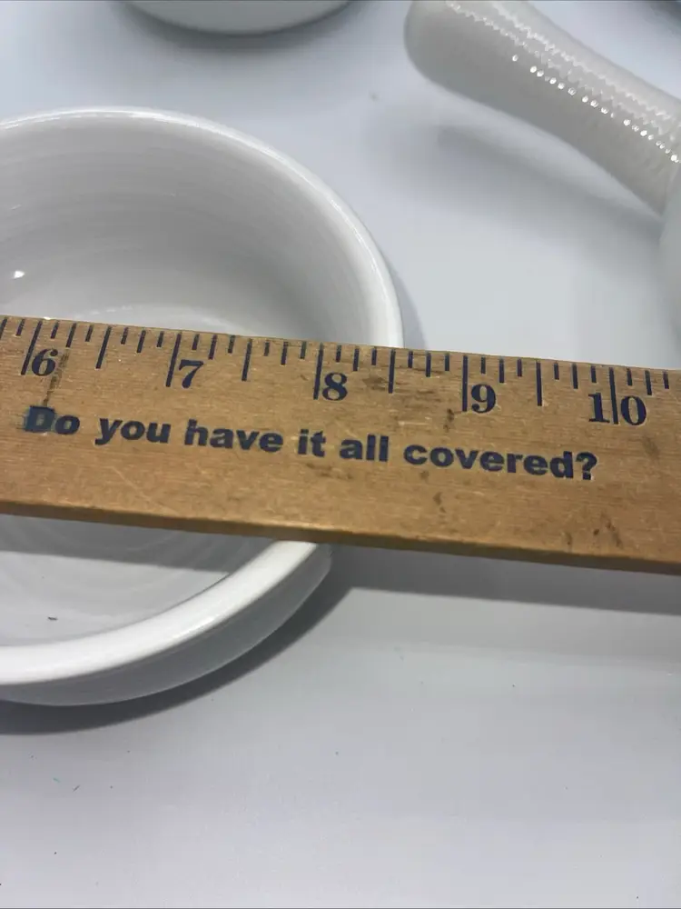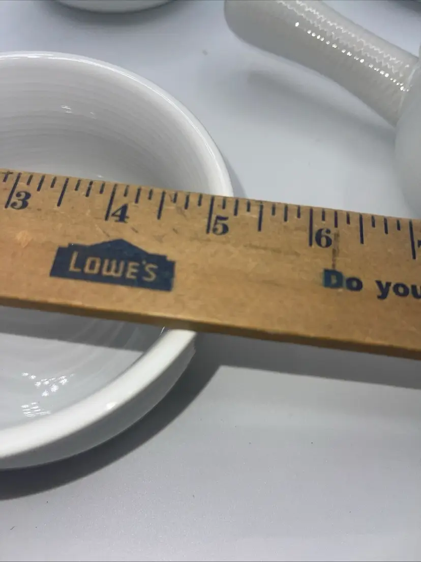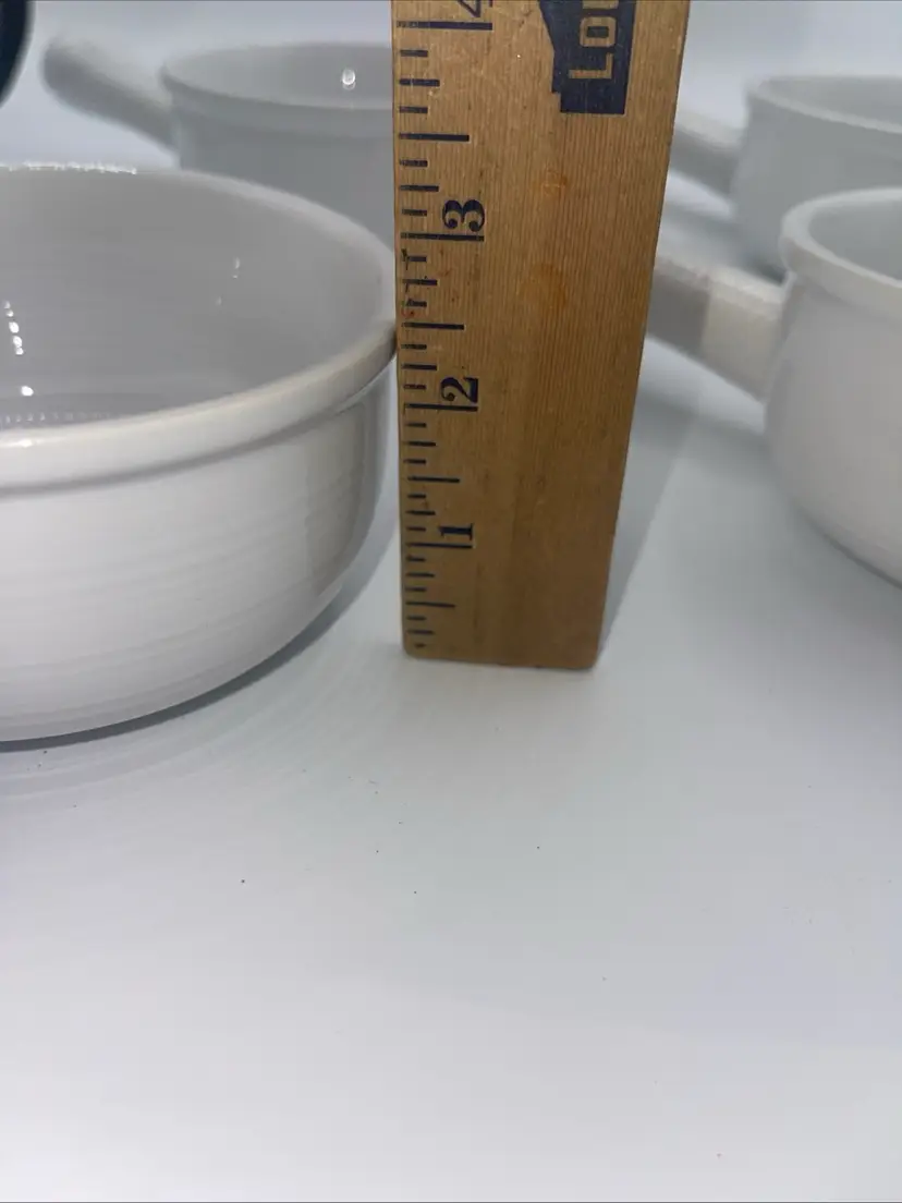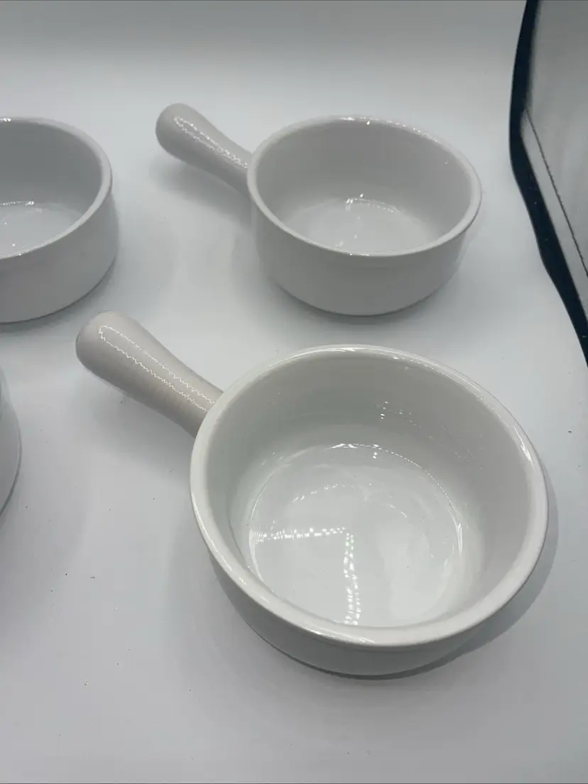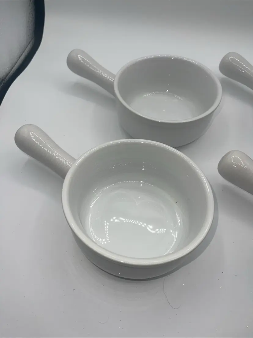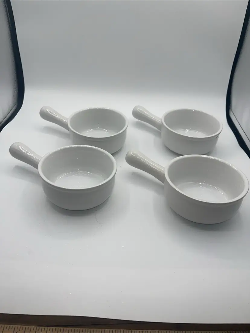 This is for a set of four handled bowls with the handle that 8 inches. The bullet itself is 5” x 2 1/2” on the bottom. It does say oven safe dishwasher safe and microwave safe they’ve never been used perfect for French onion soup or gumbo or chili they’re beautiful.