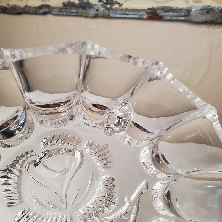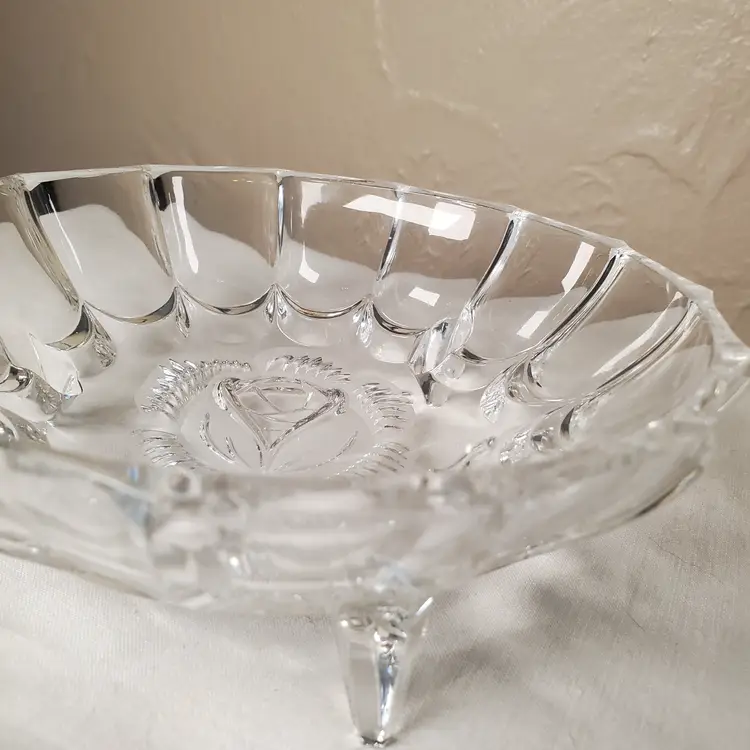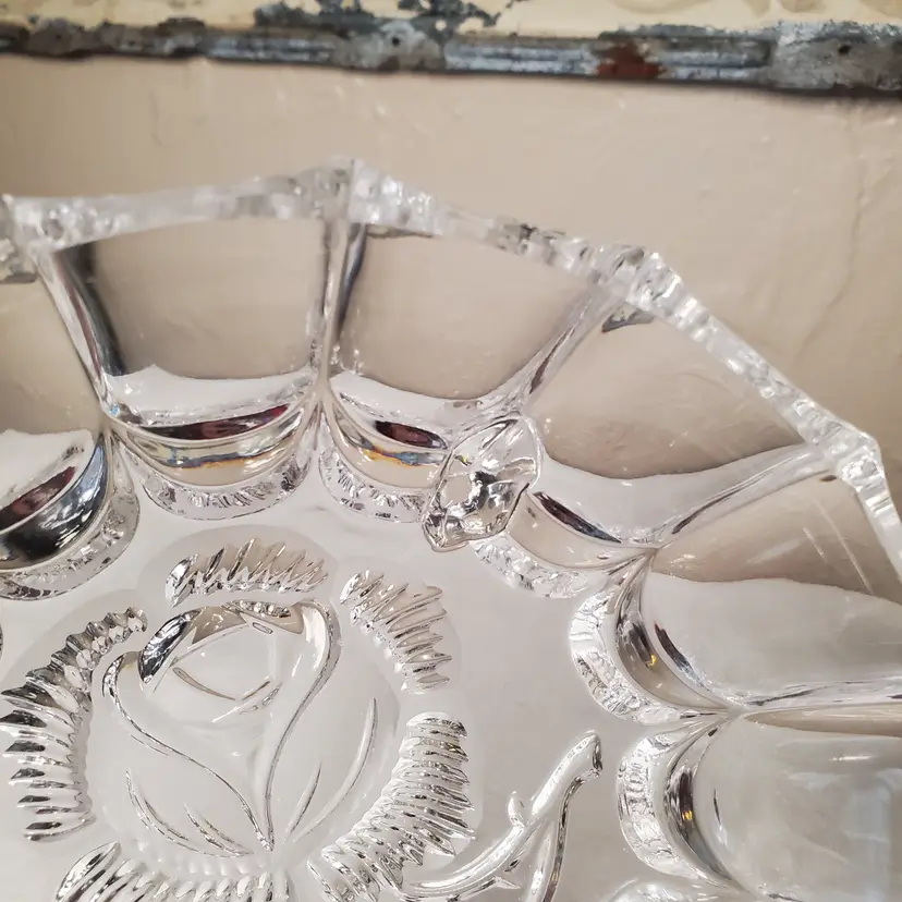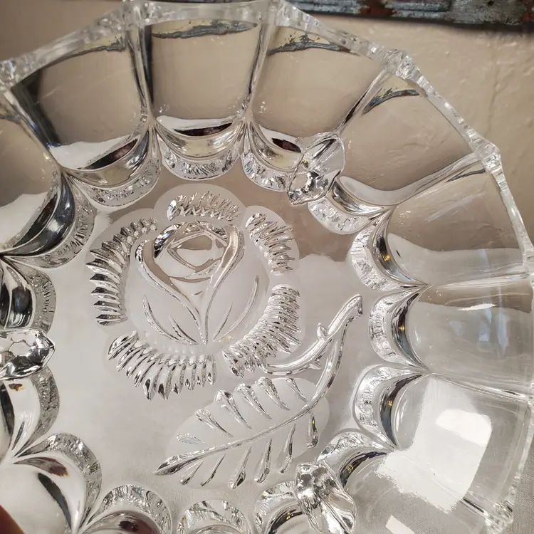 Lovely crystal footed bowl with embossed rose motif. Unmarked, but many similar online are noted as West Germany origin. 2 1/4" tall. 6 1/4" diameter. No chips or cracks.