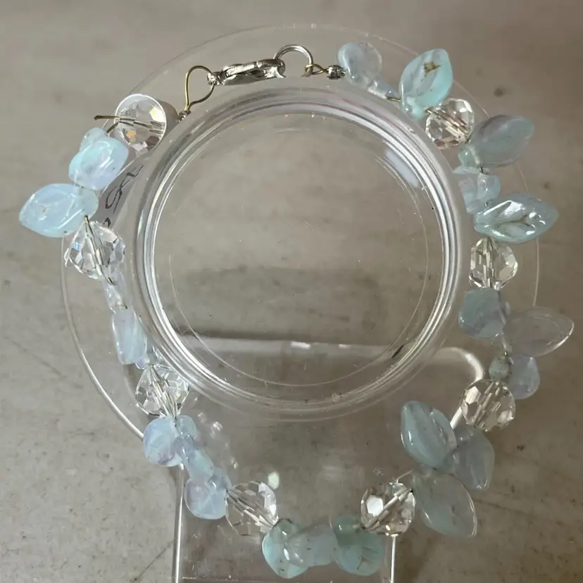 Beautiful glass leaf and crystal beaded bracelet on clasp. Wrist size 8-9” in length