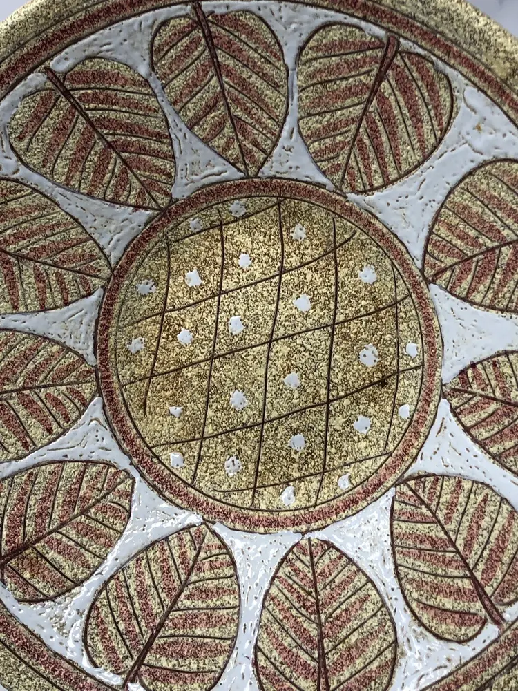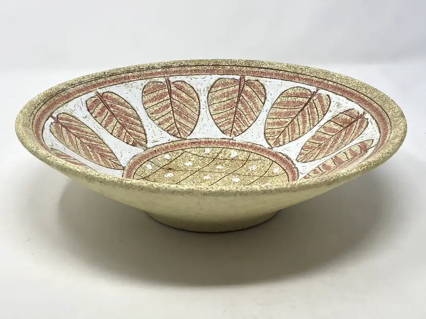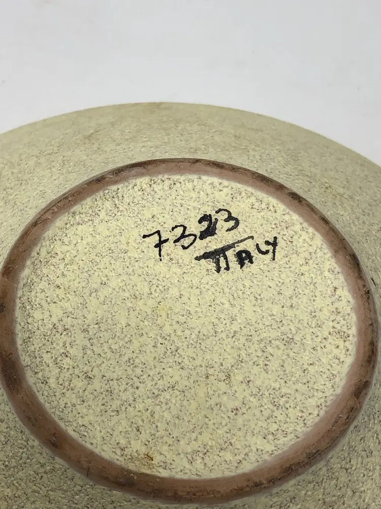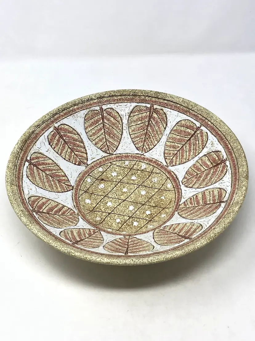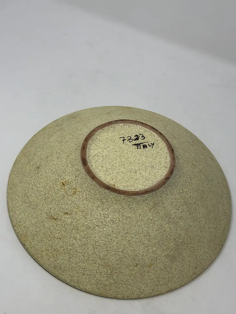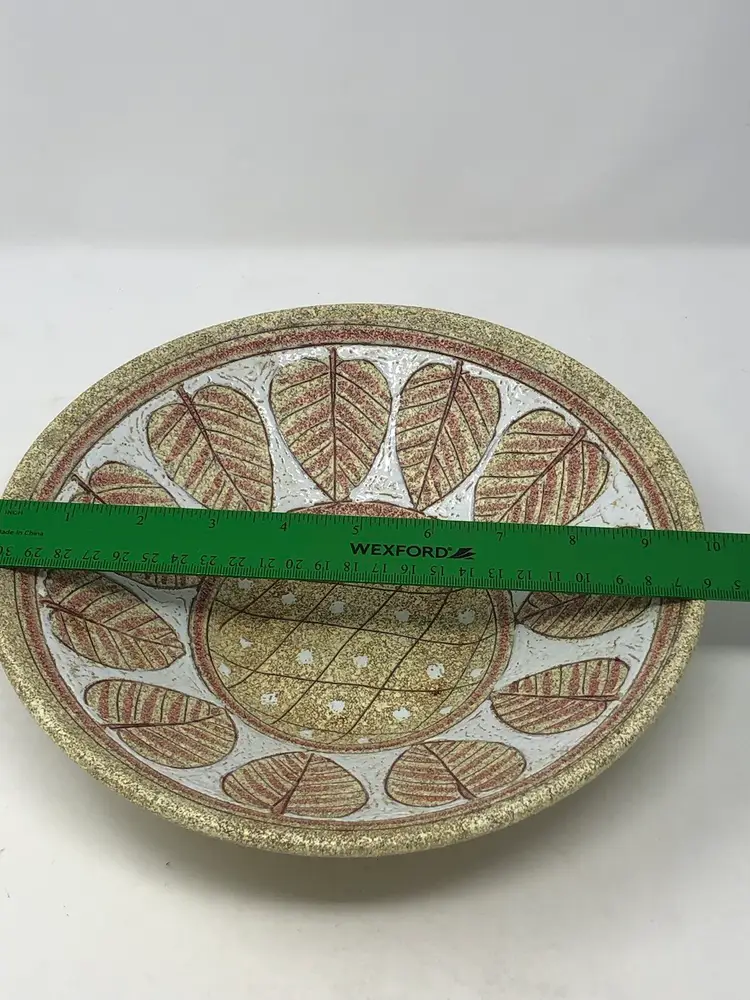 10" pottery bowl with mixed texture glaze. Leaf design inside marked Italy on the base. No chips or cracks.