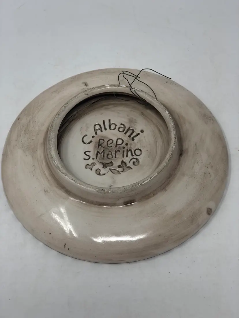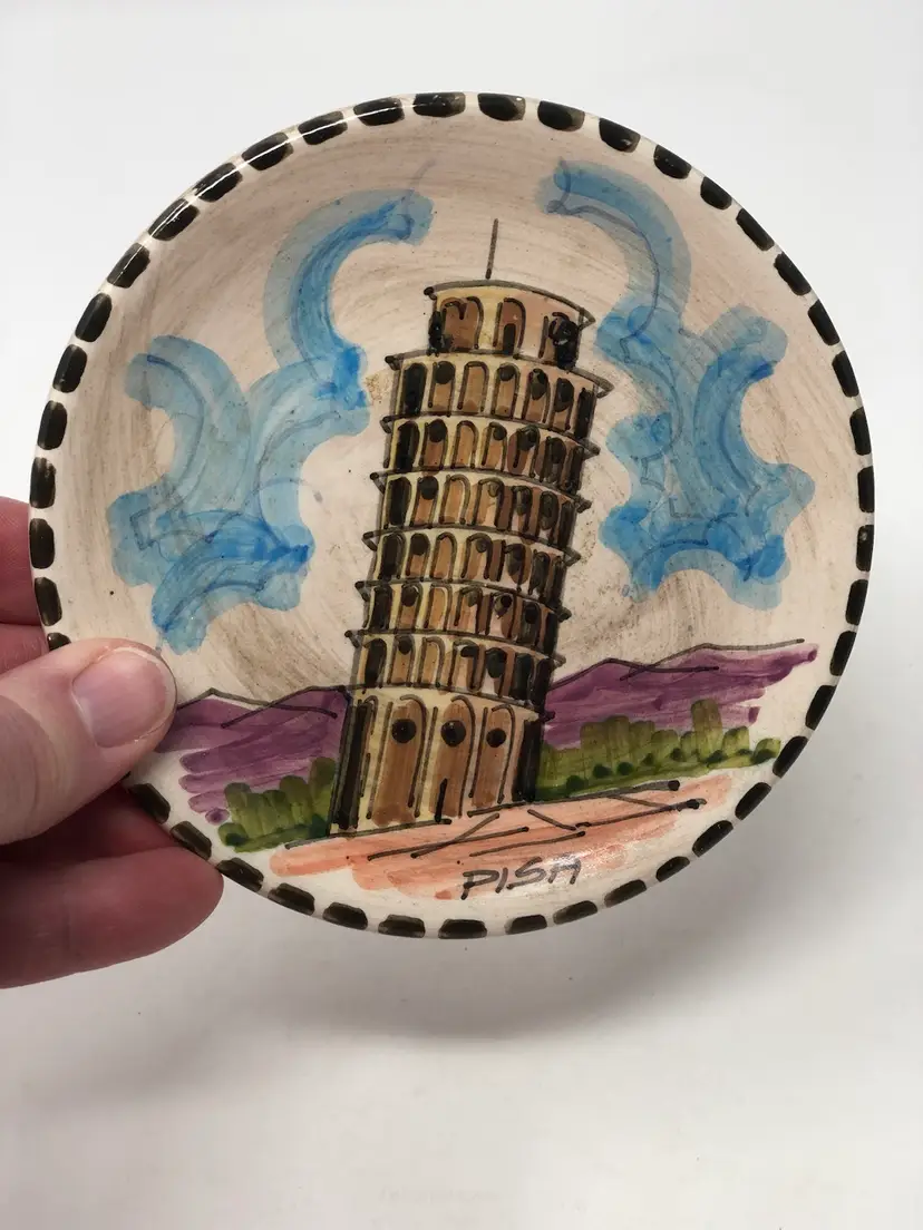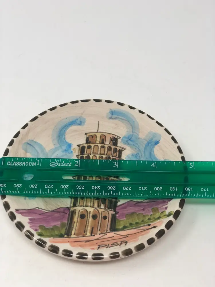 5" across hand painted plate depicting the tower at Pisa with holes and a thin wire for hanging display. Excellent condition, marked C. Albani Rep. S. Marino