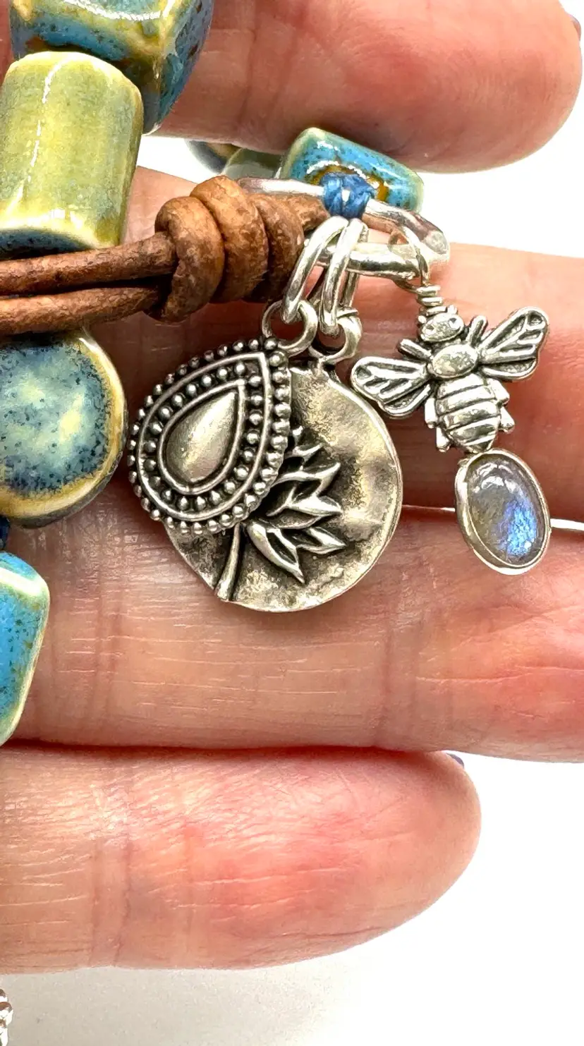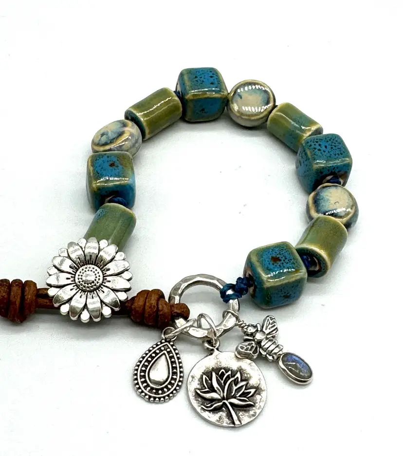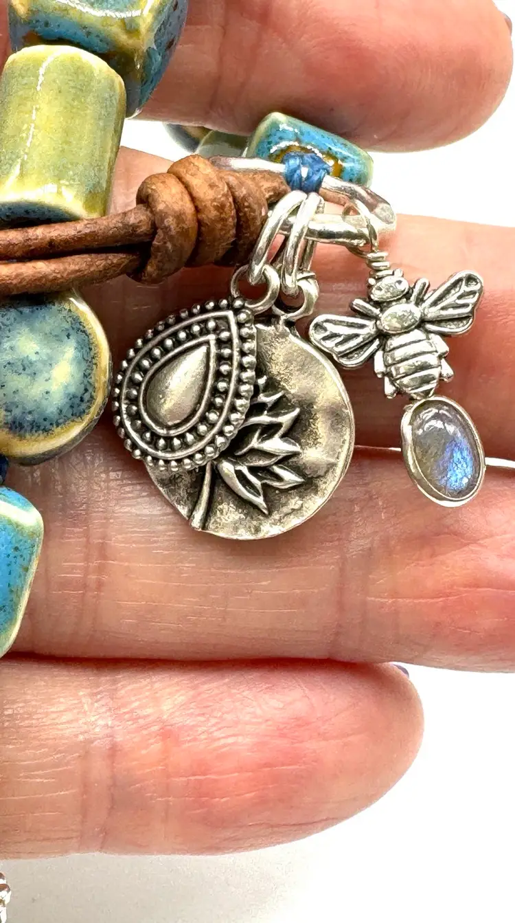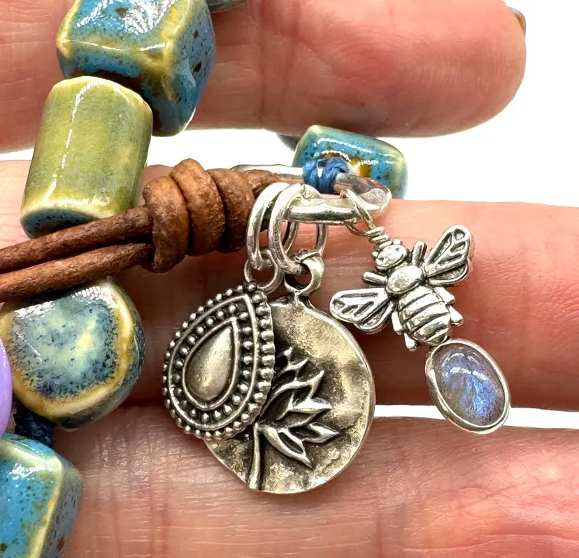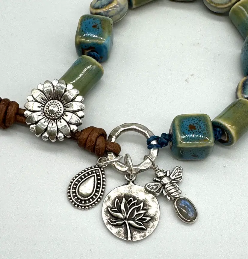 Beautiful hand made ceramic bead bracelet made by me in my Seattle studio. This bracelet offers ceramic glazed beads hand knotted combines with three silver tone charms, a lotus tear drop and a bumble bee with a labradorite head pin. The flower button is silver tone too. The bracelet measures approximately 7.25” long.