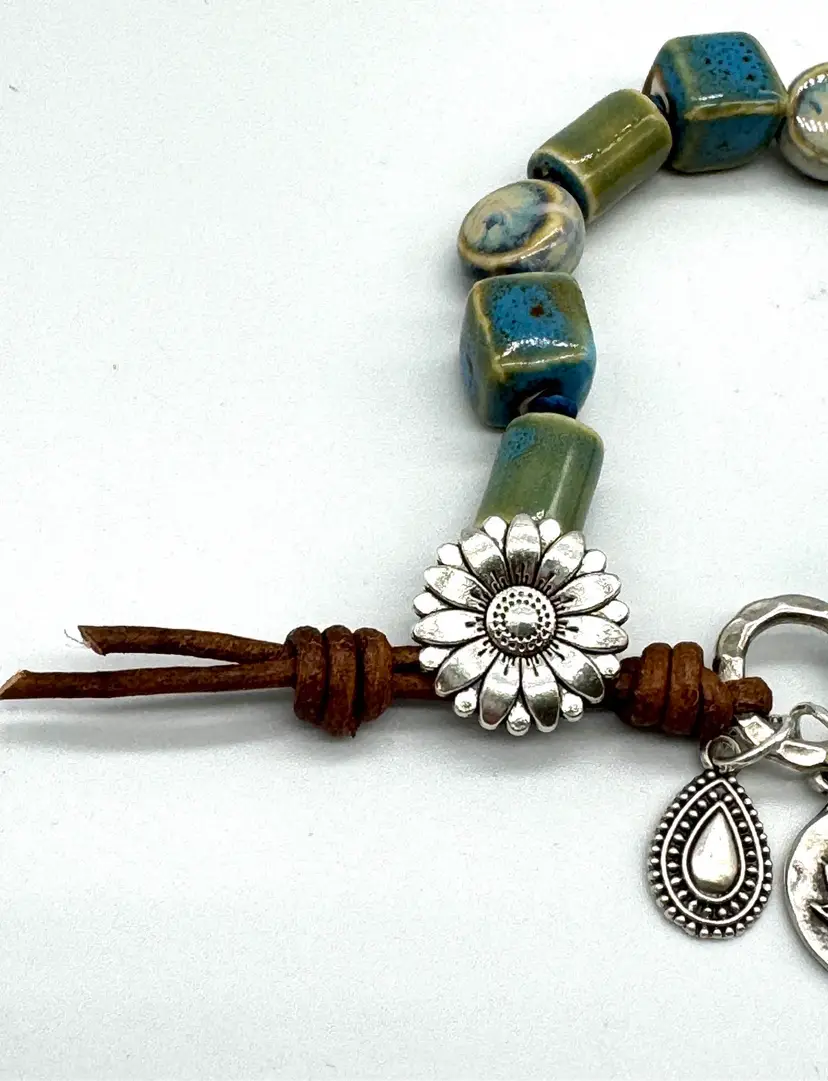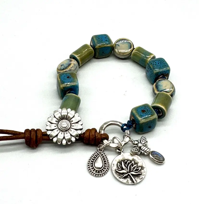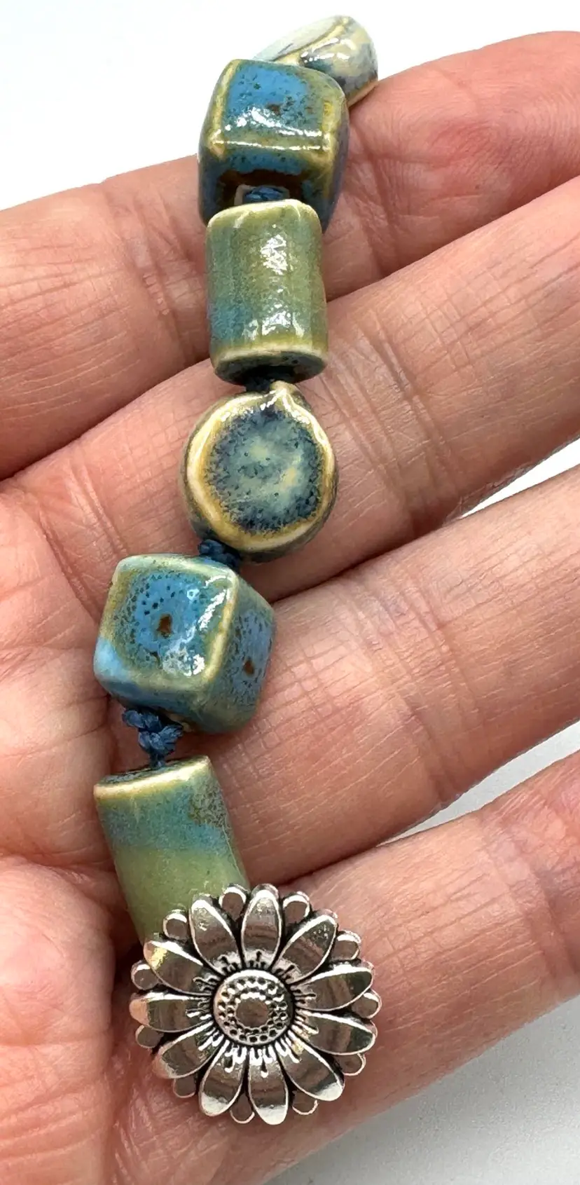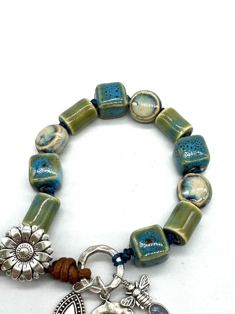 Beautiful hand made ceramic bead bracelet made by me in my Seattle studio. This bracelet offers ceramic glazed beads hand knotted combines with three silver tone charms, a lotus tear drop and a bumble bee with a labradorite head pin. The flower button is silver tone too. The bracelet measures approximately 7.25” long.