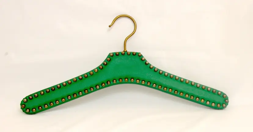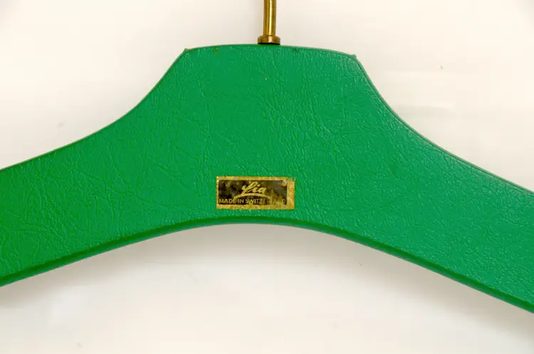This is a wooden hanger covered in green leather with nail head trim. It was made by Lia in Switzerland.