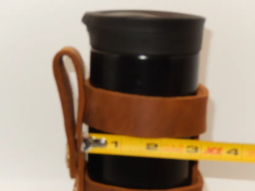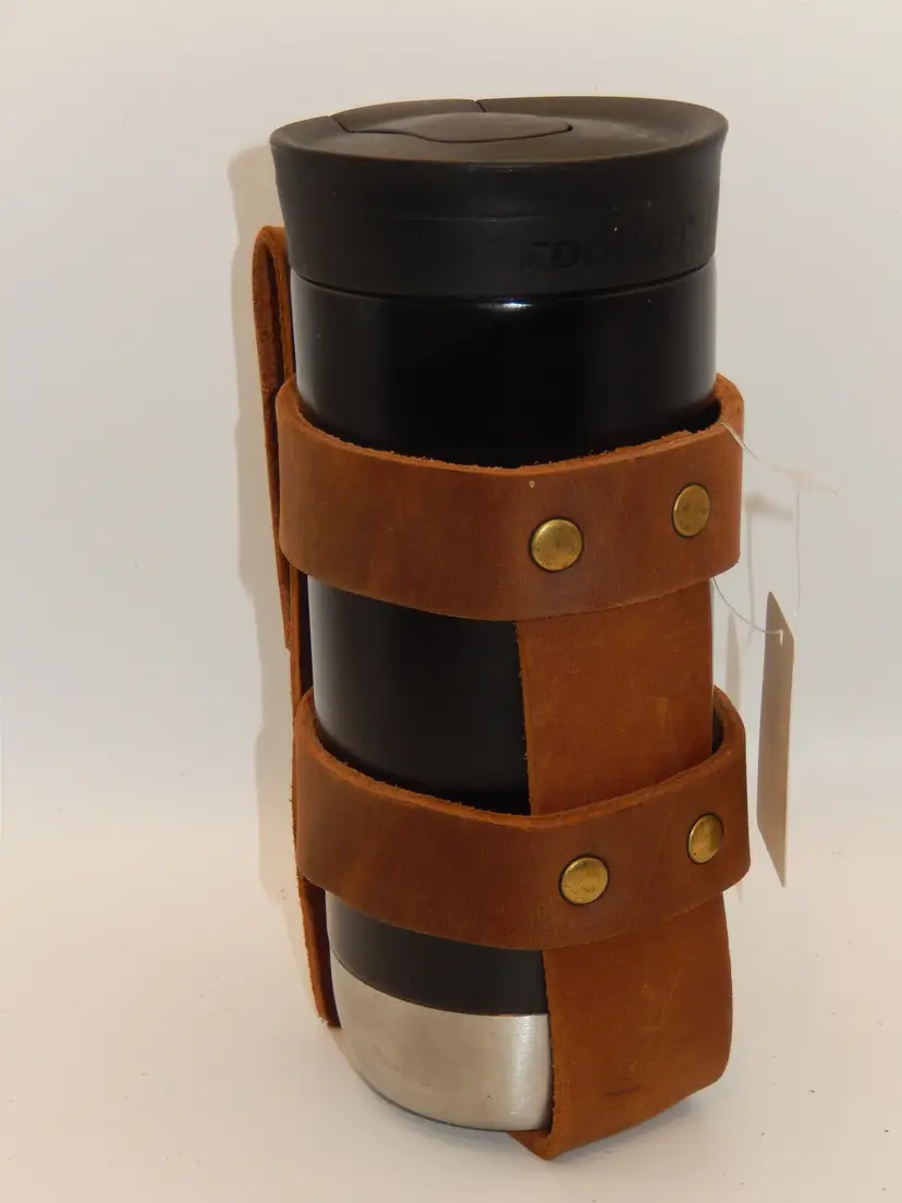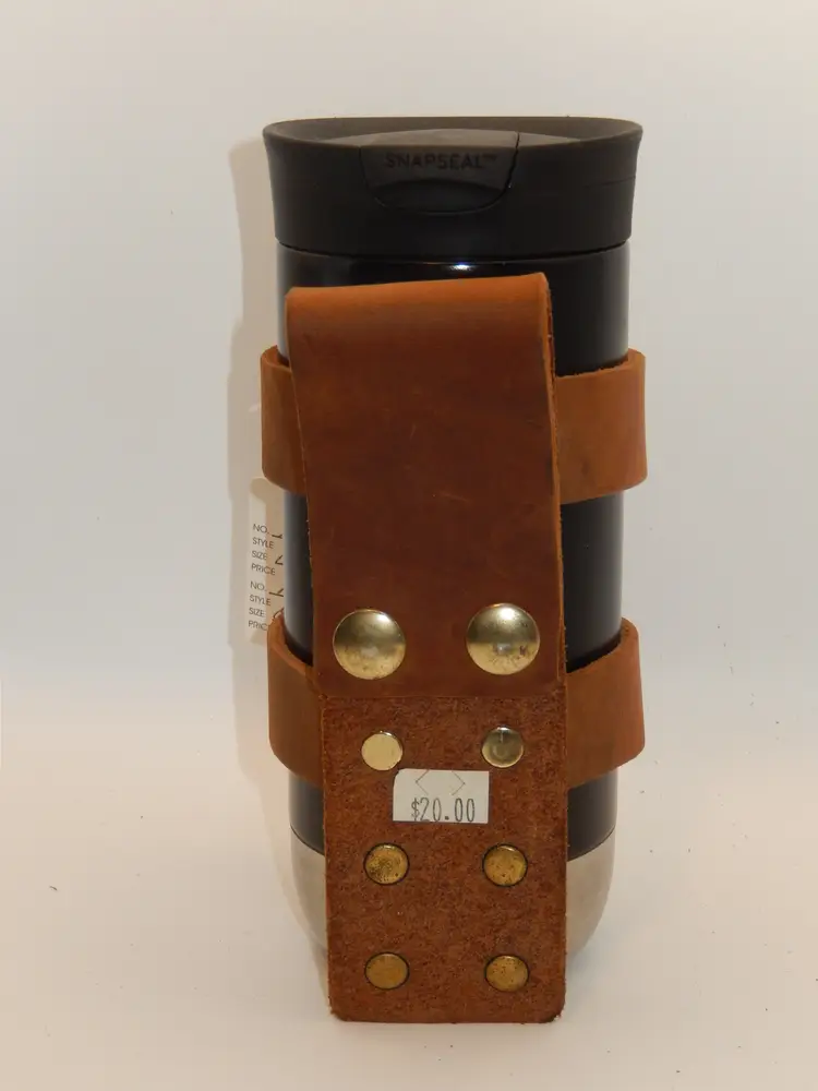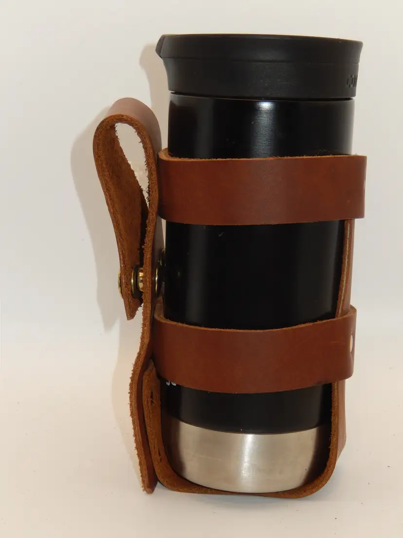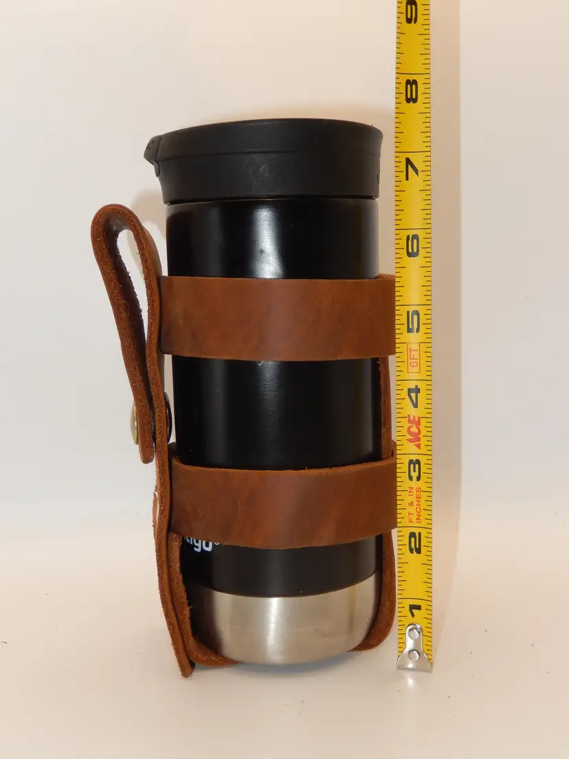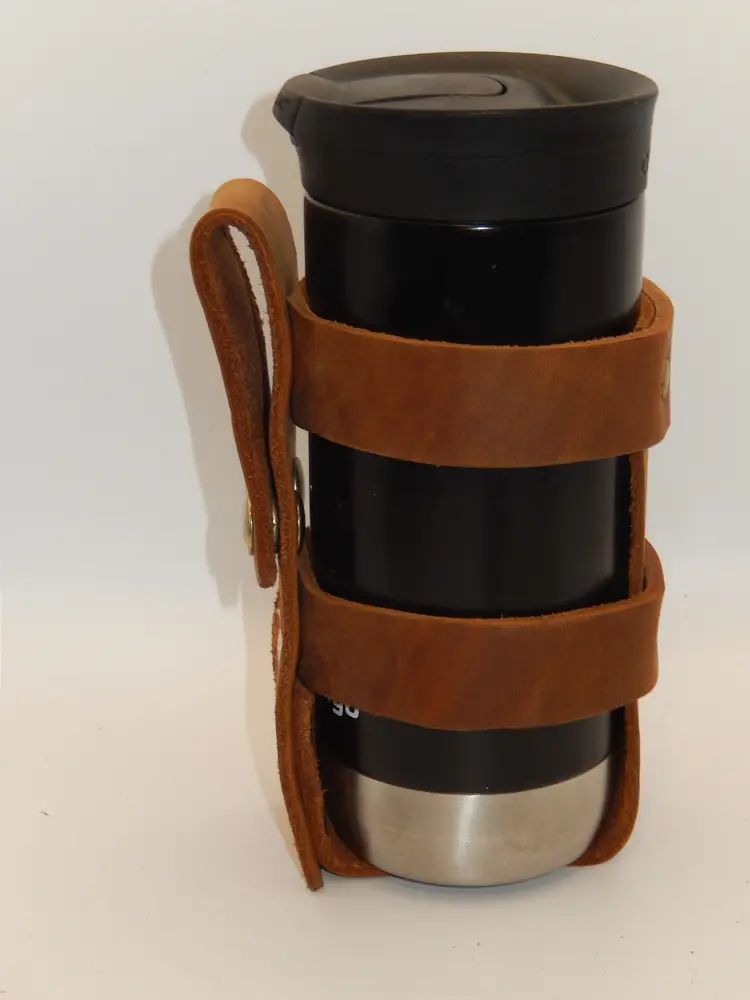 These are designed to slip over your handlebars of a motorcycle, trike, bike, bicycle, or whatever other way you can dream up.... Made of thick Natural Tan color leather, multiple heavy duty rivets securing the leather pieces togeather and 2 heavy duty snaps secure the strap over the handlebars, for years of use. They will hold a water bottle or a typical slender 16 - 20 oz Travel cup. (The wide cups will not fit.