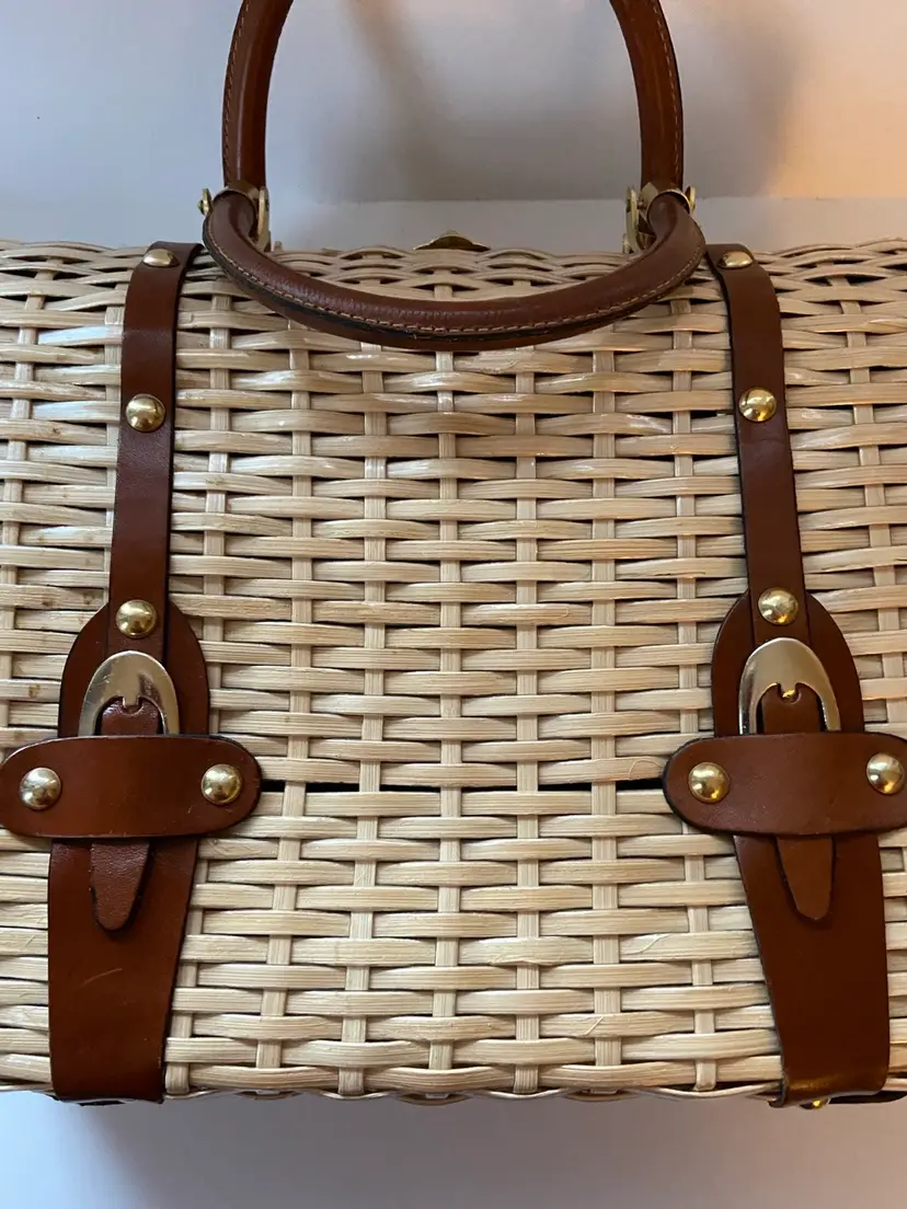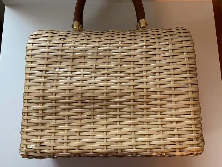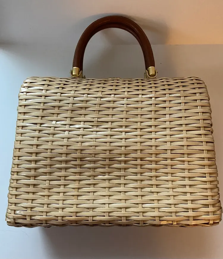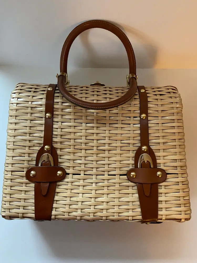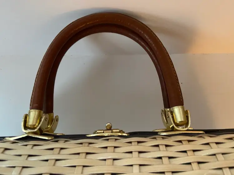 Vintage handbag from the 1960’s , one like your Mother might have owned. Woven coated wicker material with genuine leather , trim, and handles. Leather is also decorated with gold colored grommets and gold hardware. Handbag has a turn-lock closure. Vinyl lining in brown with two compartments. Zip and slip pocket. Measurements are noted above. Handbag is in excellent preowned condition.