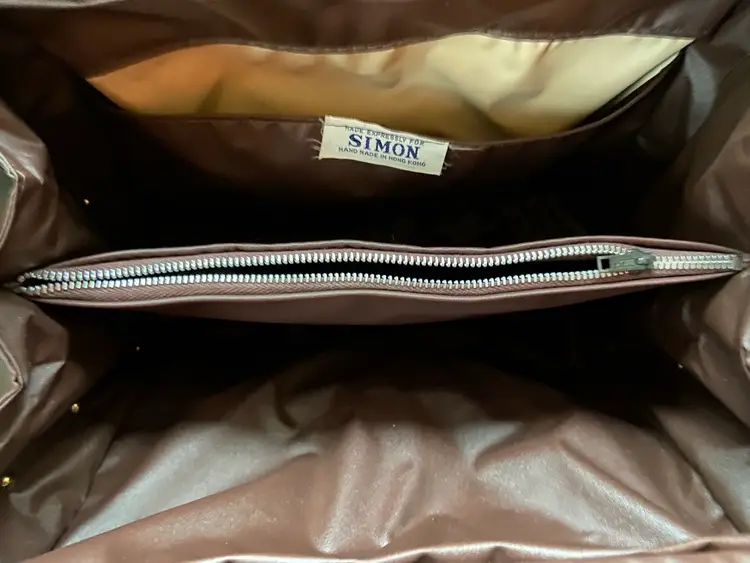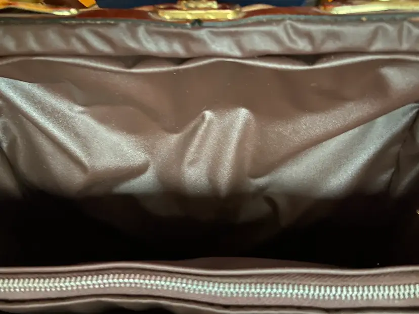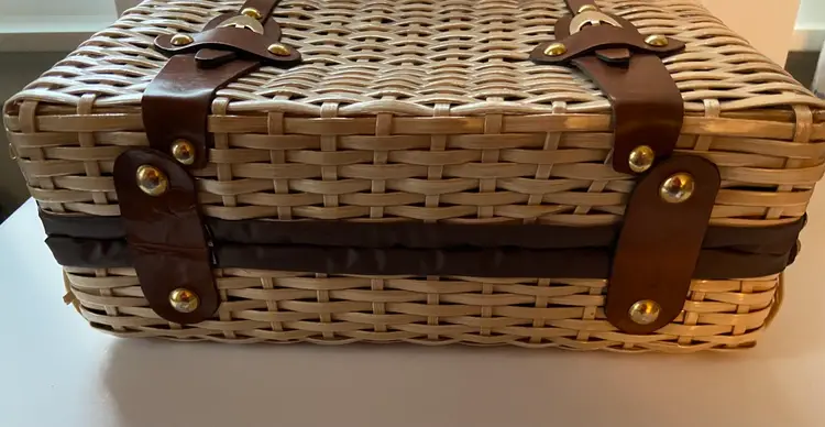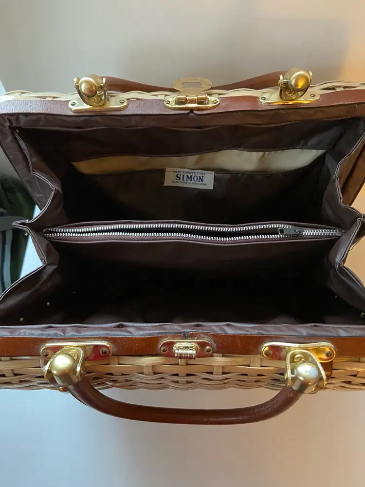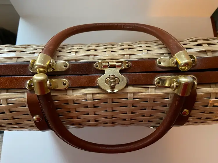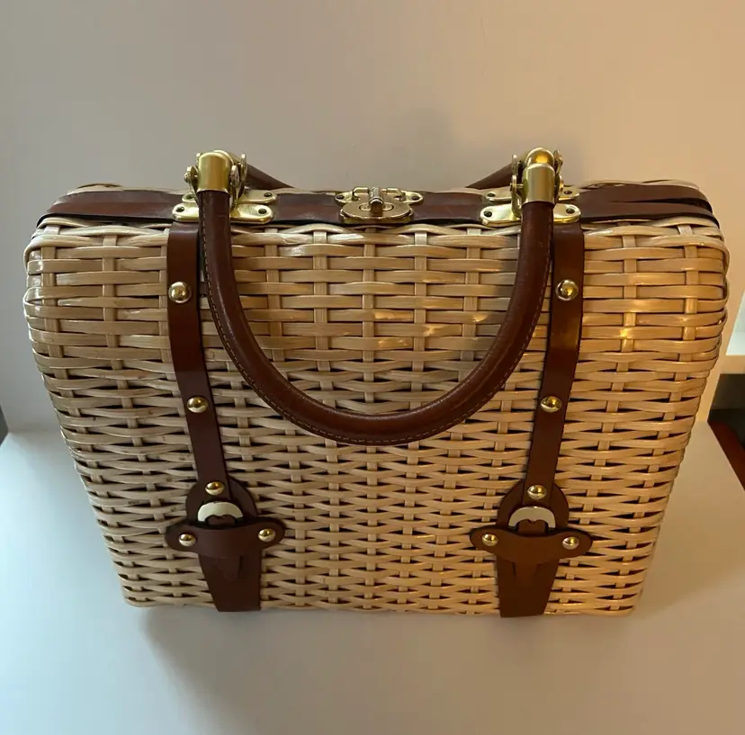 Vintage handbag from the 1960’s , one like your Mother might have owned. Woven coated wicker material with genuine leather , trim, and handles. Leather is also decorated with gold colored grommets and gold hardware. Handbag has a turn-lock closure. Vinyl lining in brown with two compartments. Zip and slip pocket. Measurements are noted above. Handbag is in excellent preowned condition.