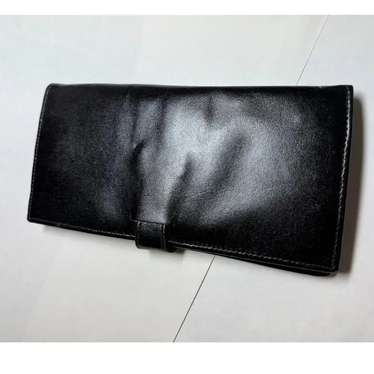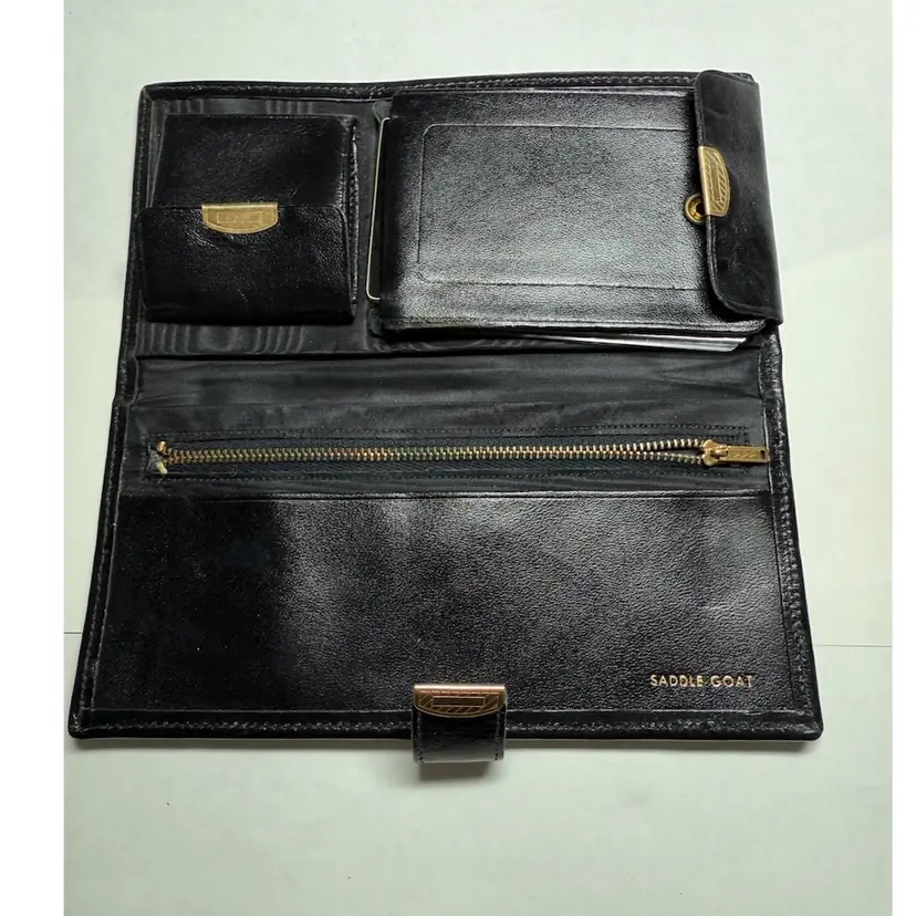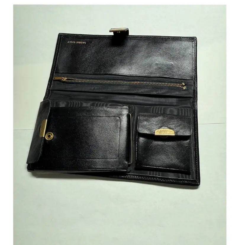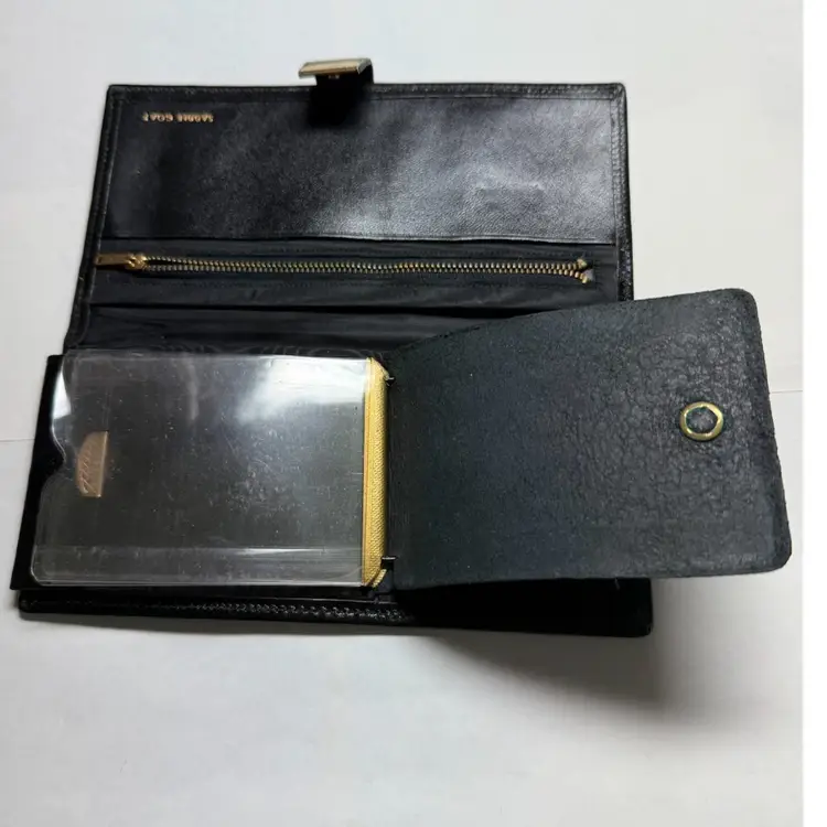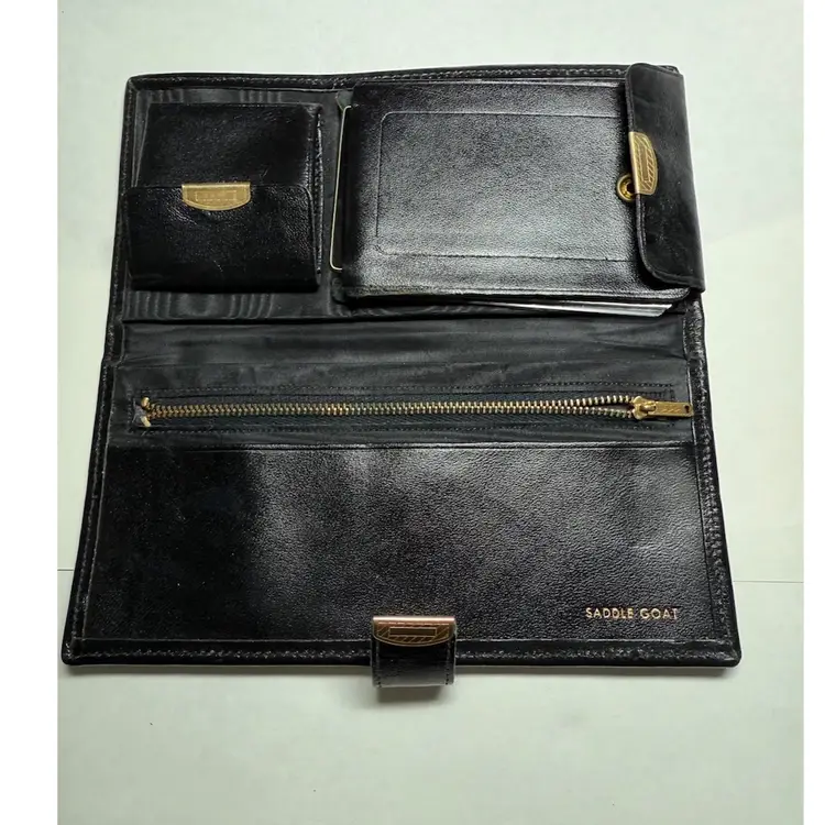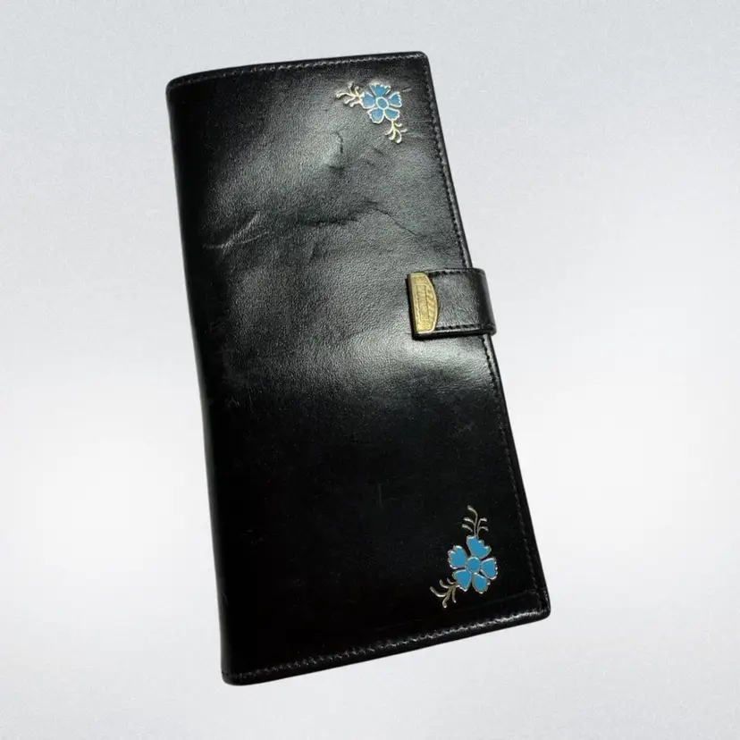 Vintage black “saddle goat” leather ladies wallet. Gold and blue embossed flowers on the cover. Gold hardware. 4 pockets, 1 of which is zippered. Photo holder and coin holder. Relatively flat. Very good condition. 3 ½”x 7” closed ½” profile