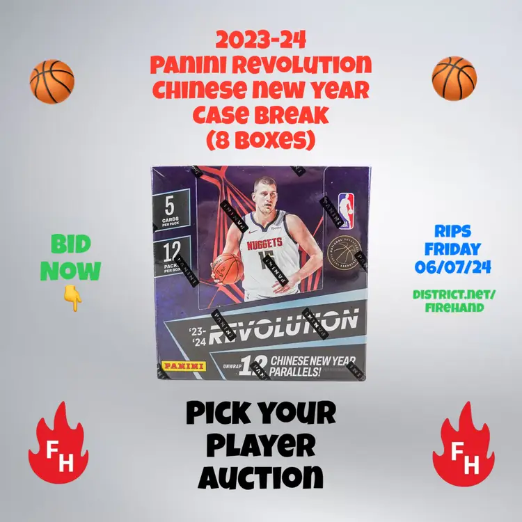 You are bidding on the cards of the player listed in the title in this CASE of 2023-24 Panini Revolution Chinese New Year Basketball Cards (8 Boxes). Auctions end Thursday evening June 6th; Case will be opened LIVE Friday, June 7th, with notifications to go out across the Firehand Cards community when live on District and simulcast to our YouTube channel (https://www.youtube.com/channel/UCETc4FyfADGzg3vTTww-Qew). US Shipping is $5 for your first auction spot won and only $.25 per each additional spot you win! Any spot won where no cards of the player are found in the box will receive a bonus card or pack from Firehand Cards. Any hits pulled (Cut Signatures etc.) of a player who is NOT listed in the auction will be assigned by draw between all participants. Any dual or multi-auto cards featuring multiple players will be randomized live between the spots depicted on the card. NOTE - team names are provided for search purposes only - it could be possible that the player listed now plays for a different team or has a different team on the card, you will still get ALL the cards associated with this player.