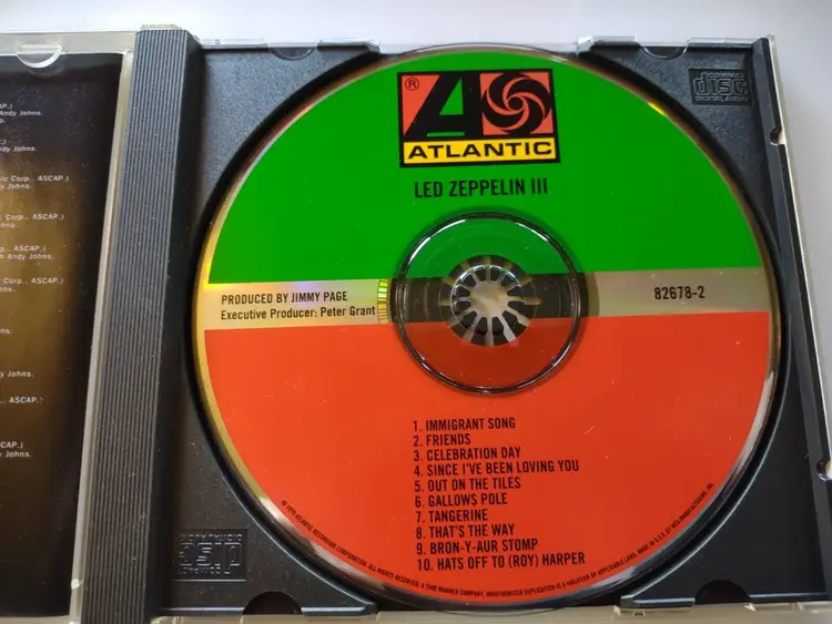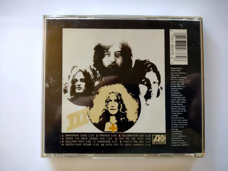 Artist: Led Zeppelin CD Grading: Excellent (EX) Record Label: Atlantic Records Release Title: Led Zeppelin III Case Type: Jewel Case: Standard Custom Bundle: No Color: Silver Case Condition: Very Good (VG) Inlay Condition: Very Good Plus (VG+) Modified Item: No Edition: Unknown Type: Album Format: CD Language: English Release Year: Unknown Style: Blues Rock, Classic Rock, Hard Rock Features: Original Inner Sleeve Genre: Rock Country/Region of Manufacture: United States